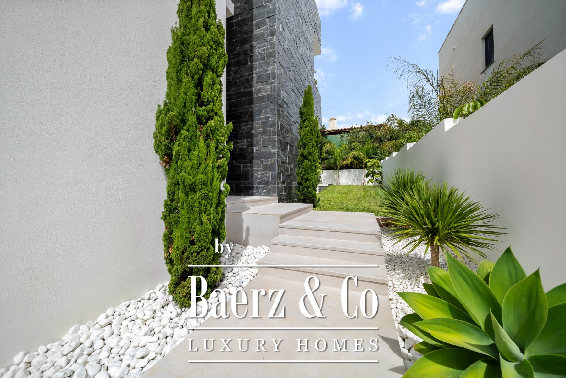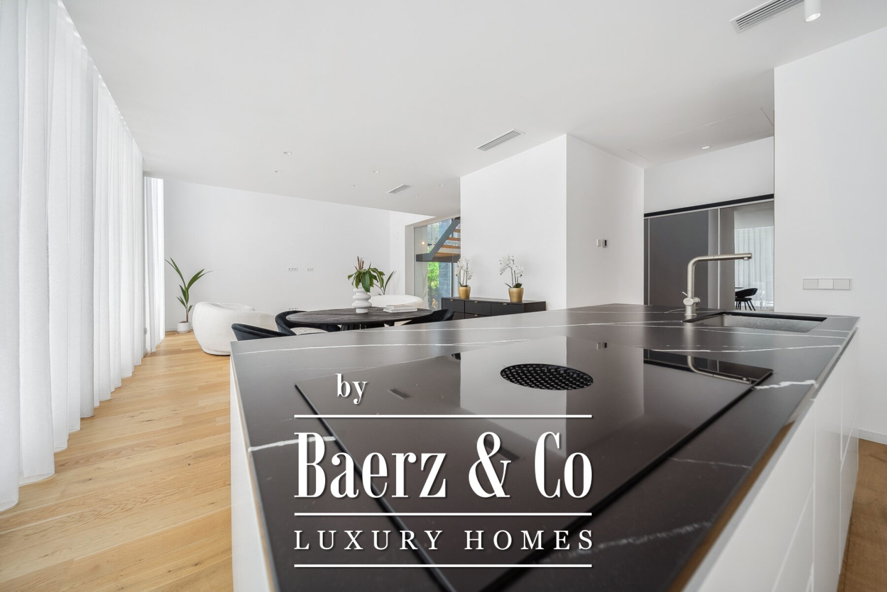 The main level is an open expanse where living and dining integrate effortlessly with a custom kitchen, equipped with premium appliances for understated sophistication. Terraces flow naturally from the interior, offering multiple settings for al fresco dining or quiet retreat. The garden’s swimming pool forms a tranquil centerpiece, surrounded by crisp modern finishes.