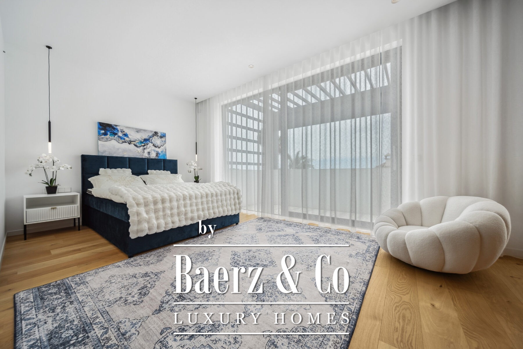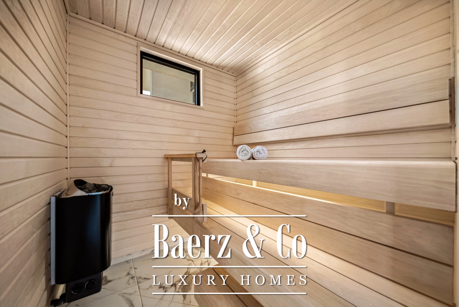 Features such as underfloor heating, individually regulated climate systems, and a private lift connect the home's three levels, culminating in a solarium that delivers panoramic views of the sea and surrounding mountains. A garage accommodates three cars, while additional amenities include a sauna and dedicated BBQ area.