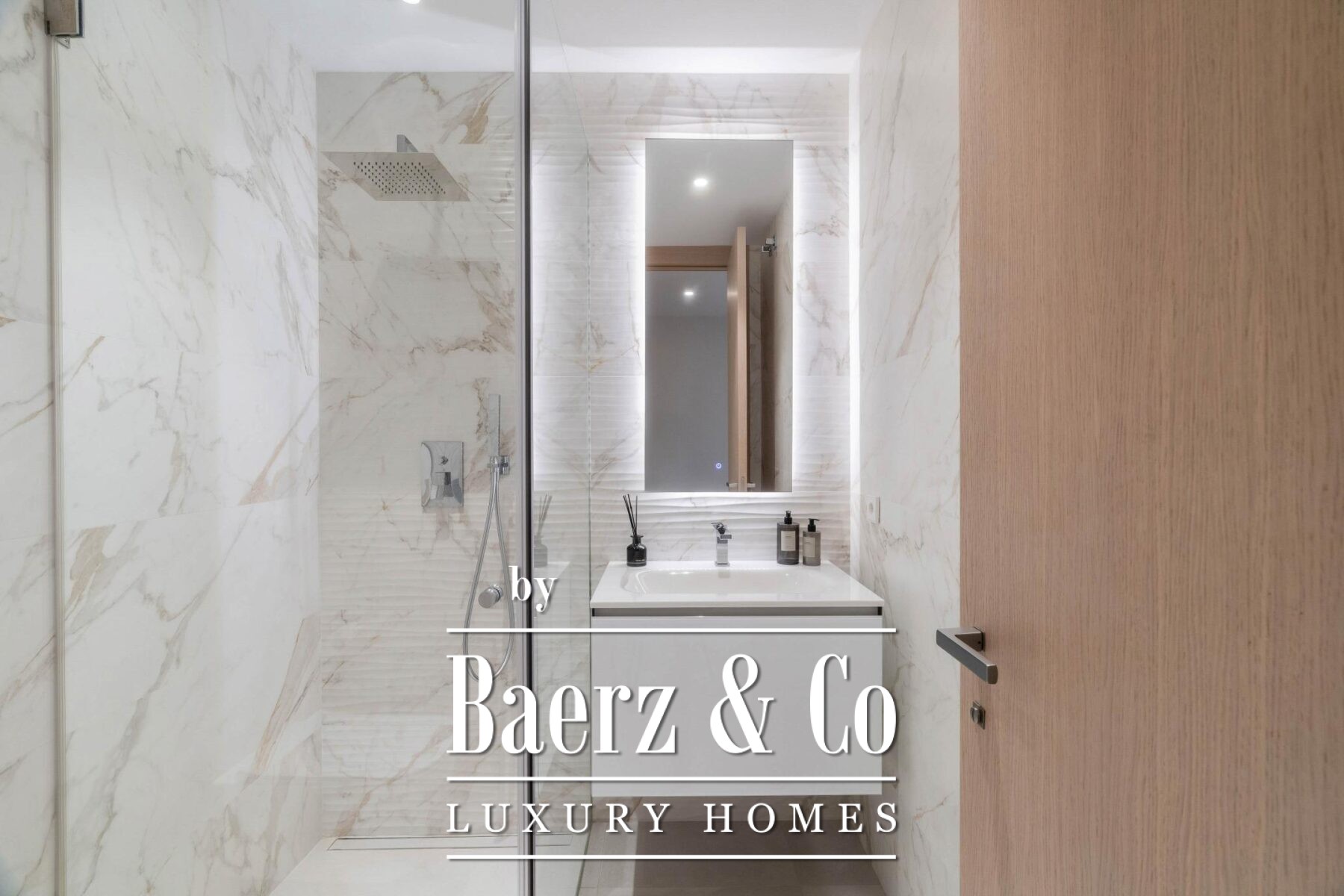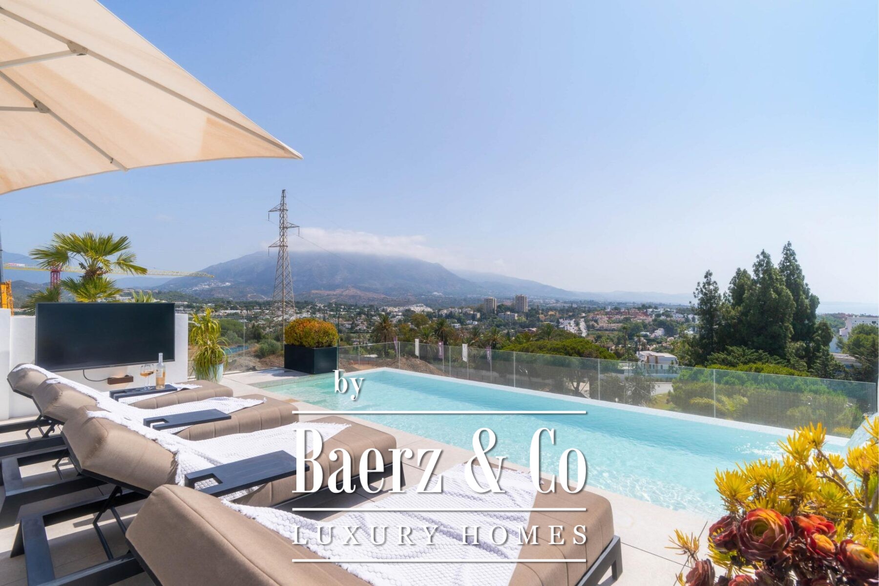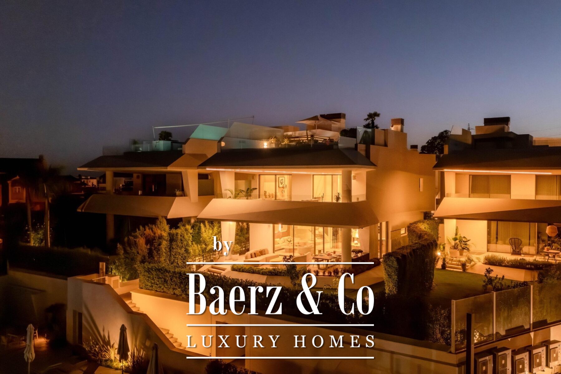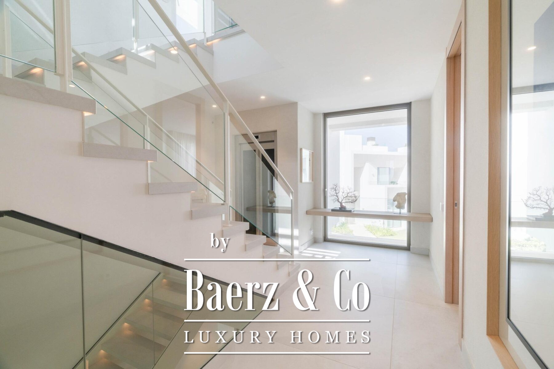 Generous living areas connect to a covered terrace designed for seamless indoor-outdoor living. The custom rooftop solarium, complete with a private plunge pool, opens up panoramic views over the Golf Valley and the iconic La Concha mountain. A private elevator links each of the four levels, allowing effortless access throughout, while the fully equipped Siematic kitchen invites convivial gatherings.