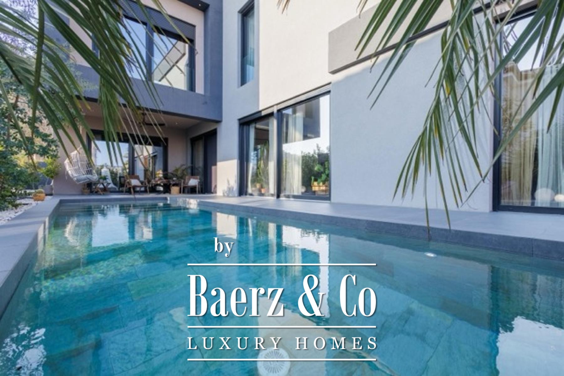 On the ground floor, an expansive living room anchors the home, featuring bespoke furnishings sourced from Germany, Italy, and the Czech Republic. The interplay of soft color palettes, a statement fireplace, and generous glazing blurs indoor and outdoor life, opening to the private pool and surrounding terrace. Adjoining rooms include a thoughtfully equipped kitchen, a guest bedroom, a toilet, additional service spaces, and direct garden access.