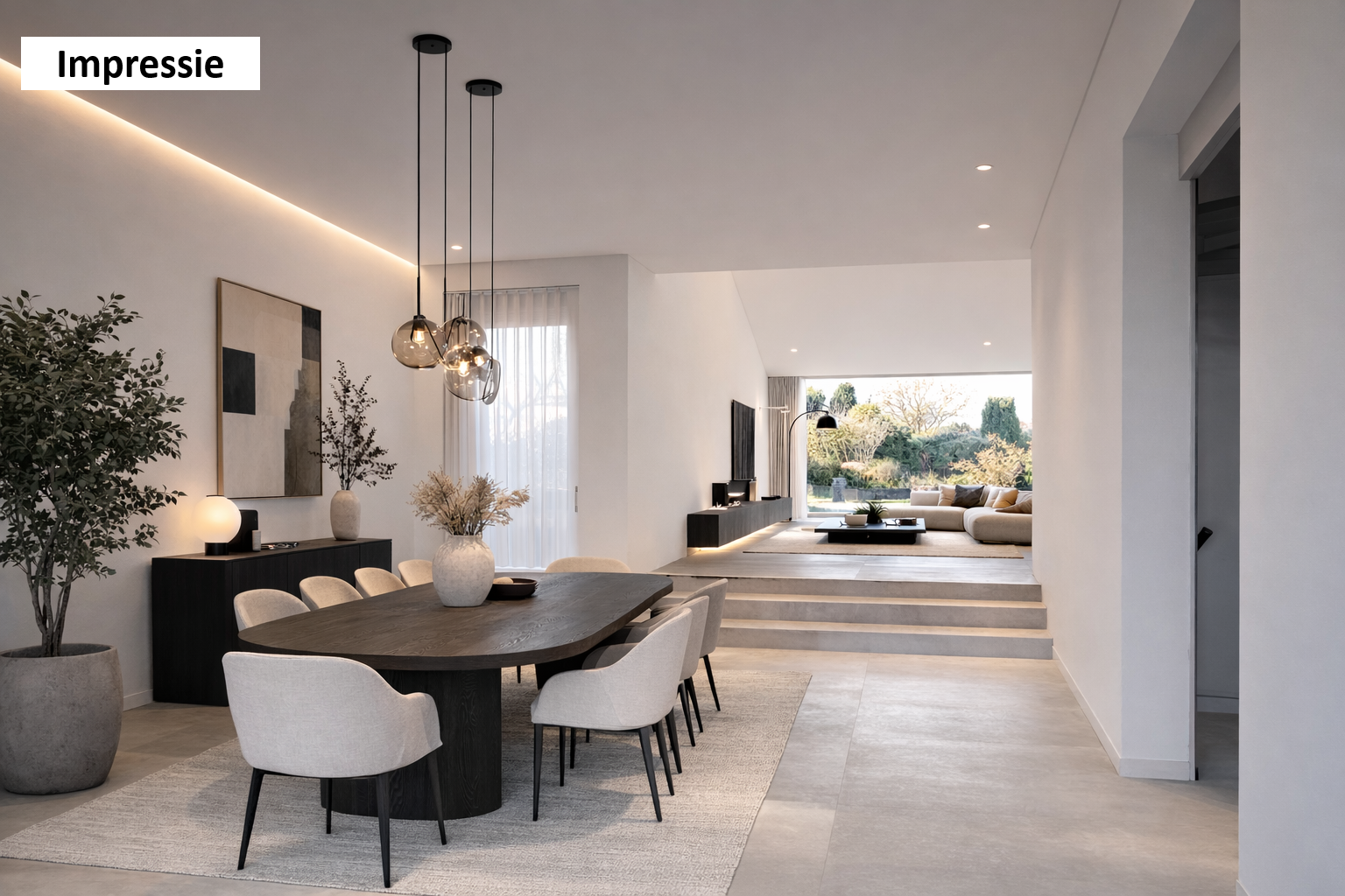Spacious entrance/hallway with access to the living area, toilet, cloakroom, office space, meter cupboard, and kitchen. The spacious living room of approx. 42m² has an attractive loft. There is a beautiful view at the front and optimal garden contact at the rear through large windows and sliding doors. The dining room (approx. 9m²) can also be accessed from the living room and also has a garden view. The kitchen area (approx. 11m²) is equipped with U-shaped cabinets and various built-in appliances.