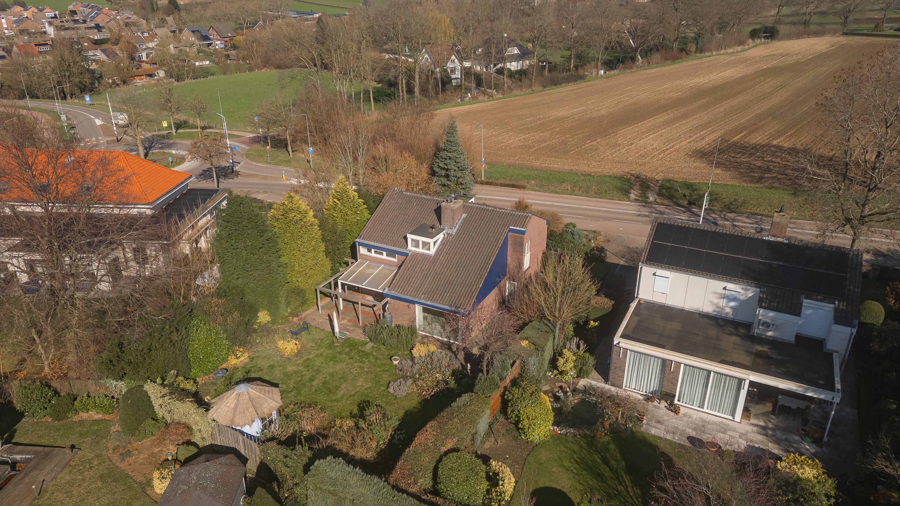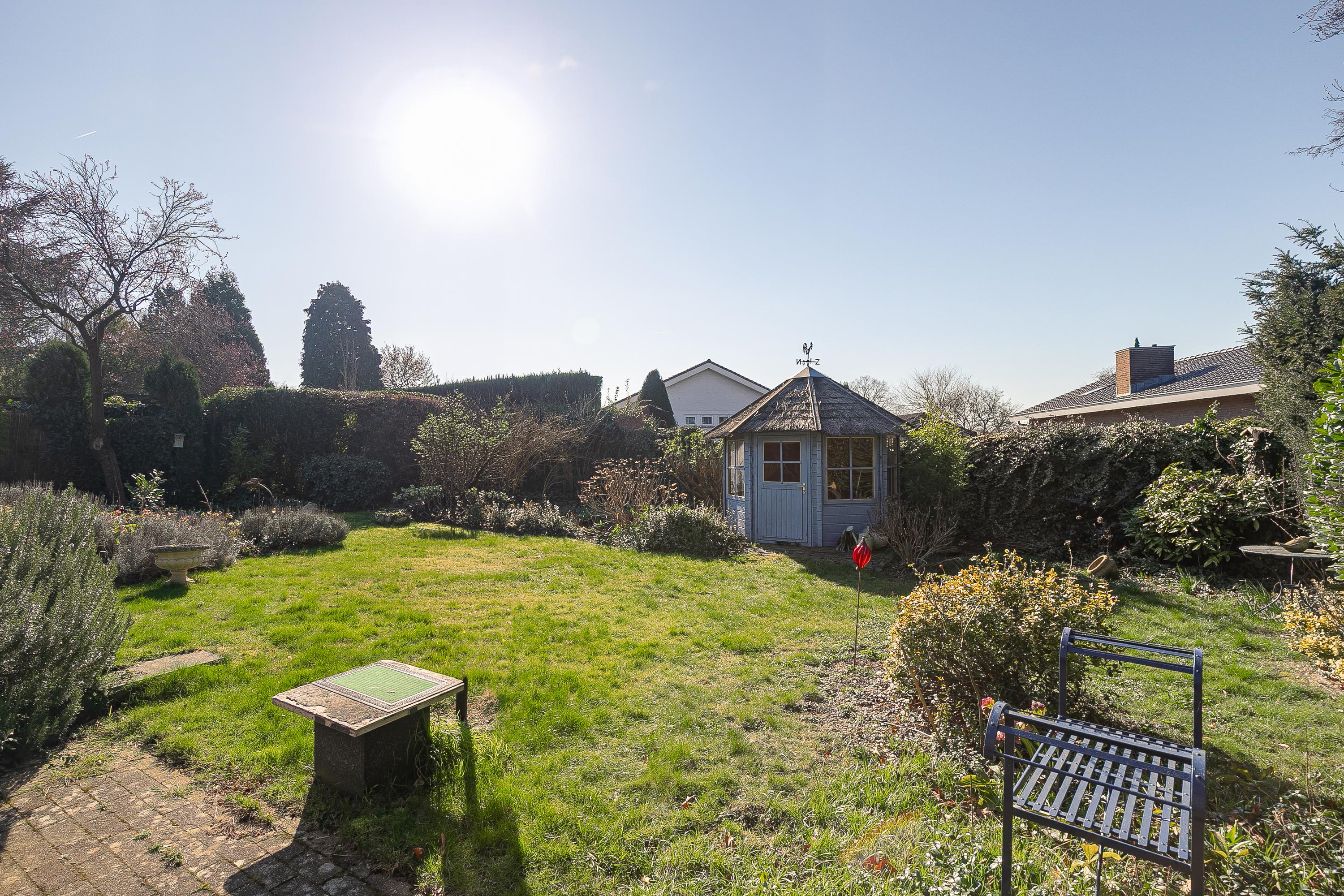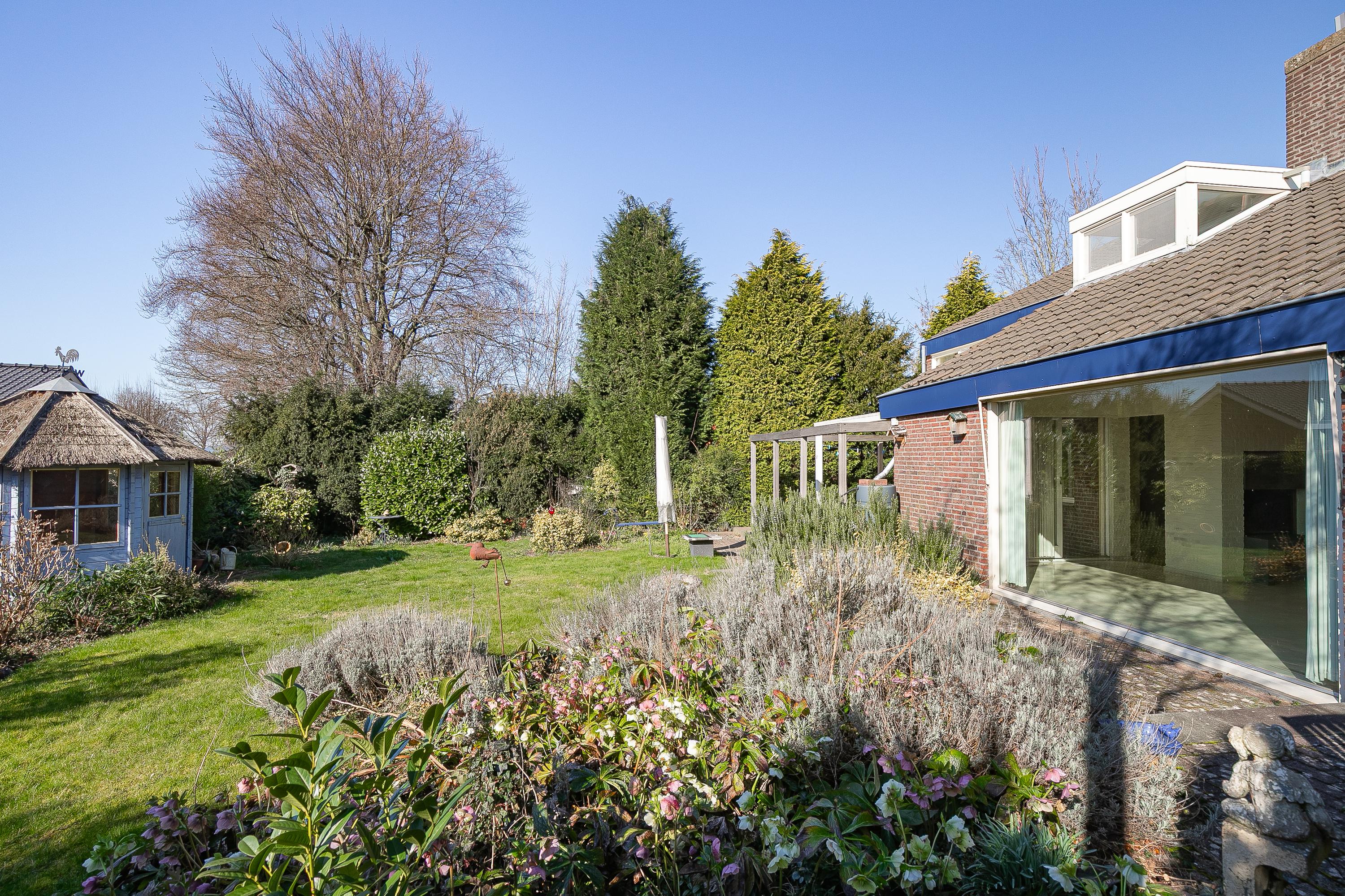 The house is centrally located on the plot, resulting in spacious outdoor areas at both the front and rear. The sunny backyard is private and offers several terraces/seating areas with canopies, a lovely lawn, various mature plants, a practical garden shed, and a double back entrance. The front yard with spacious driveway offers panoramic views of the fields.