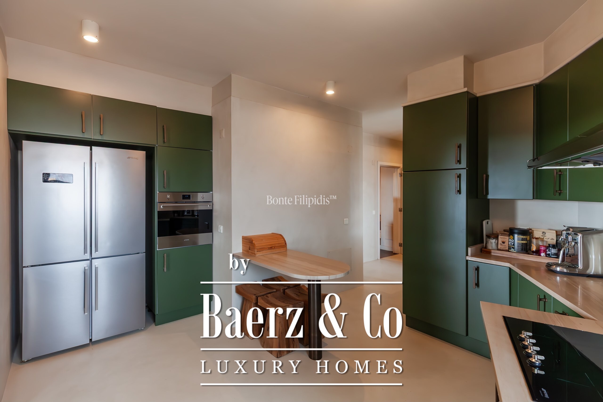 Wide windows in the living and dining room invite serene river views and lead to a spacious balcony, creating a seamless connection between interior and exterior space. A fireplace anchors the room, offering warmth and a gathering point during Lisbon’s cooler evenings. The kitchen is fully equipped with contemporary appliances and an integrated laundry, delivering both function and discretion.