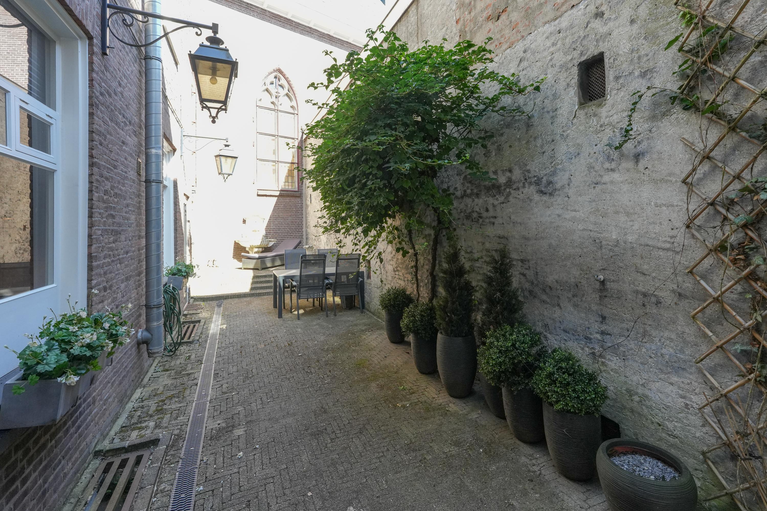 Naast een royale voortuin beschikt de woning over een balkon, loggia, dakterras én een stadstuin met veel privacy die grenst aan een voormalige kerk. De woning heeft vier woonlagen en elke verdieping is voorzien van een keuken, sanitair en een buitenruimte.