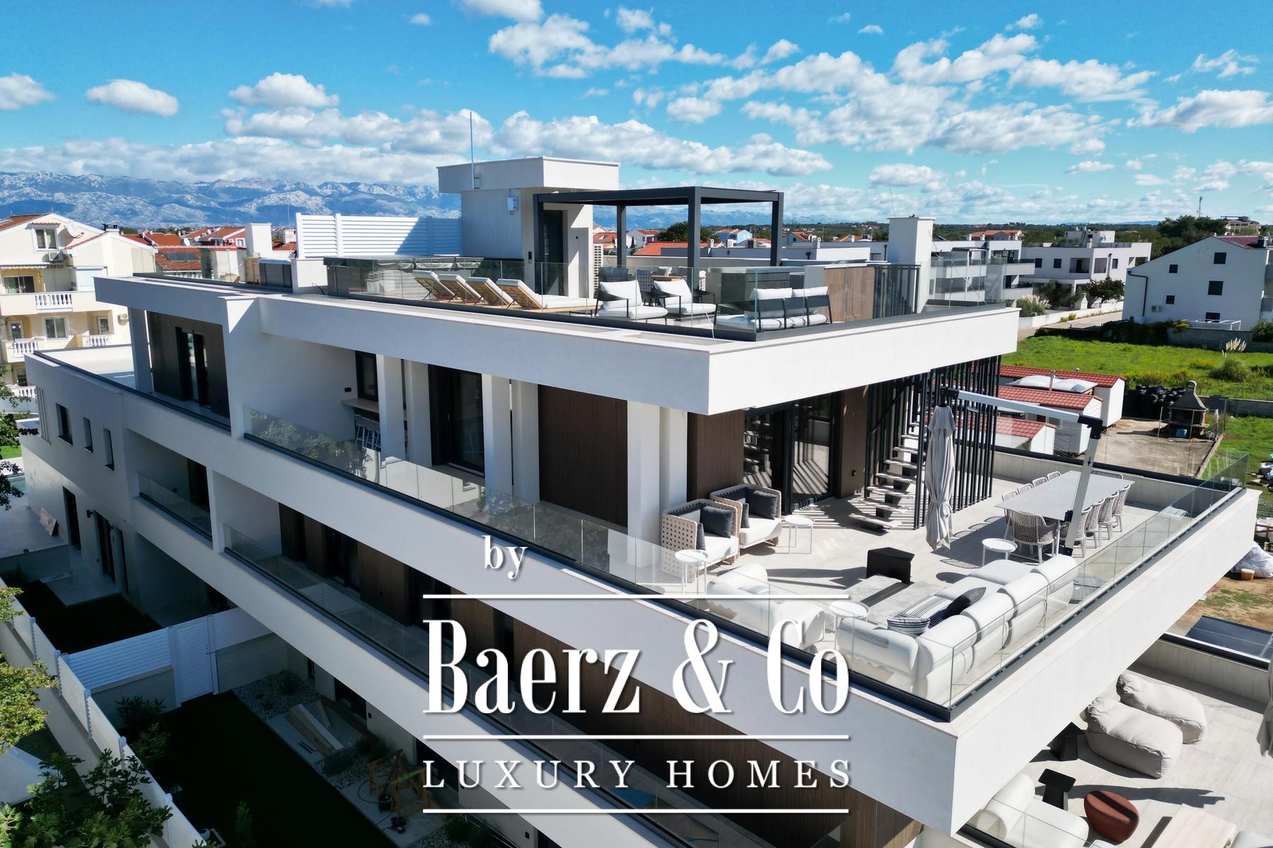 Zadar, Zaton, just fifty meters from the azure Adriatic Sea, presents this exceptional penthouse - a masterpiece of contemporary architecture and design in one of the most exclusive locations. With a total area of an impressive 231.84 m², enriched with spacious terraces and a private garage, this residence offers an unparalleled level of comfort and luxurious living.When you step into this penthouse, you will be greeted by a spacious living room illuminated by natural light through large glass walls that open to the sea and terrace, creating a seamless transition between indoor and outdoor space. Discreet luxury is visible in every detail: a steam fireplace with changing flame colors, a top-notch Sonos sound system and ambient lighting create an atmosphere of peace and elegance. Handcrafted furniture perfectly complements the refined interior, while carefully selected materials promise top quality and longevity. The kitchen, equipped with state-of-the-art Miele appliances, features an elegant waterfall island with LED lighting and granite countertops - the ideal place for culinary delights and socializing.Three luxurious bedrooms are designed with an emphasis on comfort, style and complete privacy, each with a sea view. The master bedroom offers additional luxury with its own bathroom and built-in wardrobes. All bathrooms are equipped with modern Hansgrohe faucets, walk-in showers, underfloor heating and impeccable finishes, guaranteeing a spa-like experience within your own home. An additional guest toilet, a fully equipped laundry room and a functional storage room ensure maximum practicality in everyday life, making this