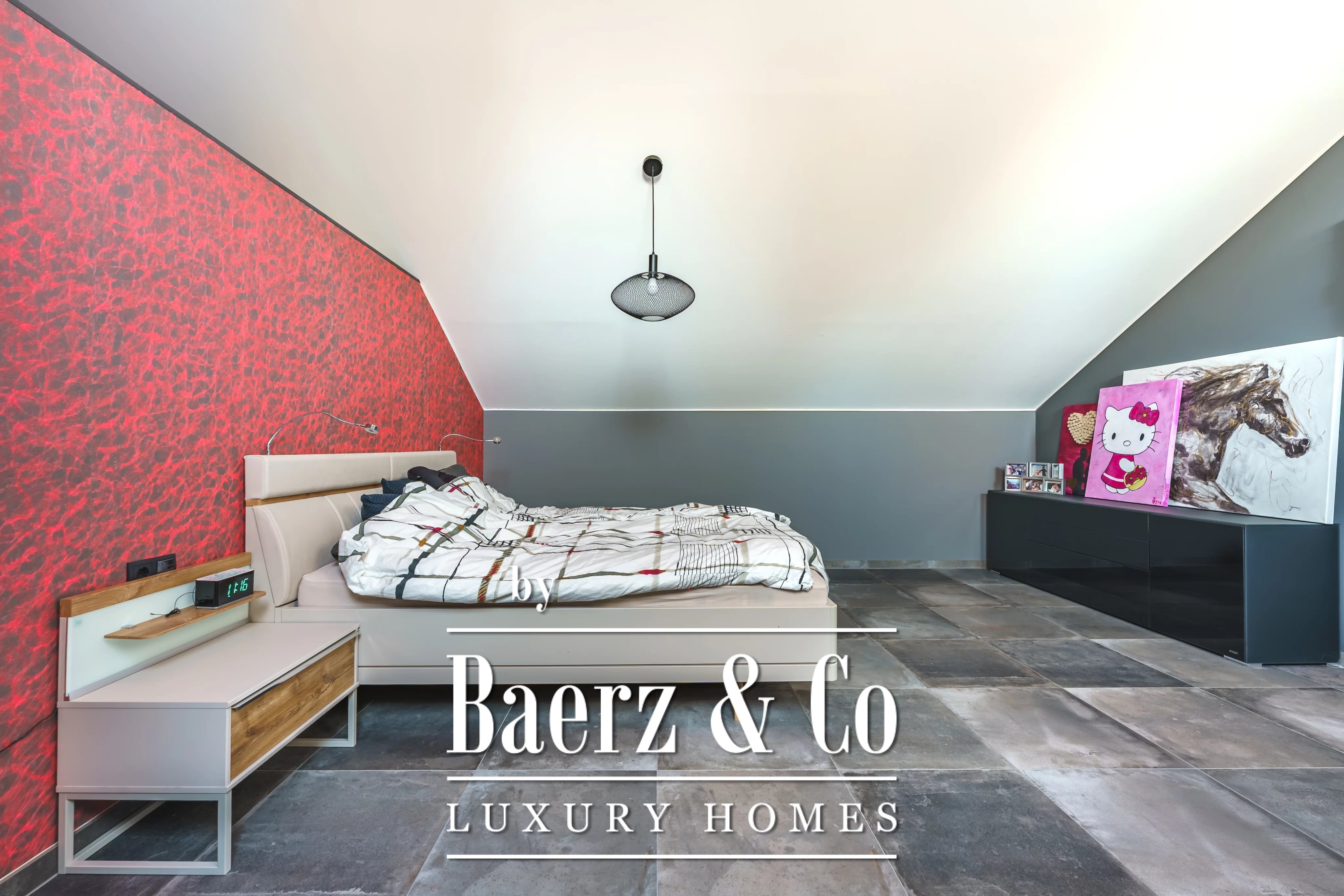 Upstairs, an additional living room creates a private retreat for family gatherings. There are five bedrooms and four bathrooms, including a master suite with a dressing room, private shower room, and a guest bedroom with en-suite. The laundry room is discreet and efficient, supporting daily comfort.