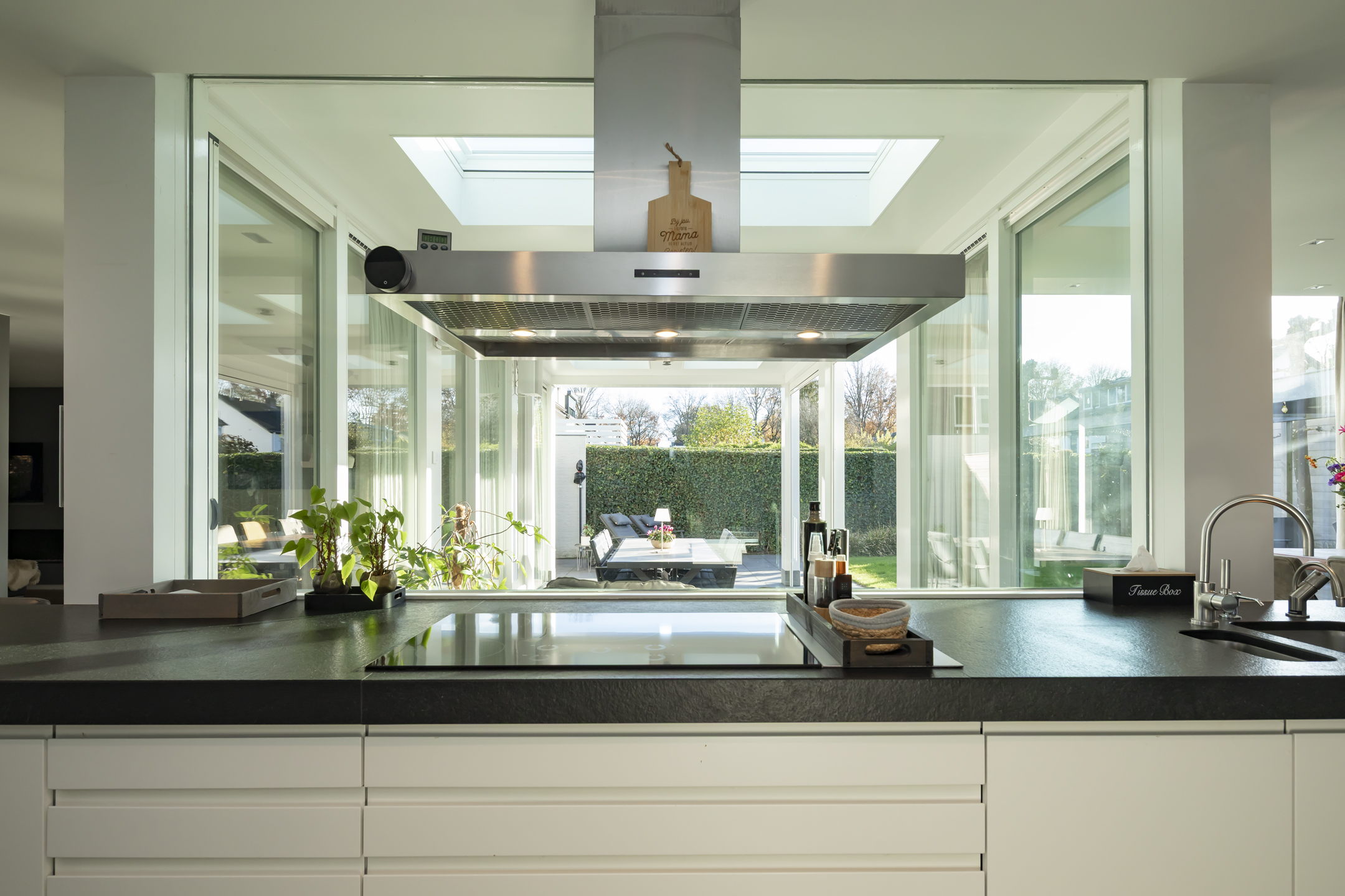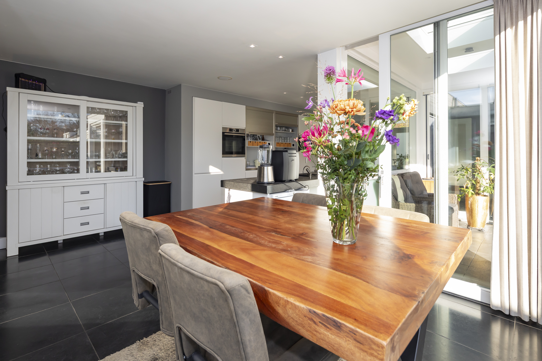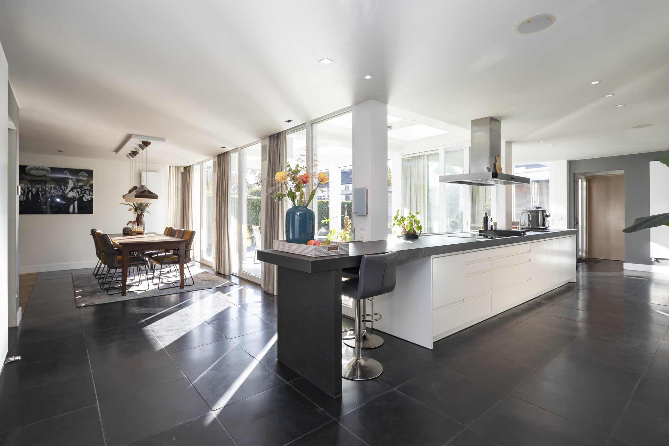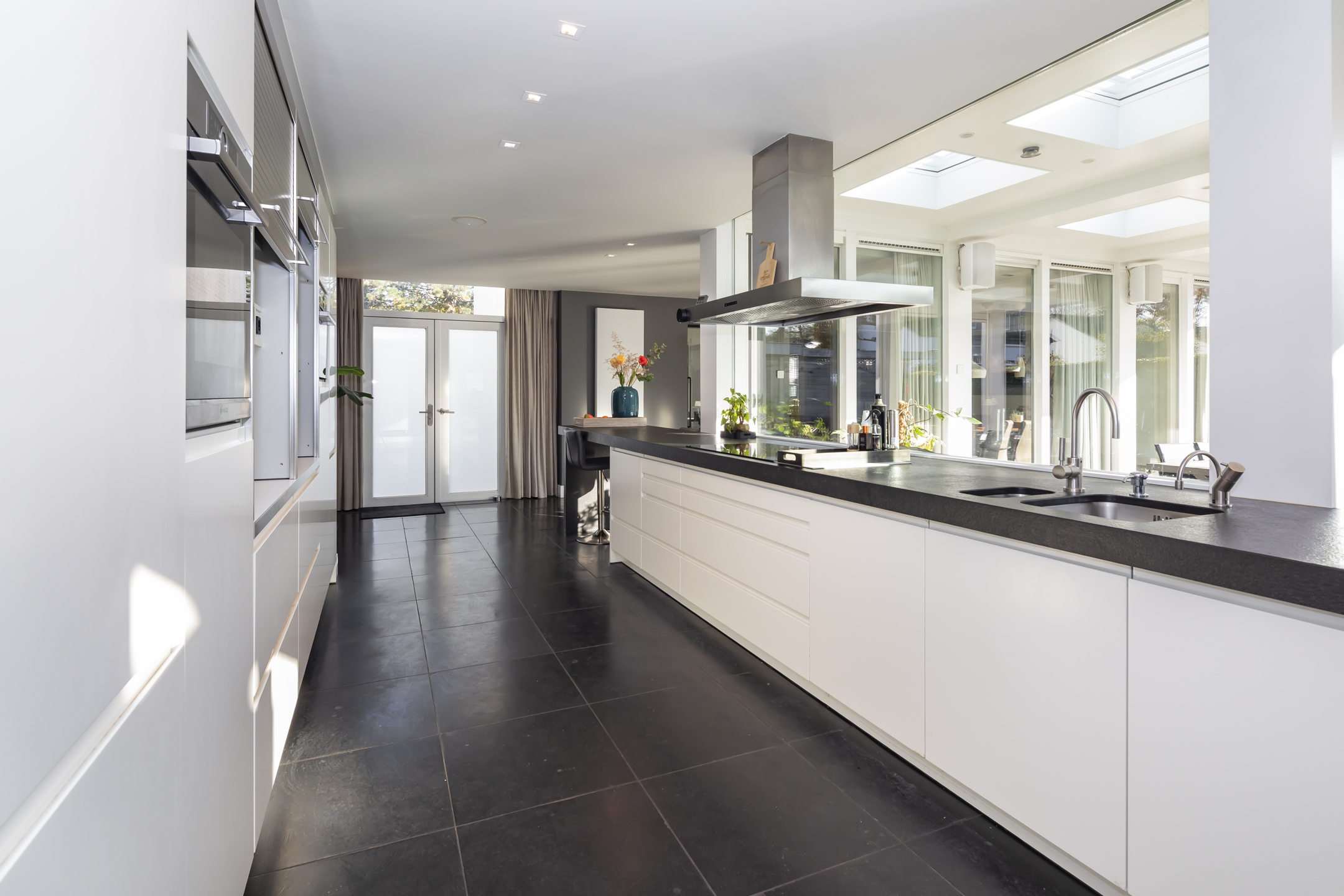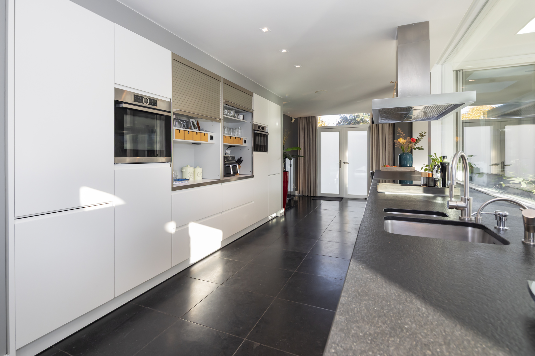 The modern Bulthaup kitchen is equipped with a range of high-quality built-in appliances. There is a Quooker, a dishwasher, a 5-burner induction hob, an extractor hood, an oven, a combination microwave/convection oven and a built-in refrigerator with freezer drawers.
