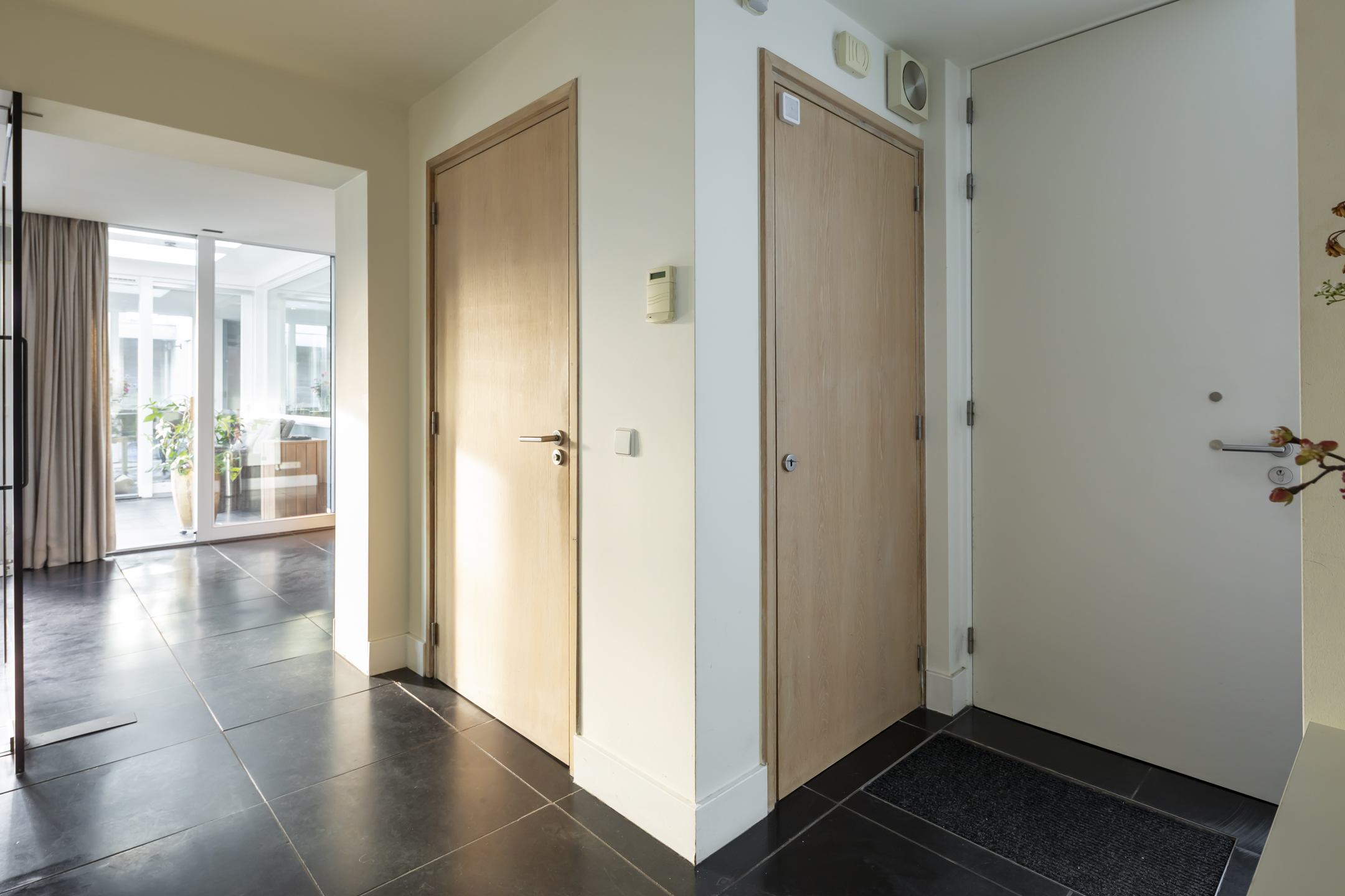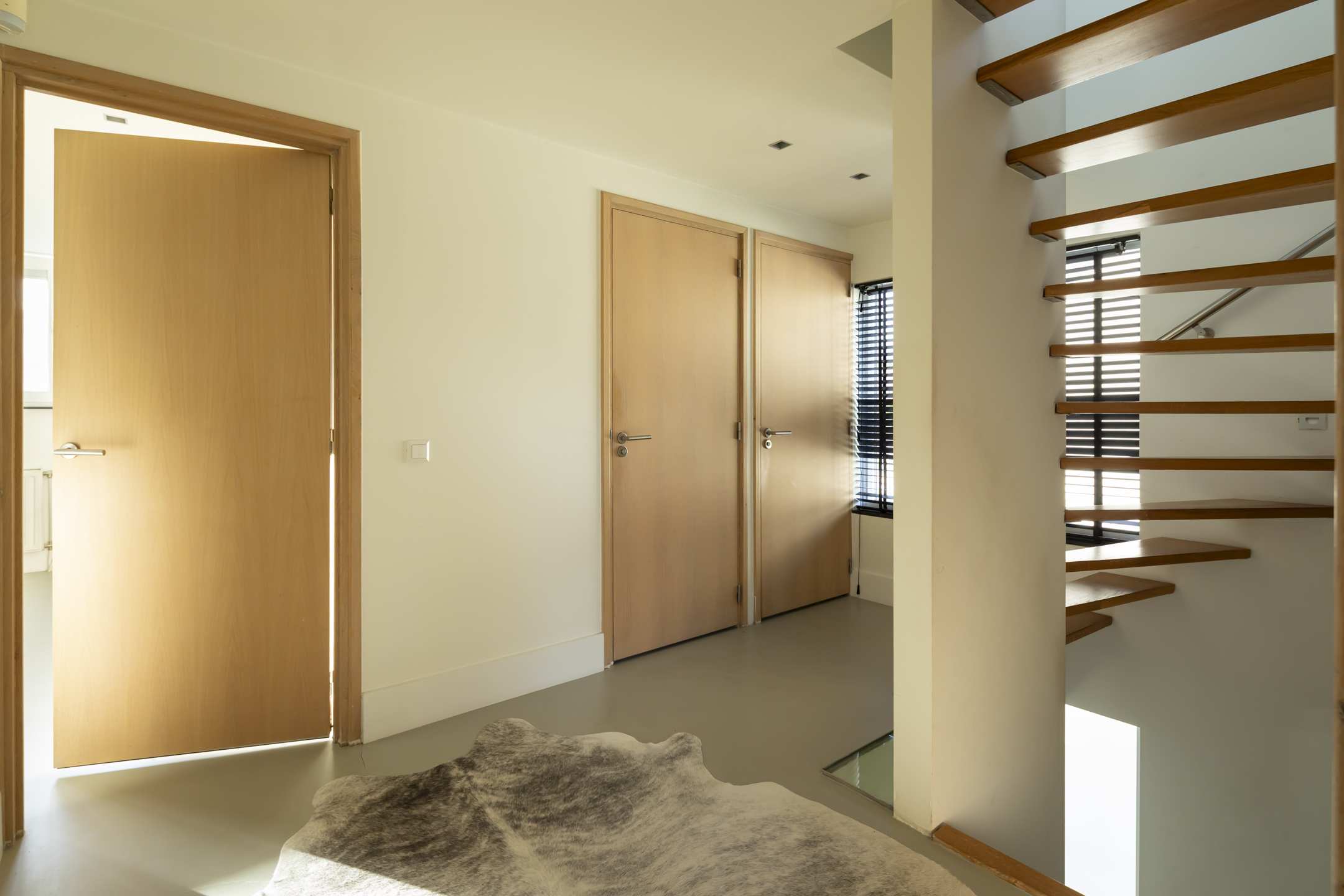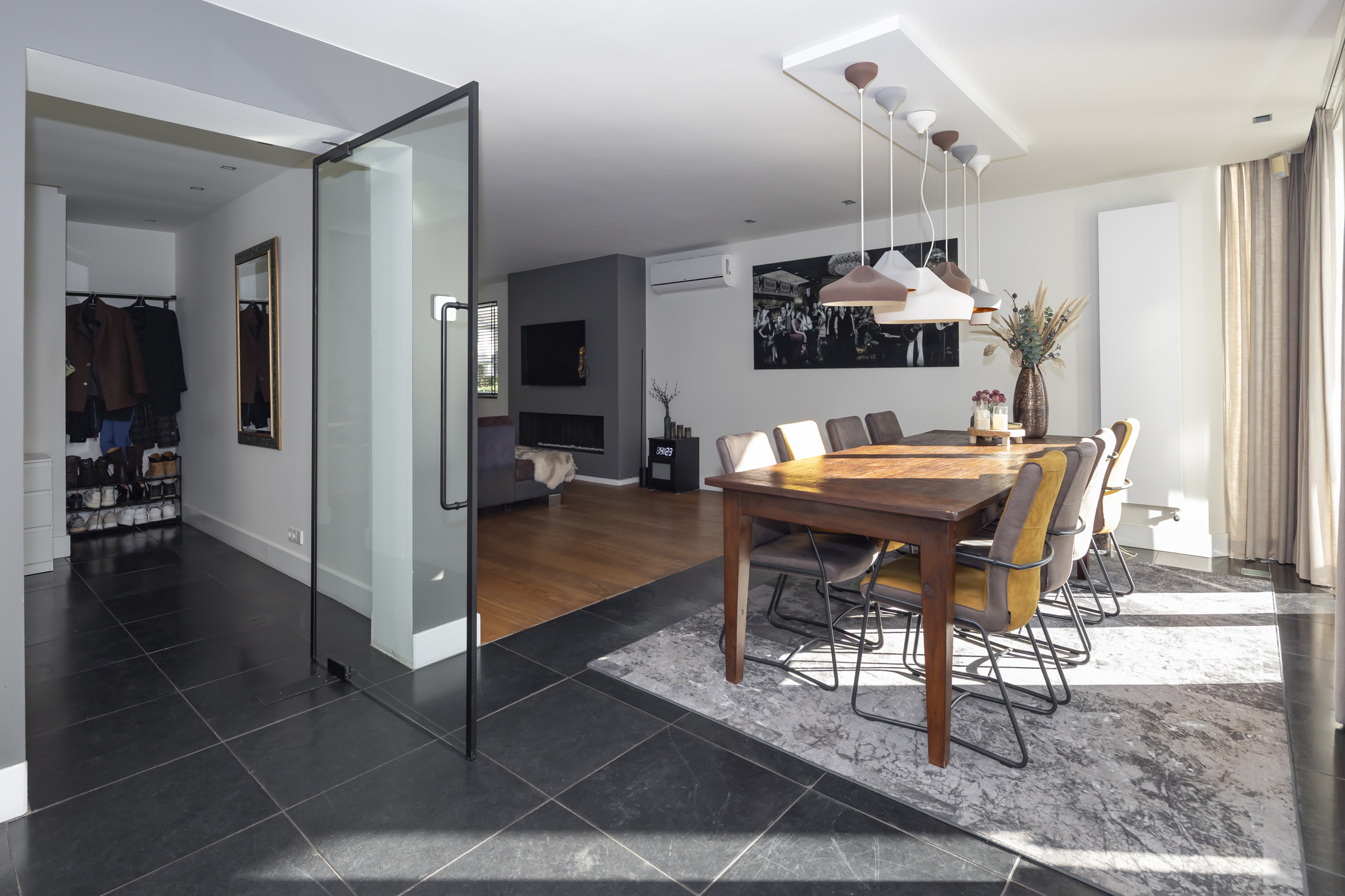 The front door is located on the side of the house, from which you enter the hallway. In this beautiful hall, where the meter cupboard, the toilet room, and the stairs to the first floor are located, you enter the living room through a beautiful glass pivot door.
