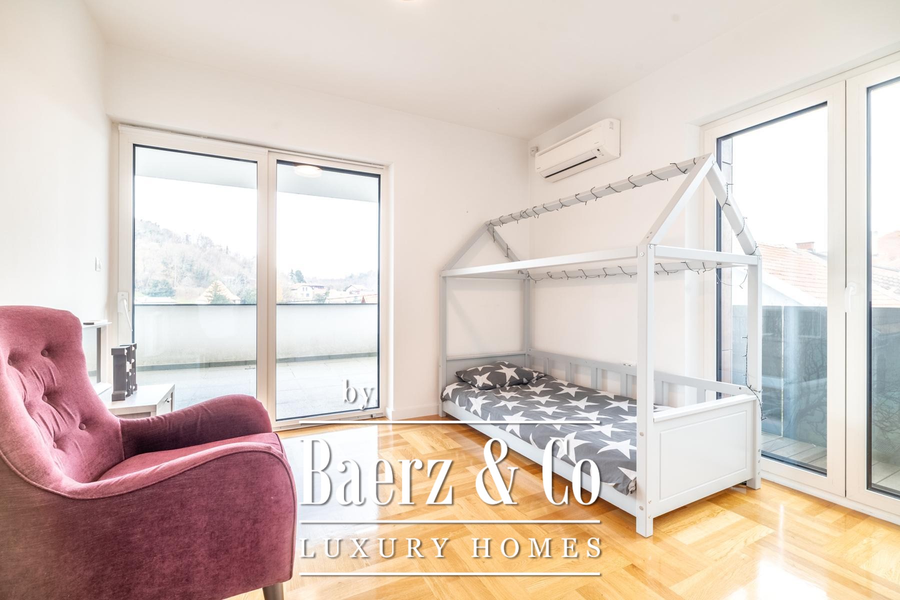The ground floor introduces a garage for two cars, a laundry room, wine cellar, boiler room, and an indoor pool with a shower, setting a discreet tone of comfort and convenience. The upper ground floor features the main entrance, a fluid living and dining area, a kitchen with pantry, guest conveniences, and immediate access to a terrace and garden. One bedroom and bathroom complete this level. On the first floor, three bedrooms open to private terraces and balconies, complemented by two bathrooms. The uppermost floor offers two further bedrooms, a bathroom, and terraces with wide views of Medvednica and the eastern skyline.