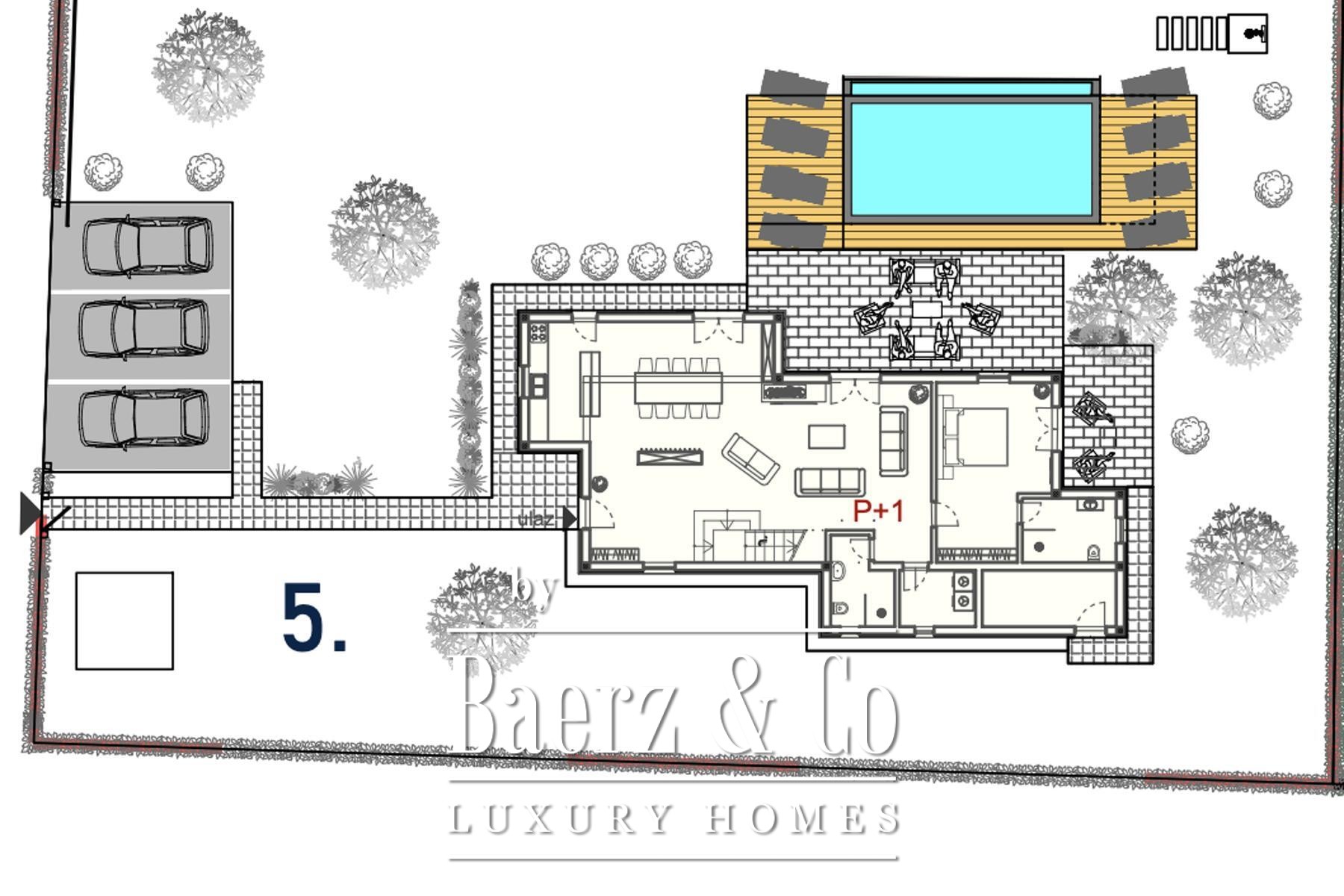 The ground floor welcomes with an entrance hall, setting a quiet tone before unfolding into open kitchen and dining spaces. The living room, oriented seamlessly towards a terrace, extends the social rhythm outdoors. The sun-drenched terrace features a deck that frames the infinity pool, creating a tactile connection with the garden. A ground floor bedroom with private bath accesses this terrace, while thoughtful amenities include a guest toilet, laundry room, and engine room.
