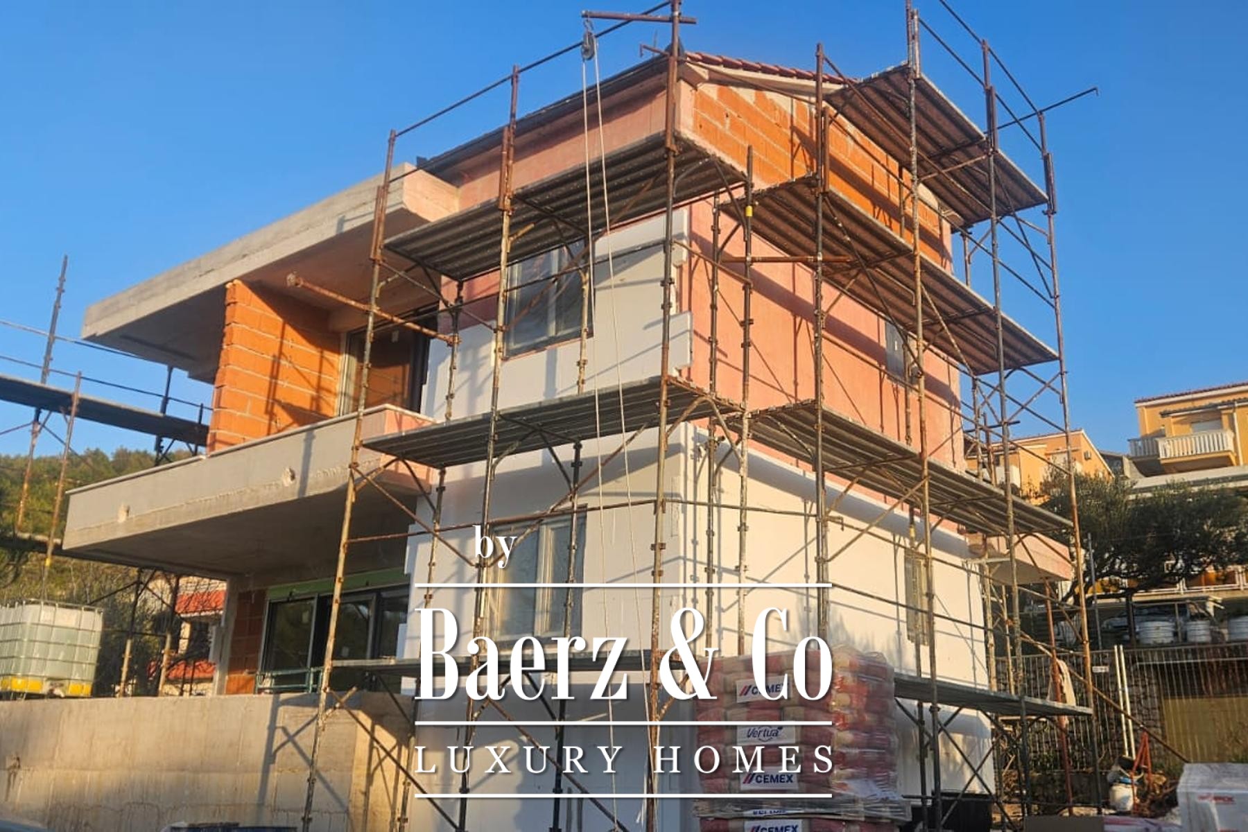 The house unfolds over a basement, high ground floor, and first floor, providing a harmonious flow between private and communal spaces. The ground floor welcomes you with an open-plan kitchen, dining, and living room, extending to a spacious terrace of 15.6 m² with sea views. Upstairs, three comfortable bedrooms each feature a private bathroom, with two rooms opening out to balconies that capture panoramic vistas of the Adriatic, while a third bedroom includes access to an adjacent balcony.