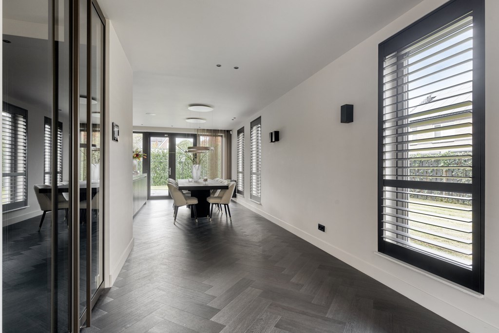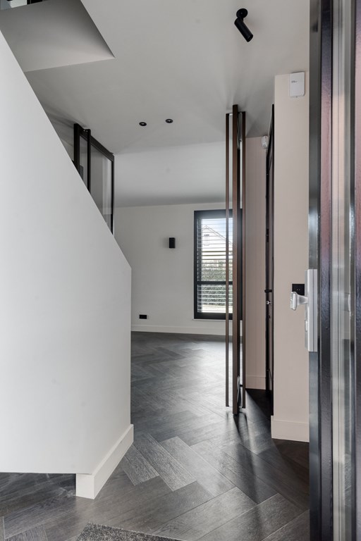 In the spacious reception hall, the stylish staircase immediately catches the eye, beautifully illuminated by natural daylight. As it continues openly to the second floor, it is a true eye-catcher. The high-quality finish is evident from the moment you step inside. From the hall, you have access to the toilet, the living room and the staircase to the first floor.