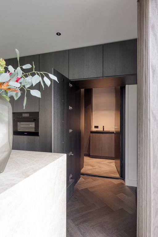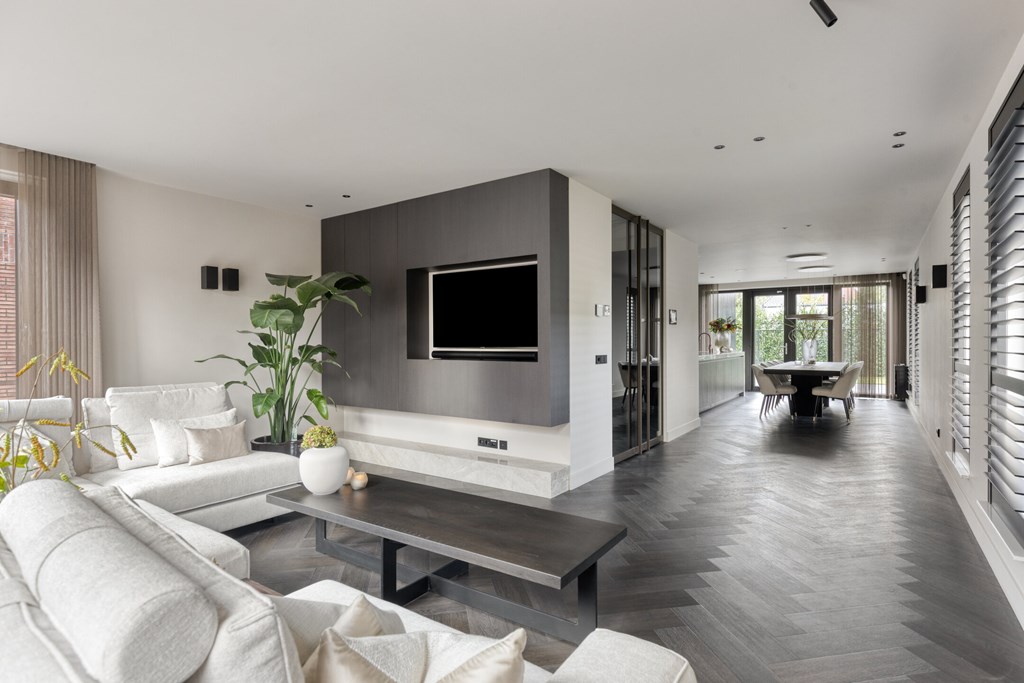 Elegant pivot doors lead you into the bright and spacious living room. The generous layout provides ample room for a comfortable seating area. A custom-made wall unit enhances the luxurious appearance and offers practical storage space. Large windows all around ensure an abundance of natural light and create a seamless connection between indoors and outdoors.
