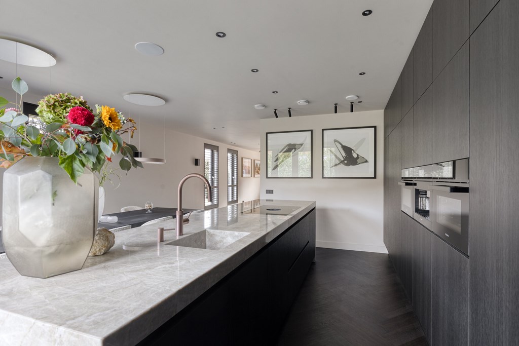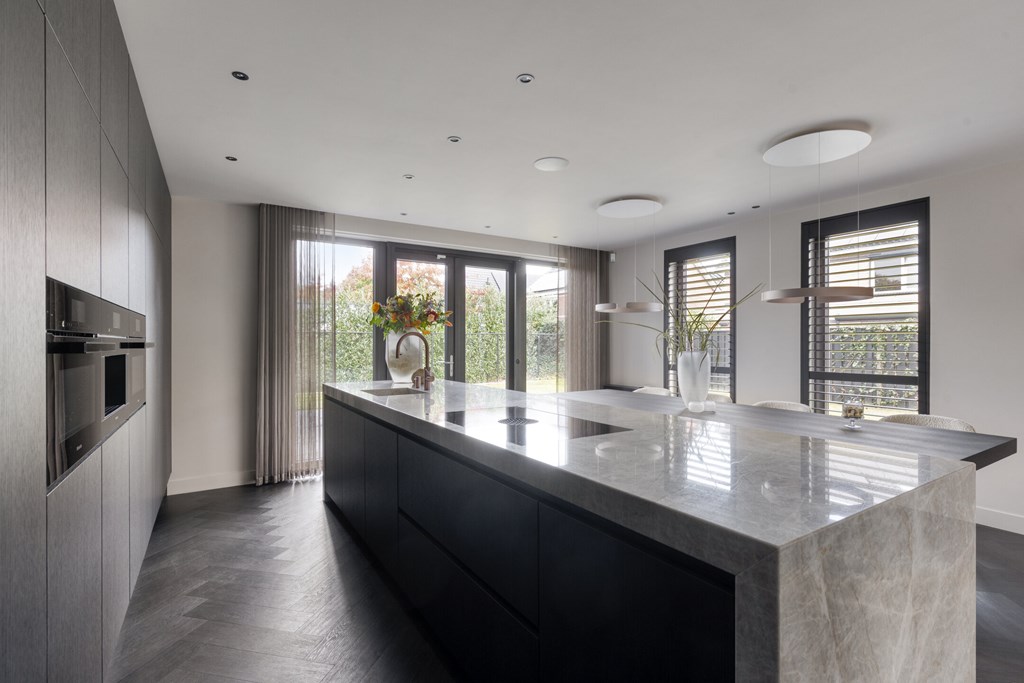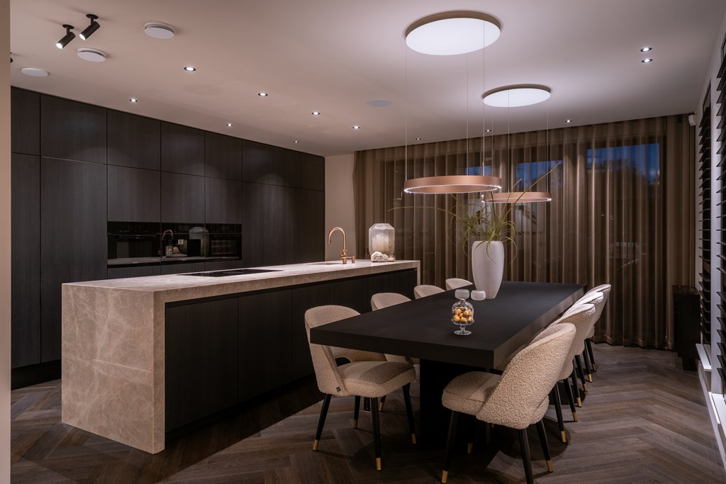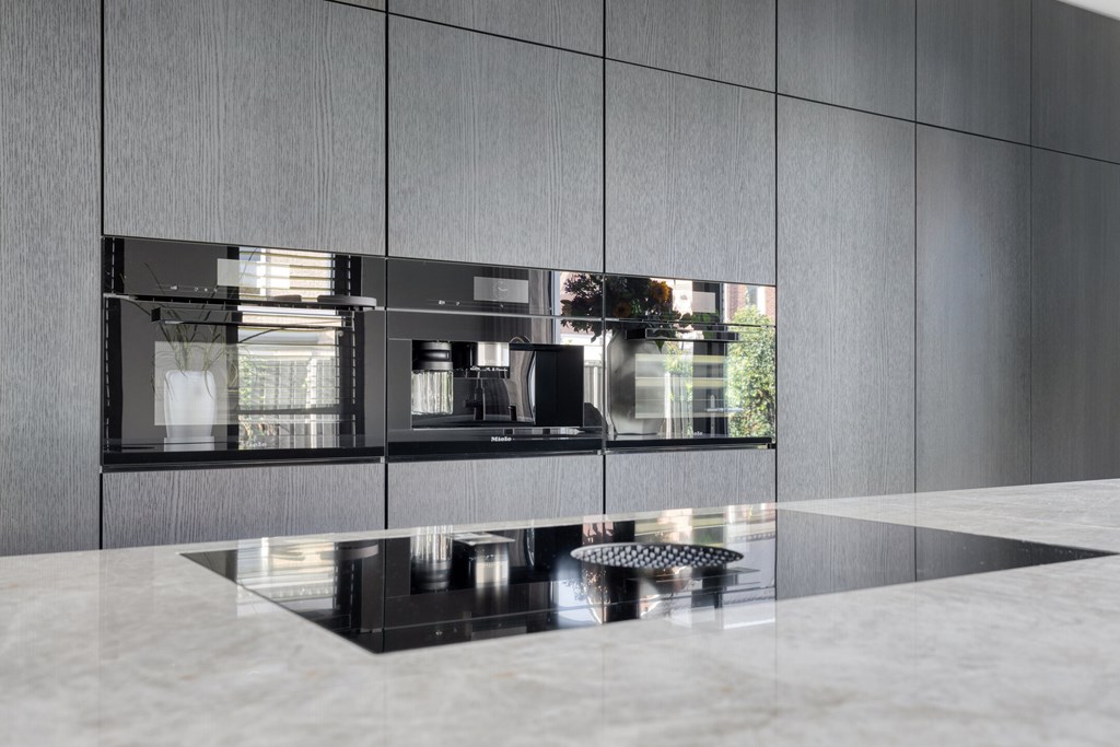 The modern open-plan kitchen forms the heart of the home and is equipped with high-end appliances. The countertop is made of Pure Quartzite, a stylish and durable natural stone. Cooking is done on a Bora induction cooktop with integrated extraction, while the Miele ovens, built-in coffee machine, and the large Siemens refrigerator, freezer and dishwasher ensure optimal cooking comfort.