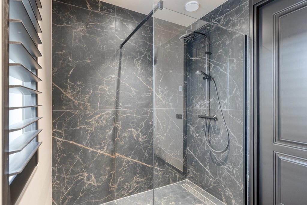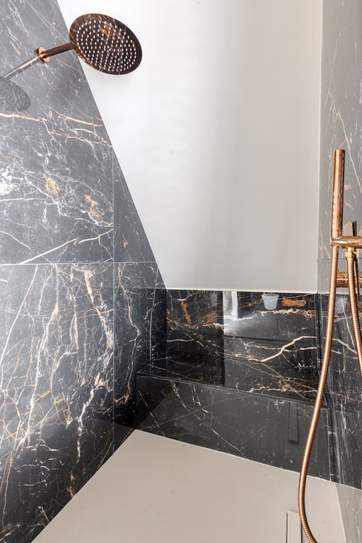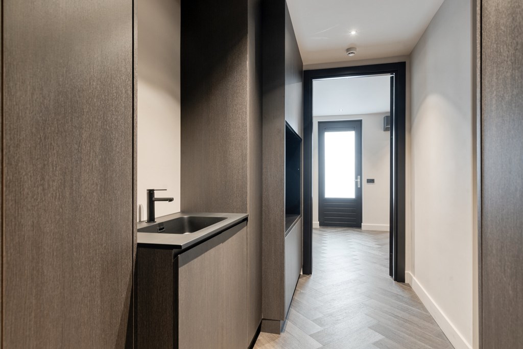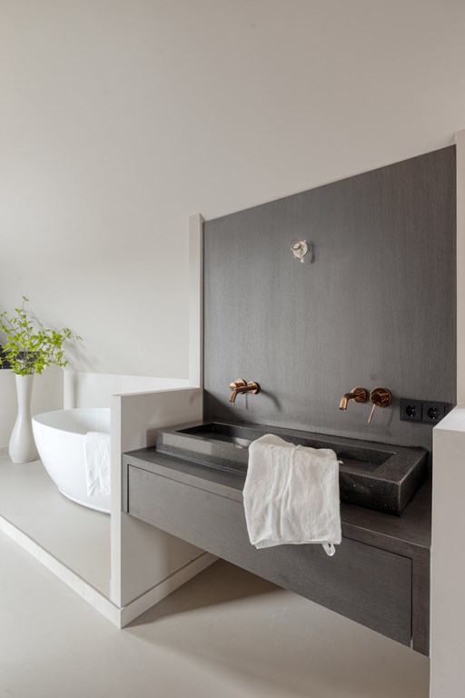 The modern bathroom is fully tiled and equipped with a walk-in shower with glass partition, a double washbasin with mirror, and a Sonos speaker. On the landing, there is a separate toilet with wall-mounted toilet. Everything exudes quality and comfort.