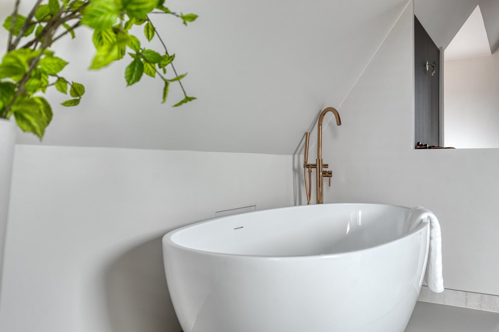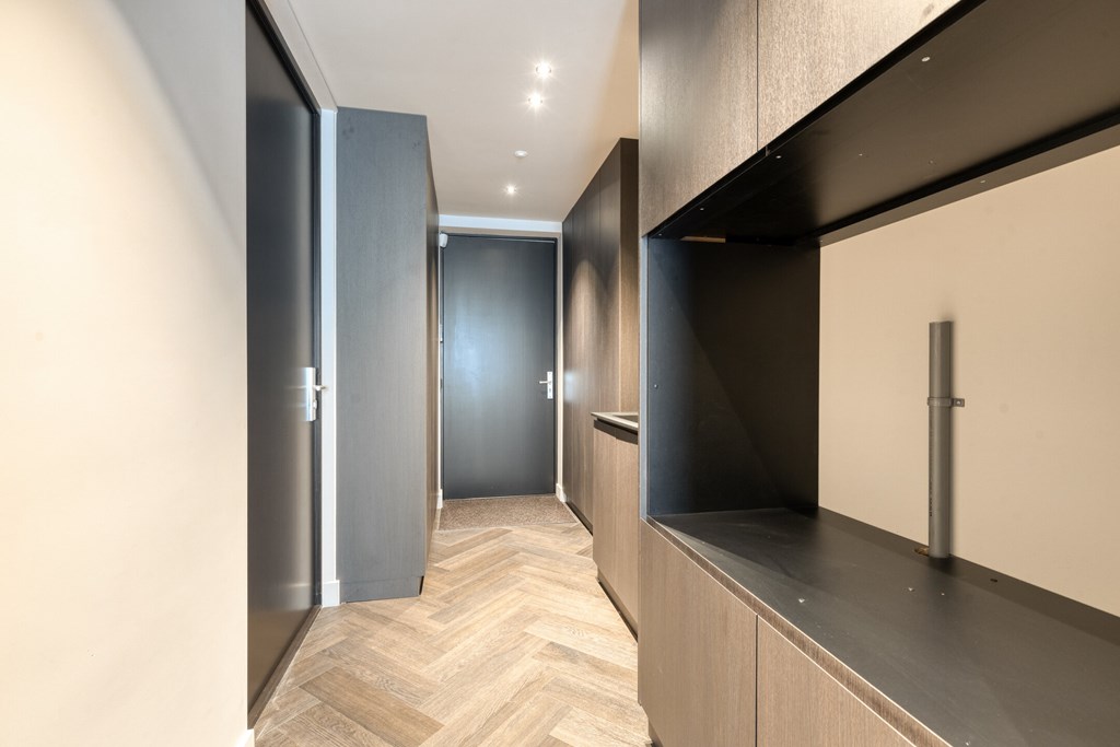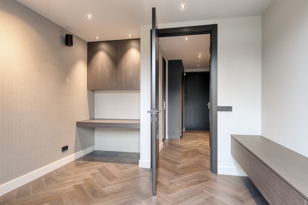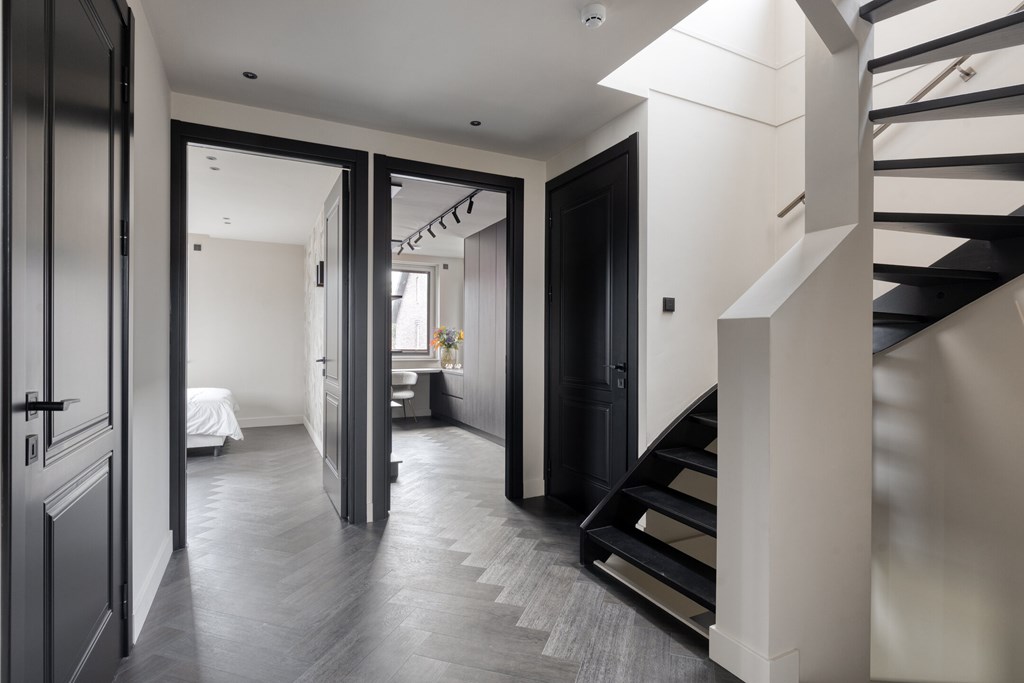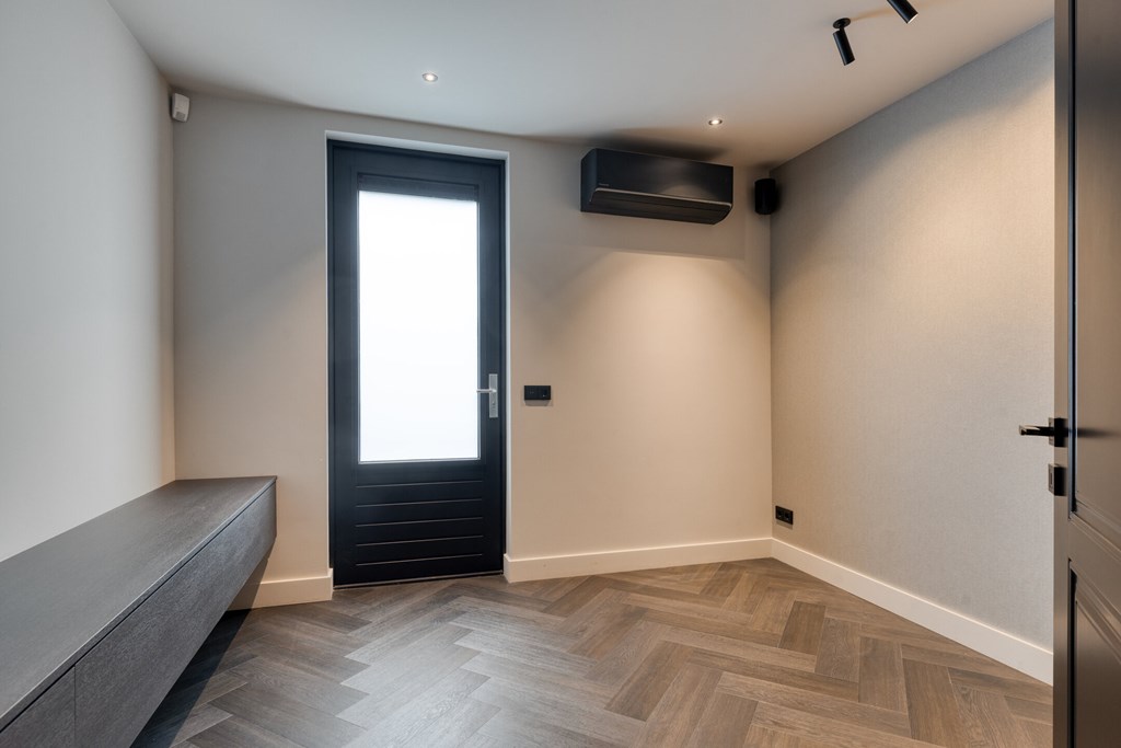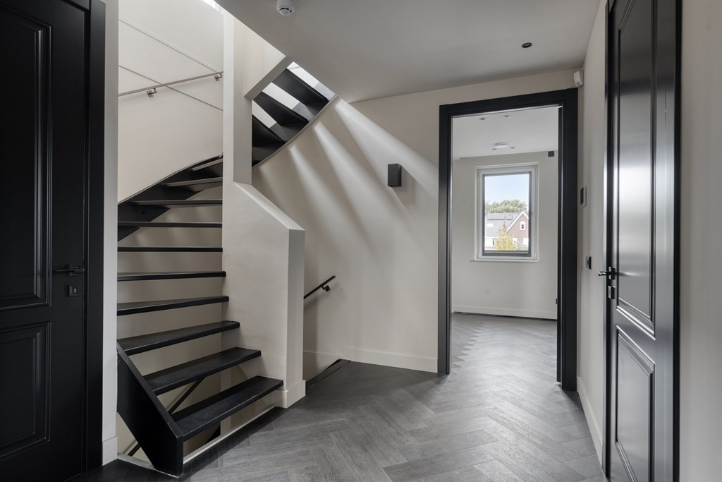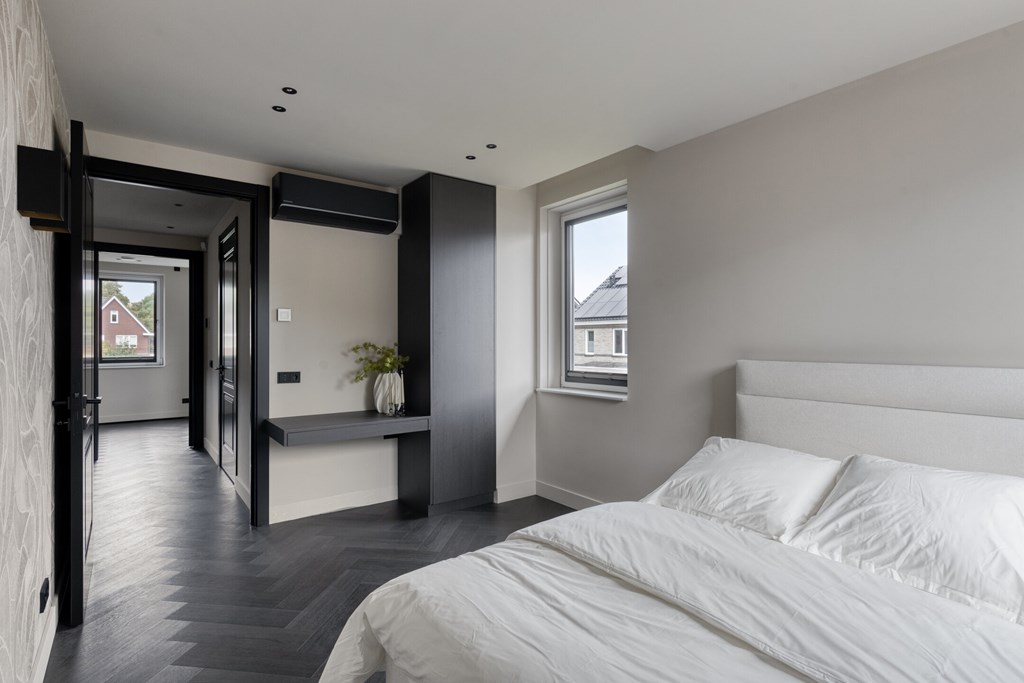 A fixed staircase leads to the second floor, which is designed as the master suite. Here you will find a spacious bedroom and a generous open wellness area with a freestanding bathtub, walk-in shower, toilet and double washbasin. Preparations have been made for the installation of a sauna, allowing you to create a true relaxation space. On the landing, a beautiful built-in wardrobe wall with lighting has been installed.