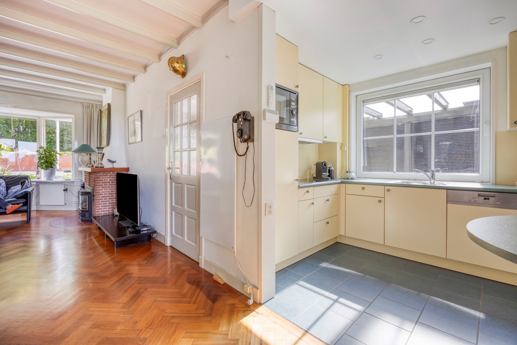 The living room is the heart of the home and exudes warmth thanks to the combination of large windows, a cozy fireplace, and characterful wooden support beams. The open layout offers plenty of scope for arranging a sitting area and dining space, while the sliding door to the garden creates a direct connection to the outdoors. Thanks to the air conditioning, this room is comfortable in every season.
