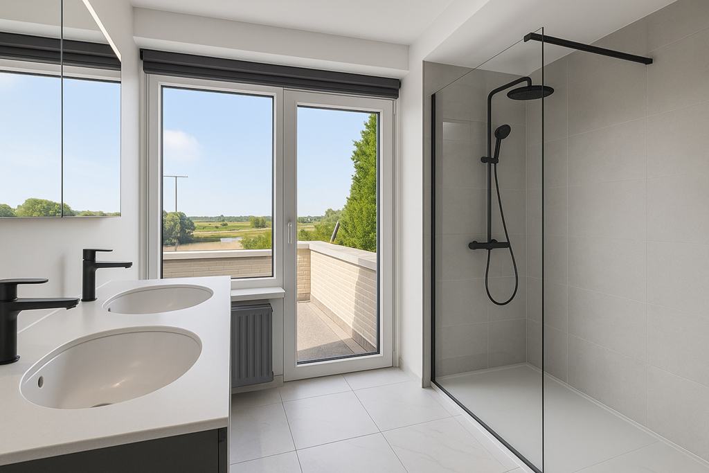 The first-floor bathroom is generously sized and includes a shower, bathtub, toilet, and double washbasin with storage unit. From this room there is also access to the roof terrace—a unique bonus for those who enjoy fresh air and privacy.