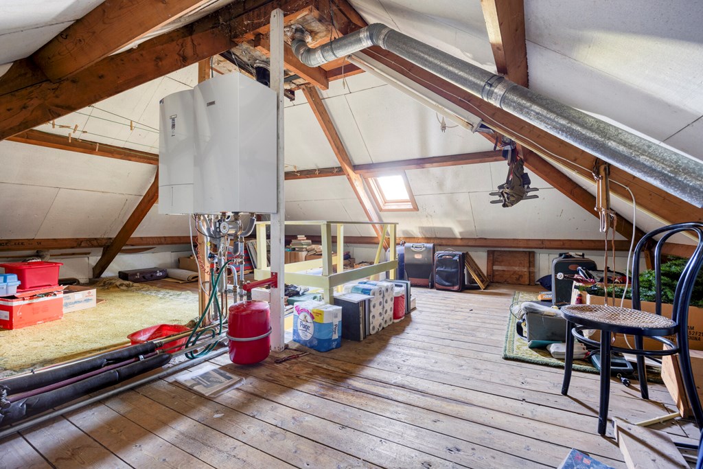 A fixed staircase brings you to the second floor, where a spacious attic sits beneath the roof ridge. The central heating boiler is located here, and there is ample room for storage or for creating an additional room.