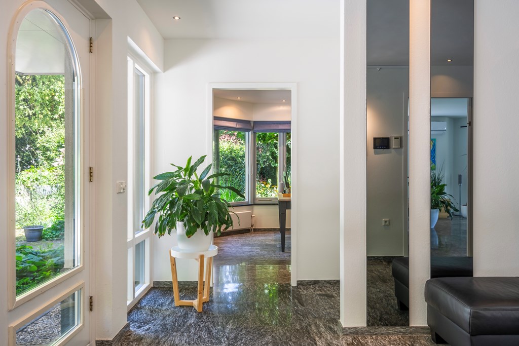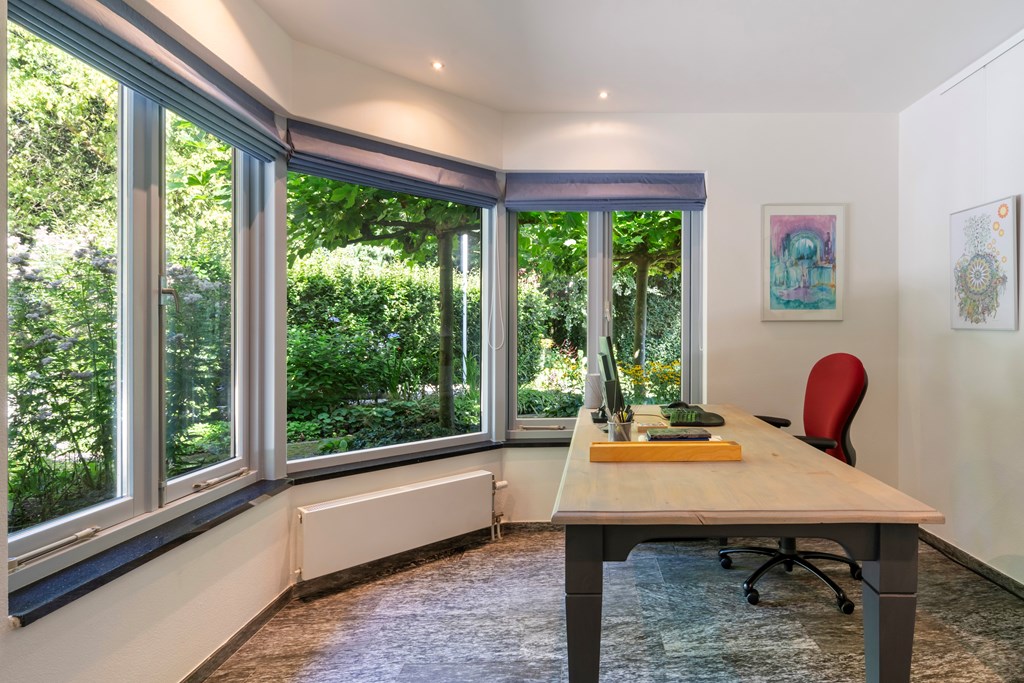 U komt binnen in een ruime, lichte hal die toegang geeft tot de woonkamer, een werkkamer, toiletruimte, meterkast (21 groepen + glasvezel) en de trapopgang. De werkkamer is ideaal en perfect bereikbaar om bijvoorbeeld klanten te ontvangen. De royale woonkamer heeft een bijzondere indeling, waardoor u gemakkelijk verschillende zithoeken kunt creëren. De grote ramen rondom bieden een prachtig uitzicht op de tuin en zorgen voor veel licht. Een sfeervolle gashaard voegt extra warmte toe. Via een dubbele schuifpui loopt u zo de zonnige achtertuin in. Aan de zonnige kant zorgen screens voor extra comfort. De ruime keuken met een eigen deur naar de tuin is ideaal voor het bereiden van maaltijden. Aangrenzend aan de keuken vindt u een bijkeuken met een aanrecht voorzien van spoelbak en aansluitingen voor de wasmachine en droger. De gehele benedenverdieping is voorzien van een natuurstenen vloer met vloerverwarming. In de woonkamer bevindt zich ook een airco.