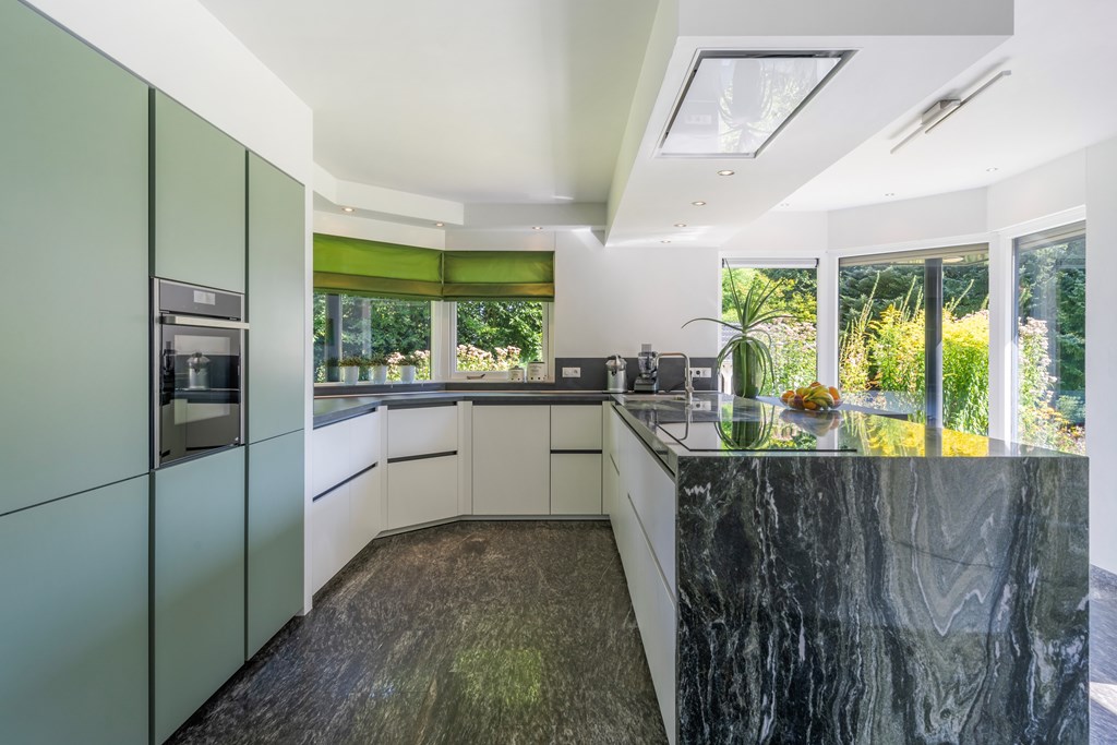 De royale, U-vormige keuken is nog maar een paar jaar oud (2020) en voorzien van hoogwaardige apparatuur. Dankzij de ruime opzet en praktische indeling is deze keuken van alle gemakken voorzien. U beschikt over een groot natuurstenen werkblad, een vijfpits kookplaat, bakoven, plafondunit afzuigkap, vaatwasser, grote koelkast, een grote vriezer en veel opberg-/kastruimte. Deze moderne keuken biedt volop ruimte om uitgebreid te kokerellen. Bovendien heeft u vanuit de keuken een prachtig uitzicht op de zij- achtertuin en directe toegang tot het terras.