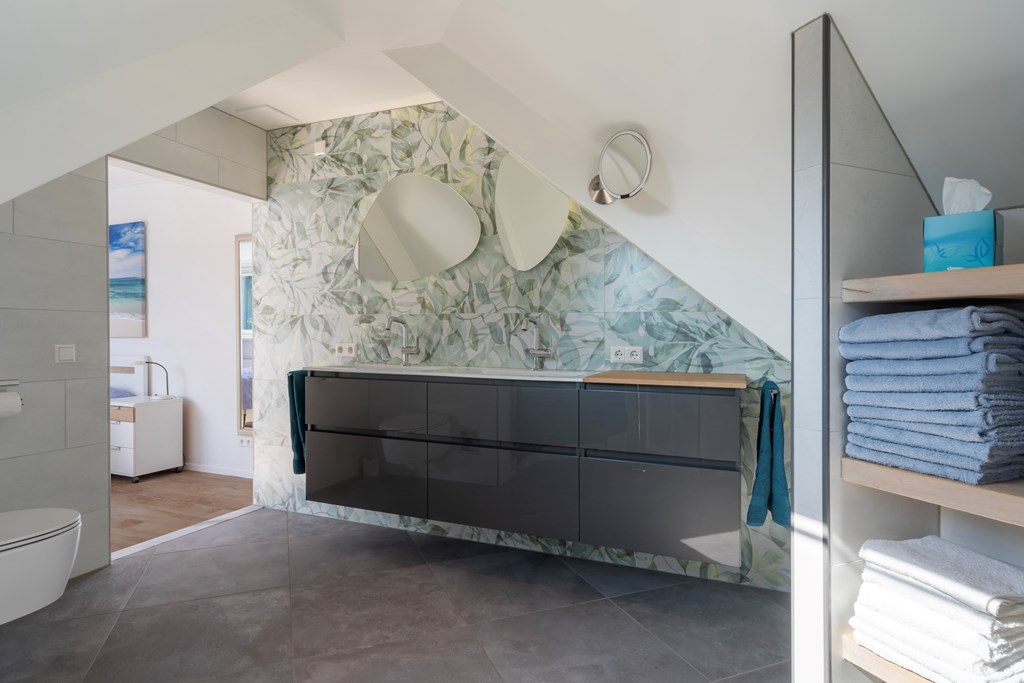Op de begane grond bevindt zich in de hal een separate toiletruimte met fonteintje. Op de eerste verdieping zijn twee badkamers aanwezig. De badkamer die grenst aan de masterbedroom is geheel vernieuwd in 2020 en is luxe uitgevoerd en voorzien van een inloopdouche, een Sunshower, een designradiator, een dubbele wastafel en een toilet. De betegelde vloer is uitgerust met vloerverwarming voor extra comfort. De tweede badkamer, afgewerkt met witte marmeren tegels, beschikt over een douche, een wastafel, toilet en designradiator.