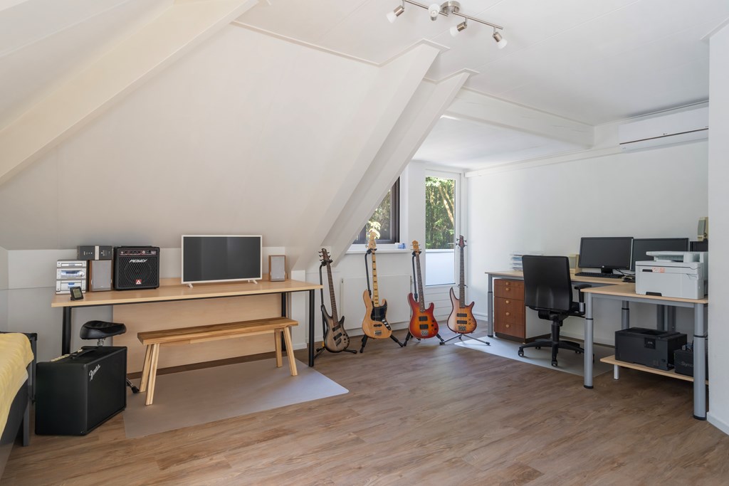 De overloop geeft toegang tot drie slaapkamers en een badkamer. De royale masterbedroom beschikt over een eigen en suite badkamer en is uitgerust met airconditioning voor extra comfort. De dubbele openslaande deuren van de slaapkamer geven u toegang tot een balkon, waar u een prachtig weids uitzicht heeft op de groene tuin. Grenzend aan de slaapkamer komt u in een ruime kastenkamer met daglicht. De tweede en derde slaapkamer liggen aan de voorzijde van het huis en beschikken beide over een ruime inbouwkast, ruimte voor een groot bed en een bureau, een openslaande deur naar het balkon aan de voorzijde en airconditioning. De schuine wanden, hoge nokken en zichtbare houten balken geven de hele verdieping een sfeervolle, karakteristieke uitstraling.