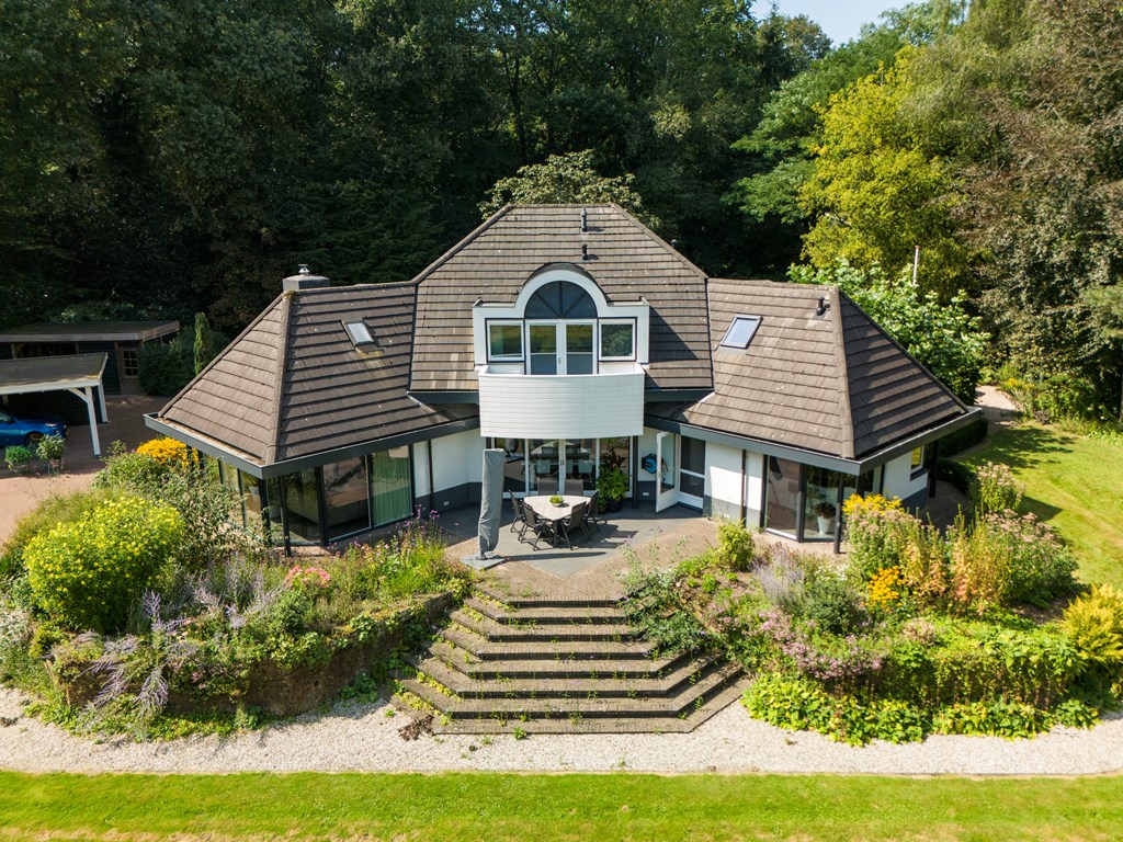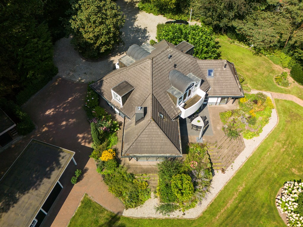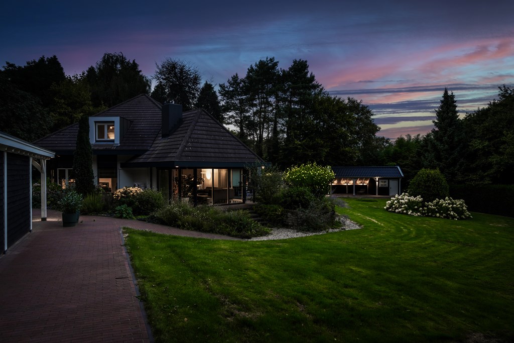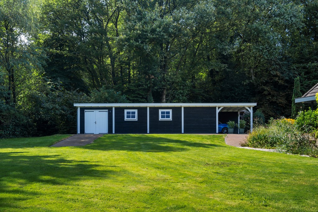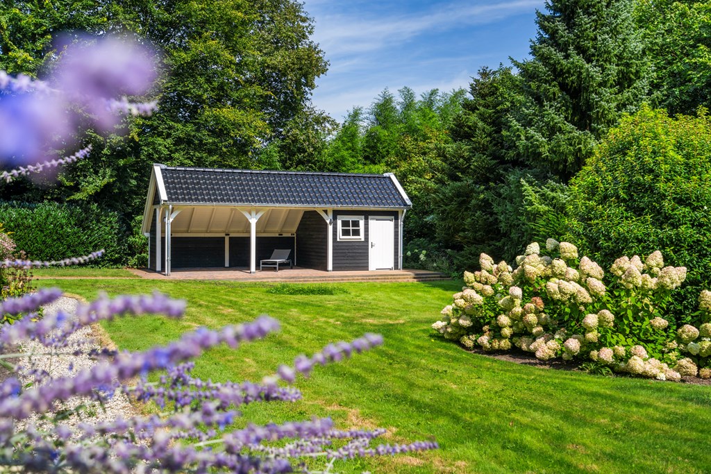 De oprit brengt u naar het prachtige perceel omzoomd door planten en bomen. De weelderige achtertuin op het zuidoosten biedt een groen en open landschap. Met een groot gazon hebben kinderen hier alle ruimte om te spelen of geniet u van de rust, zon en privacy. Een bestraat terras aan het huis biedt een schitterend uitzicht over de tuin. Daarnaast is er een tweede, overdekt terras, waar u op warme dagen in de schaduw kunt ontspannen. Dit terras is onderdeel van de in 2022 nieuw gebouwde kapschuur met bergruimte voor tuingereedschap, tuinstoelen e.d.. Een grote houten schuur (wanden en dak geïsoleerd) met carport en grote berging (2022) zorgen voor voldoende ruimte voor het stallen en/of opbergen van een auto, motor, fietsen, grasmaaier, gereedschap e.d.. Er is nog een derde schuur aanwezig welke o.a. wordt gebruikt voor het stallen van een aanhangwagen. In de tuin is een irrigatiesysteem voor besproeiing van de tuin aanwezig (middels een grondwaterpomp).