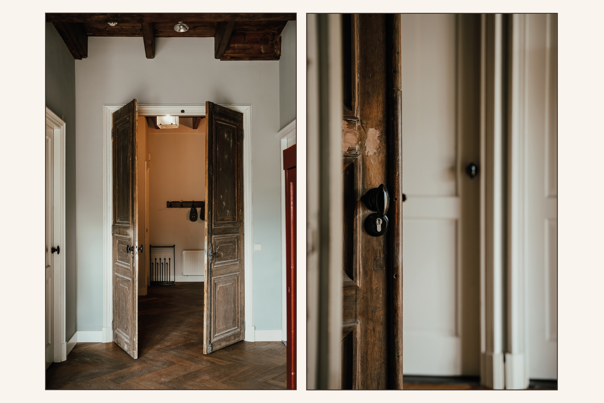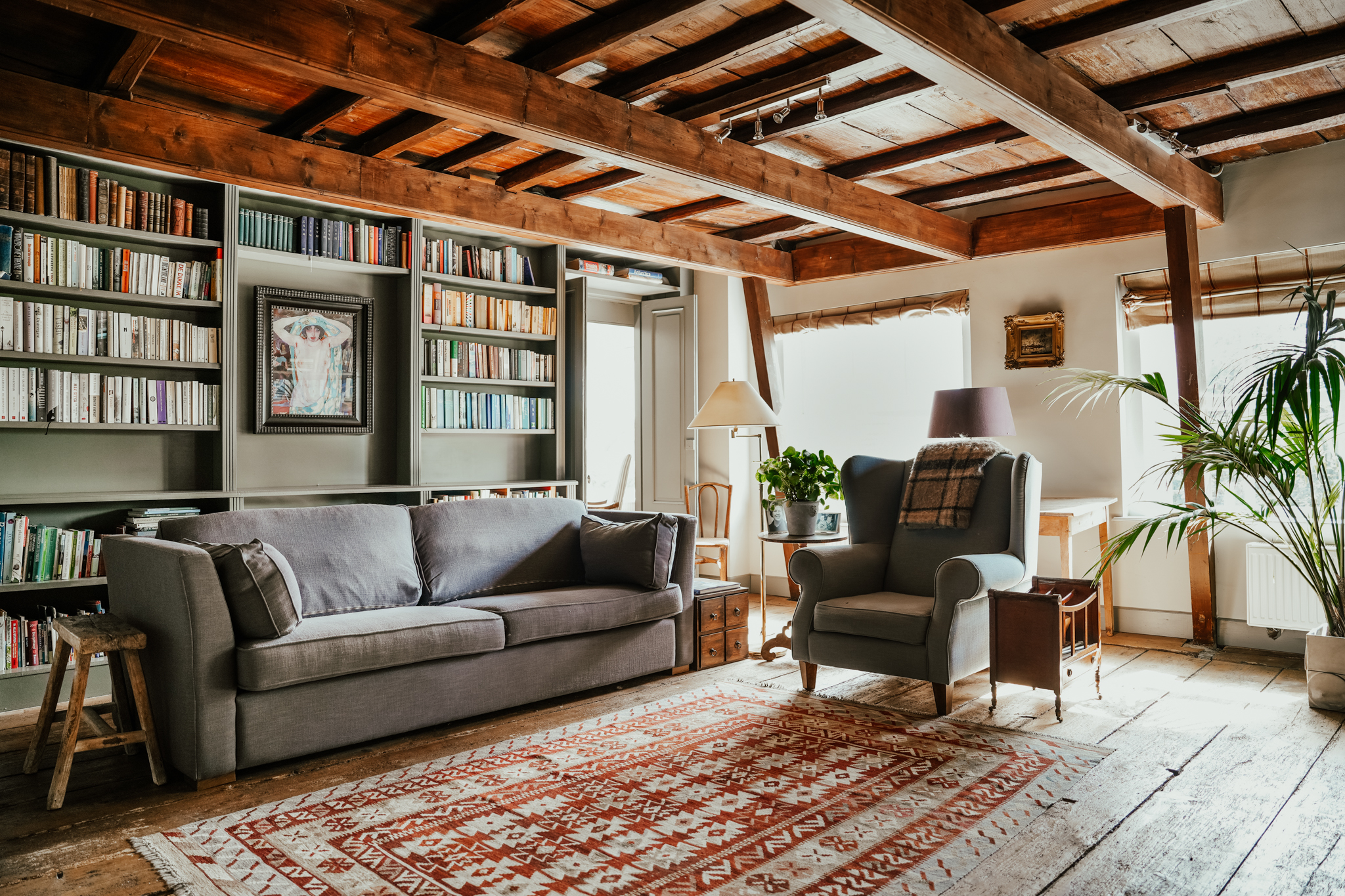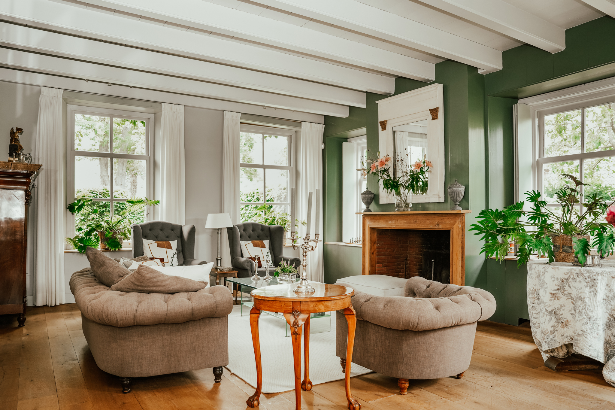 The spacious entrance hall and rear corridor feature oak Versailles parquet flooring. To the right of the hall is the study, offering views of Kerkstraat, with built-in cupboards and a broad mantelpiece with a wood-burning stove. On the left side of the hall lies the living room, a bright space enhanced by tall sash windows with interior shutters and a white-painted beamed ceiling. The room features a mantelpiece with an open fireplace, wide oak floorboards, and a deep storage cupboard.