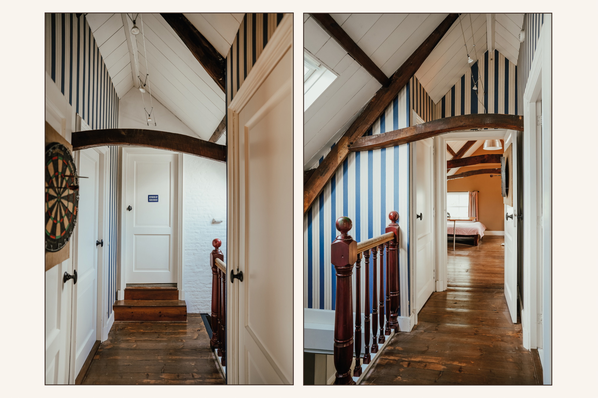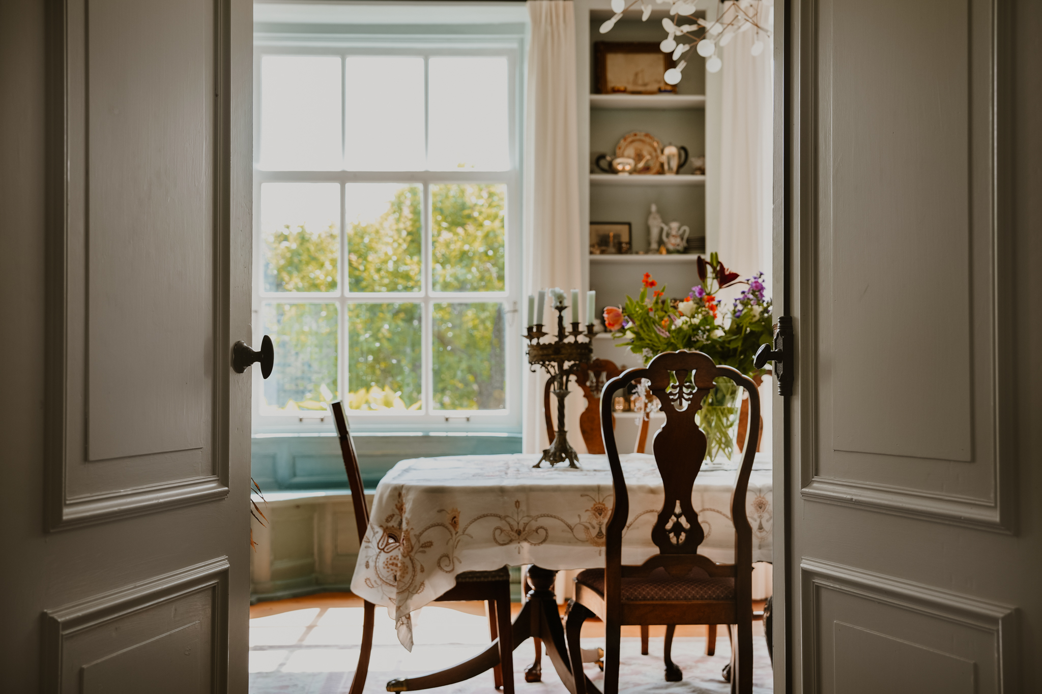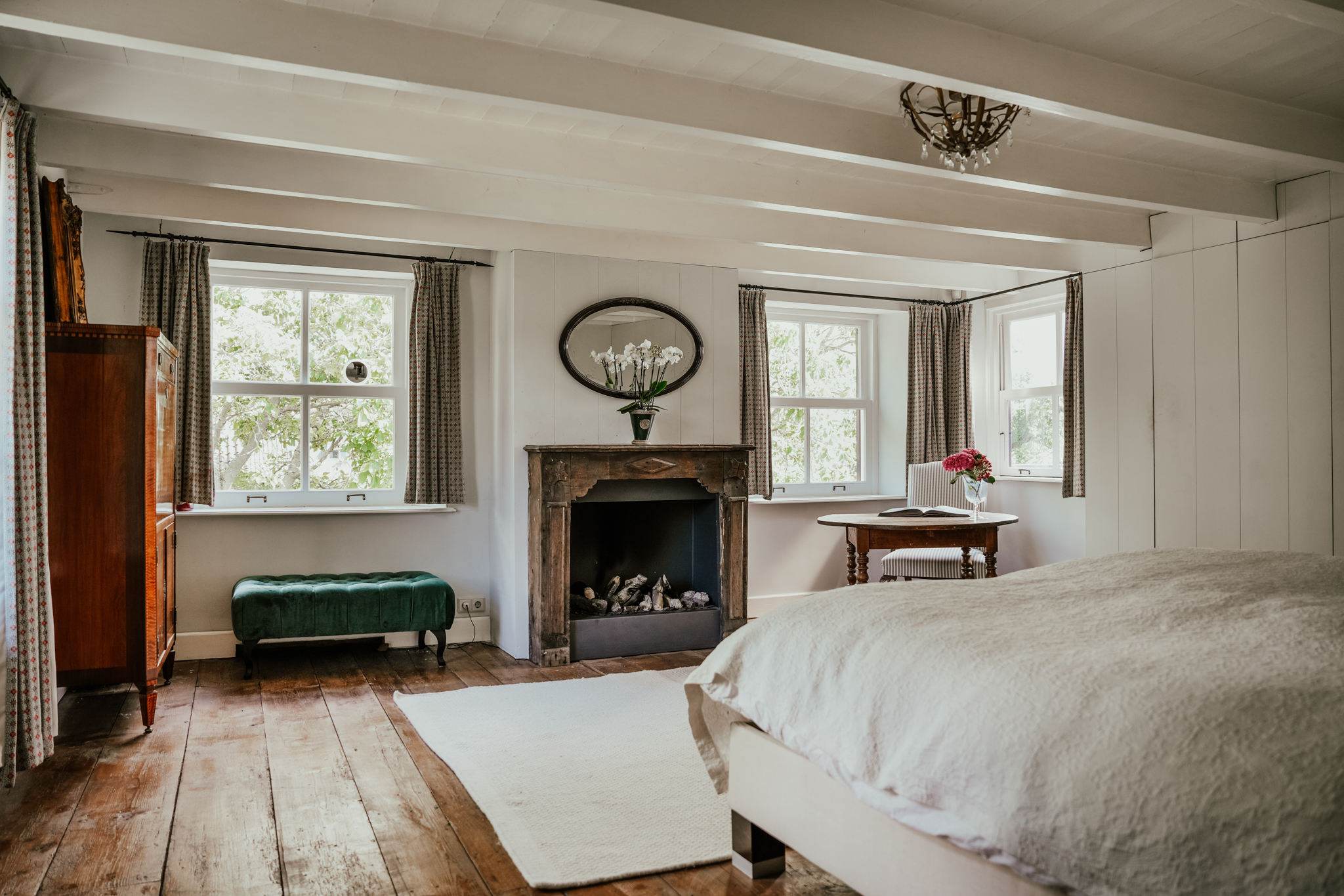 The landing leads to three spacious bedrooms and a balcony. The master bedroom features an open fireplace, built-in wardrobes, and air conditioning. Tall sash windows provide beautiful views of the front garden and the Waaldijk.
