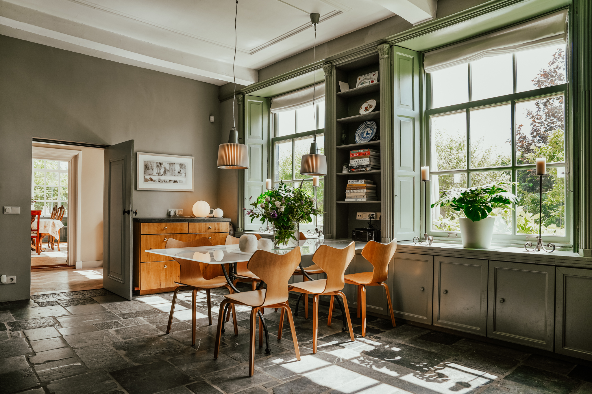 Elegant double panel doors connect the living room to the garden-facing dining room. This charming room offers deep window seats below the tall sash windows with authentic interior shutters, a built-in cupboard, and a plaster ceiling.