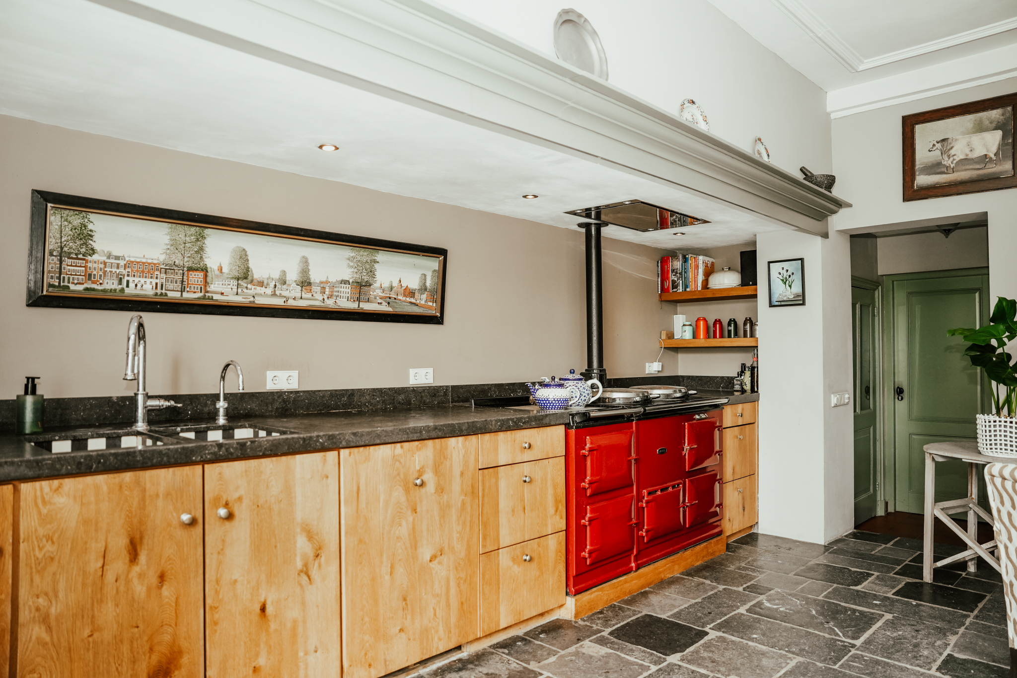 A broad stone staircase leads from the hallway to the cellar, which has full headroom and fixed wine racks. The expansive kitchen is the heart of the home, offering garden views. It features an antique limestone floor with underfloor heating, and a large AGA cooker beneath a wide mantelpiece. The custom-made oak kitchen with a stone countertop perfectly complements the ambiance of this living space. A raised fire pit that doubles as an open fireplace or grill is a highlight of the kitchen.