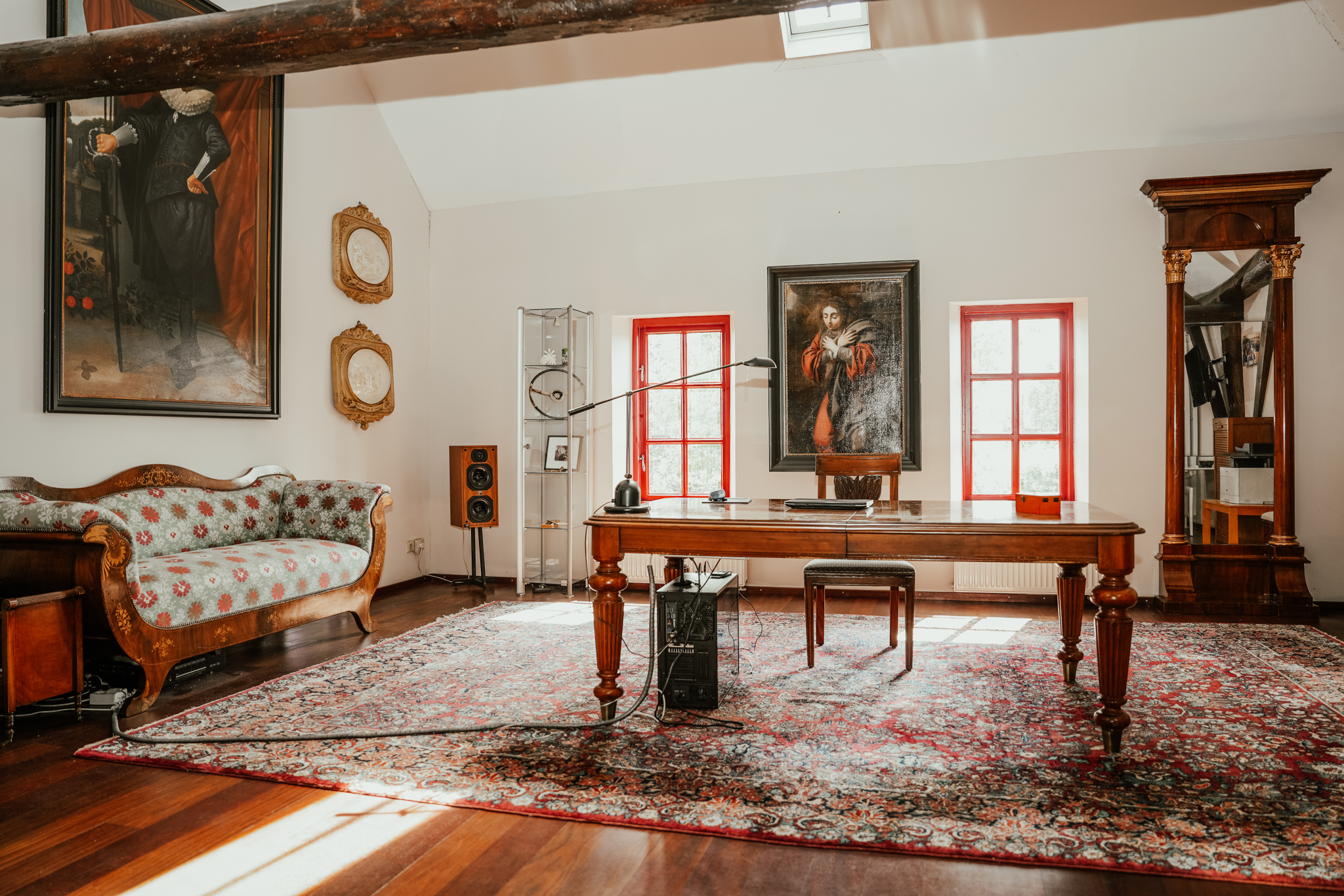 From the hallway, an internal door leads to the barn and a storage room that provides access to the side garden. The barn is currently used as storage for a classic car collection. The staircase to the spacious office on the first floor is enclosed with a glass wall that can be locked for added privacy.