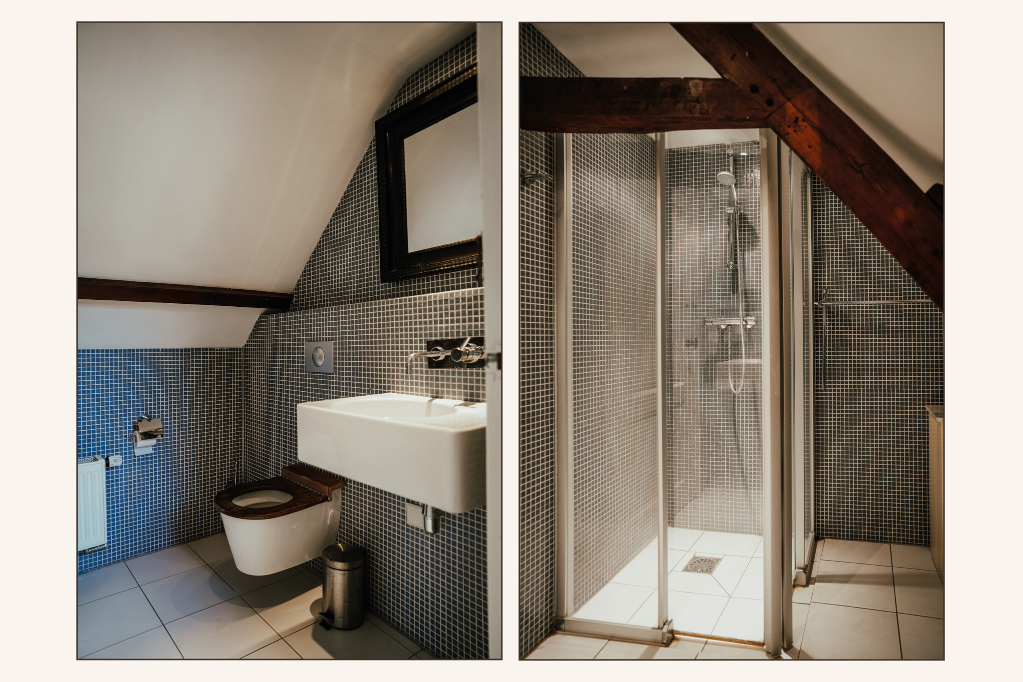 Under the well-insulated rear roof section are two full-sized bedrooms with air conditioning and a fourth bathroom. These bright rooms feature skylights and a dormer window at the rear. The visible timber framework adds a charming touch, and additional storage cupboards have been integrated.