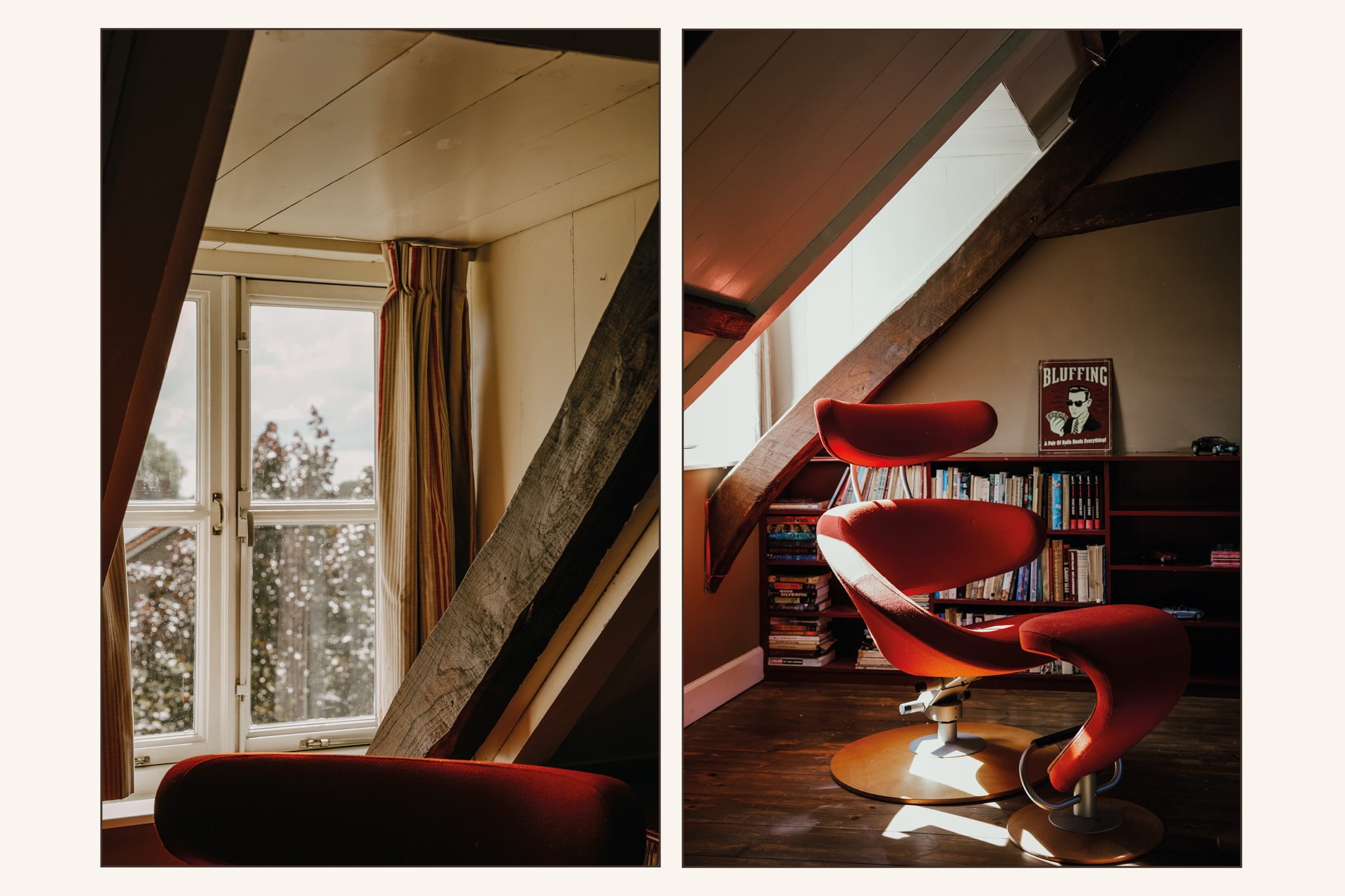 Of the two rear-facing rooms overlooking the garden, the largest currently serves as a second living room, TV room, and has an adjoining workspace. This room radiates authenticity with its beautifully restored beamed ceiling, sash windows, 200-year-old wide floorboards, and a fireplace with fixed cupboards. This room also provides access to the laundry room, workspace, and office.