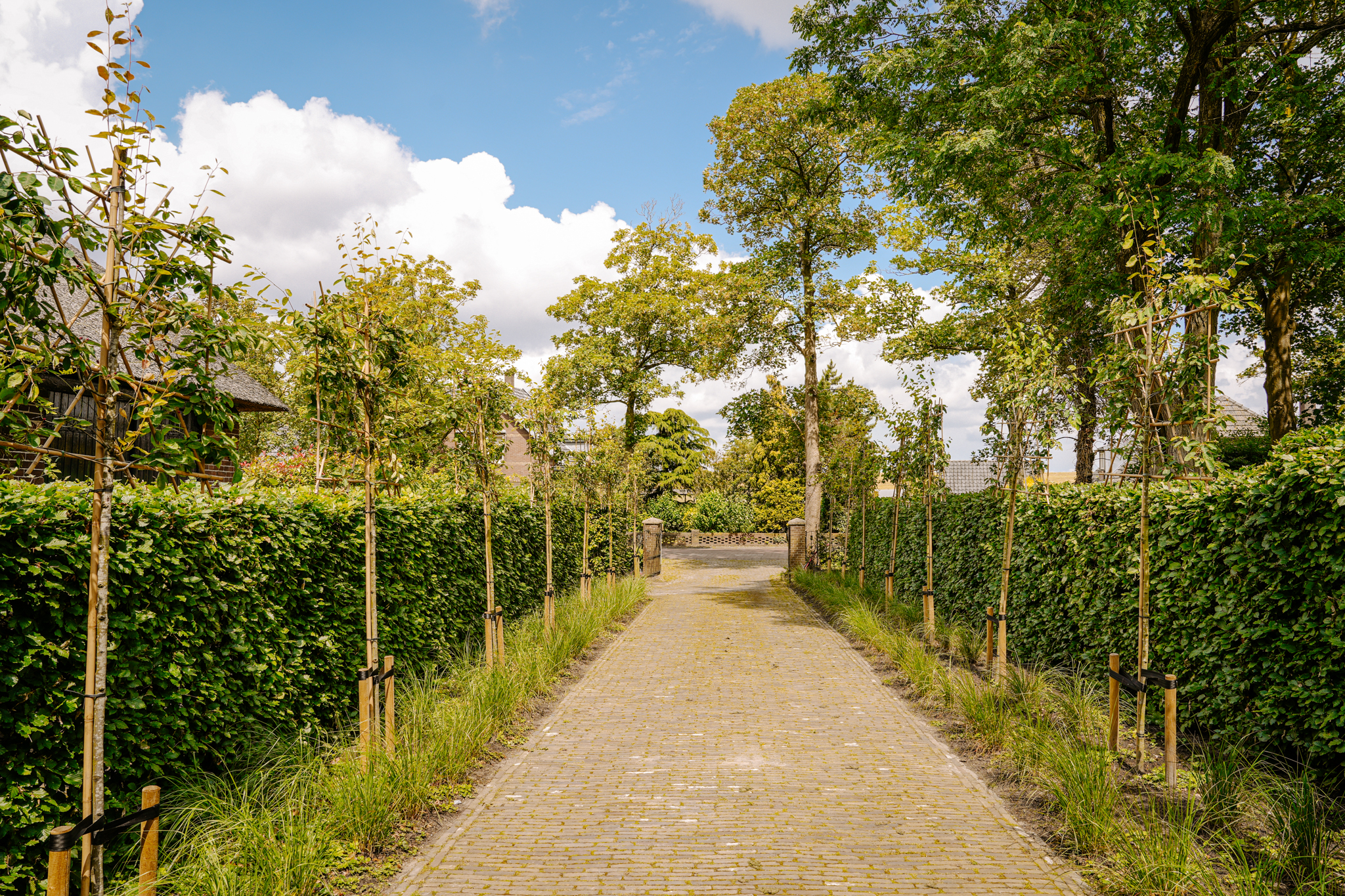 A stately driveway paved with brick pavers, flanked by ornamental grasses, trained Amelanchier trees, and tall beech hedges, leads to the impressive double front doors. To the right of the driveway lies a private parking area with space for seven cars, including three covered under a carport. The property is secured by an elegant wrought-iron entrance gate.
