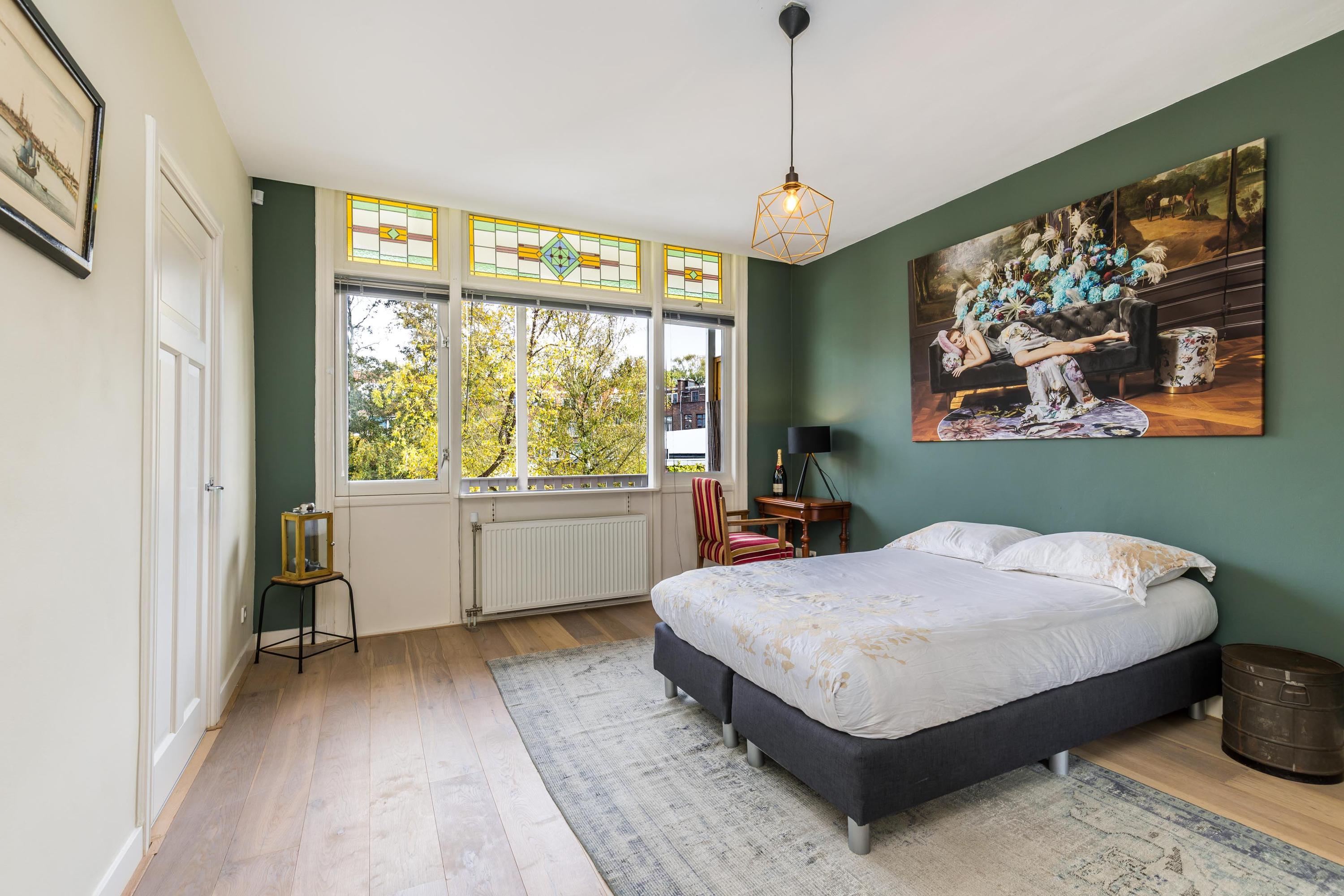 The attic floor is surprisingly spacious and currently offers one bedroom at the rear. The large room at the front has been converted into a generous walk-in closet but can easily be transformed into a very large second bedroom. The rear bedroom enjoys lovely, unobstructed garden views. There is also a second modern bathroom with a walk-in shower and washbasin, plus a practical laundry area with space for a washing machine and dryer.