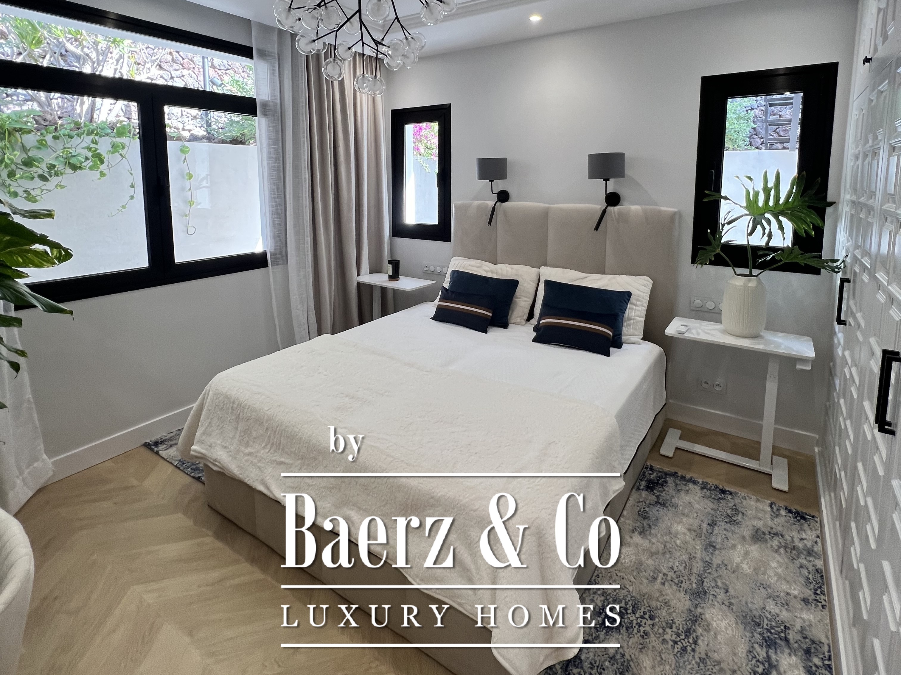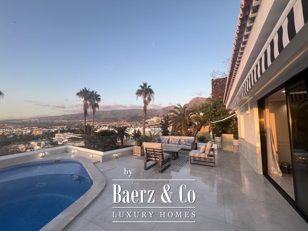 Villa San Eugenio anchors itself quietly within southern Tenerife, offering a calm interpretation of island living with ocean and coastline views. This villa, fully renovated and offered at €2,700,000, delivers a measured balance of openness and discretion across 255 m² of interior space, all on a generous 504 m² plot. The focus keyword, villa San Eugenio, identifies a residence where daily rhythms unfold across lush terraces and fluid living areas, with three main bedrooms positioned on a single level for comfort and continuity.