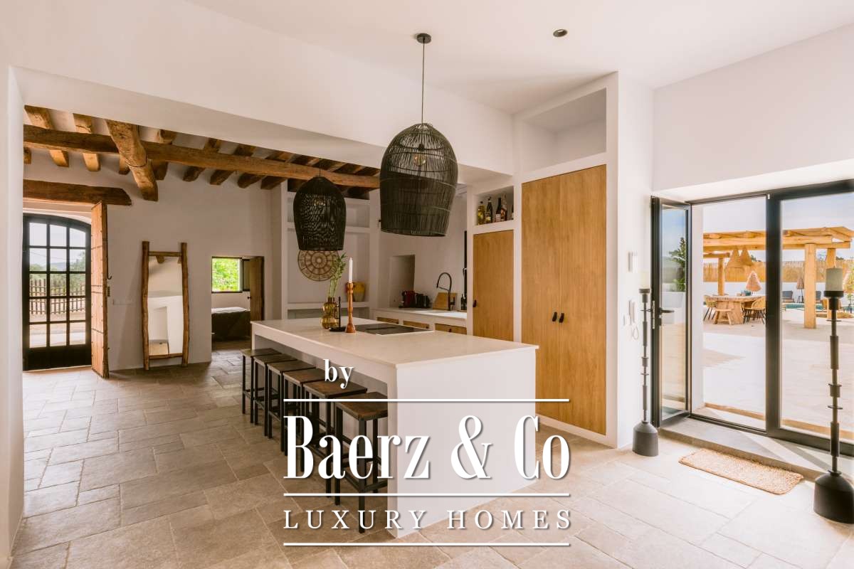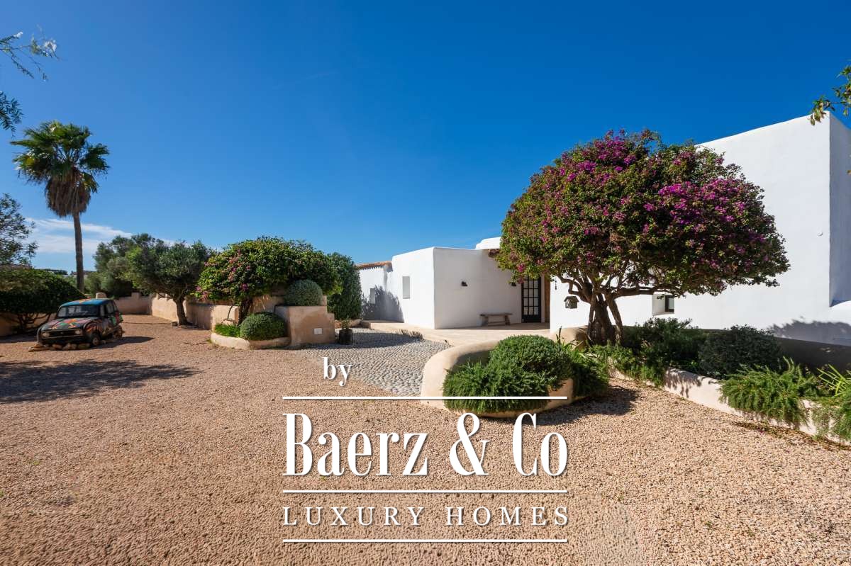Fully renovated in 2023, the main residence unfolds across 440 m² with a refined bohemian chic aesthetic. Enter into an open-plan living and dining space arranged on varied levels, balancing modern design with authentic Ibicencan character. The designer kitchen is equipped with contemporary appliances, while each of the five bedrooms is ensuite and the master features its own bathtub. The separate guest house, positioned 50 meters from the main home for maximum privacy, presents two further bedrooms, a shared bathroom, and a luminous open-plan living area, adaptable for guests or extended stays.