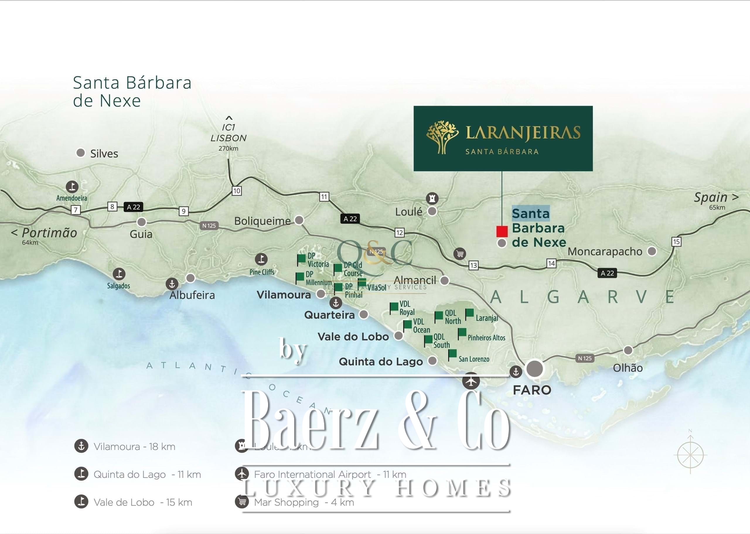 Laranjeiras a unique development of bespoke, architect designed detached villas that nestle quietly within a gated environment in the unspoilt hills above the quintessential Portuguese village of Santa Barbara de Nexe. This beautiful, well-kept village is an undiscovered hillside gem that boasts an historic white church complete with belltower, shady, tree-lined squares and a good sprinkling of amenities including bars, restaurants, shops and coffee houses. There is also a local market and a well-equipped garage. This stunning location offers unrivalled sea views and cool summer breezes and yet is only a short drive from the vibrancy and lifestyle activities of