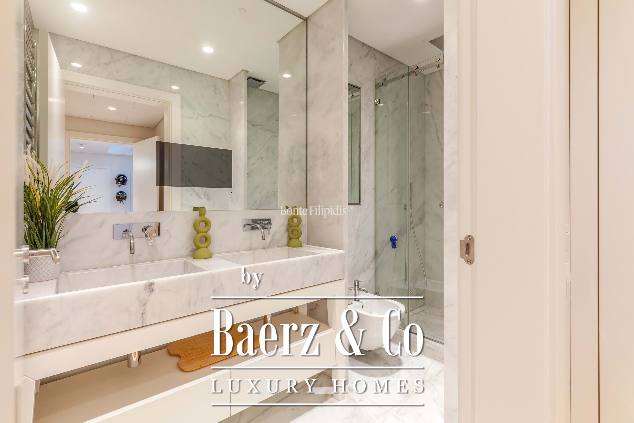 Originally a four-bedroom penthouse, one of the bedrooms has been transformed into a spacious walk-in closet adjoining the master suite. Spanning 197 sqm of interior space, the lower level houses the bedrooms, four bathrooms, and a balcony, all bathed in natural light from large windows that frame breathtaking views of Lisbons castle.