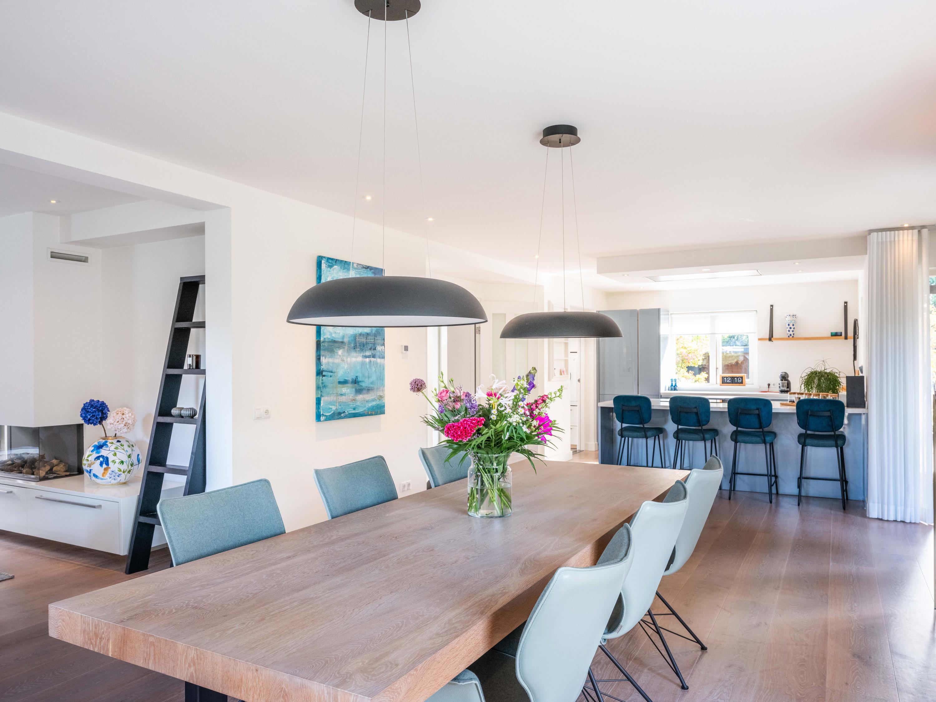 Double doors give access to the spacious L-shaped living room, where you are immediately welcomed by lots of light thanks to the large windows. In the corner is a cosy sitting area with an attractive gas fireplace. The oak laminate flooring in combination with underfloor heating throughout the ground floor creates a warm and comfortable atmosphere.