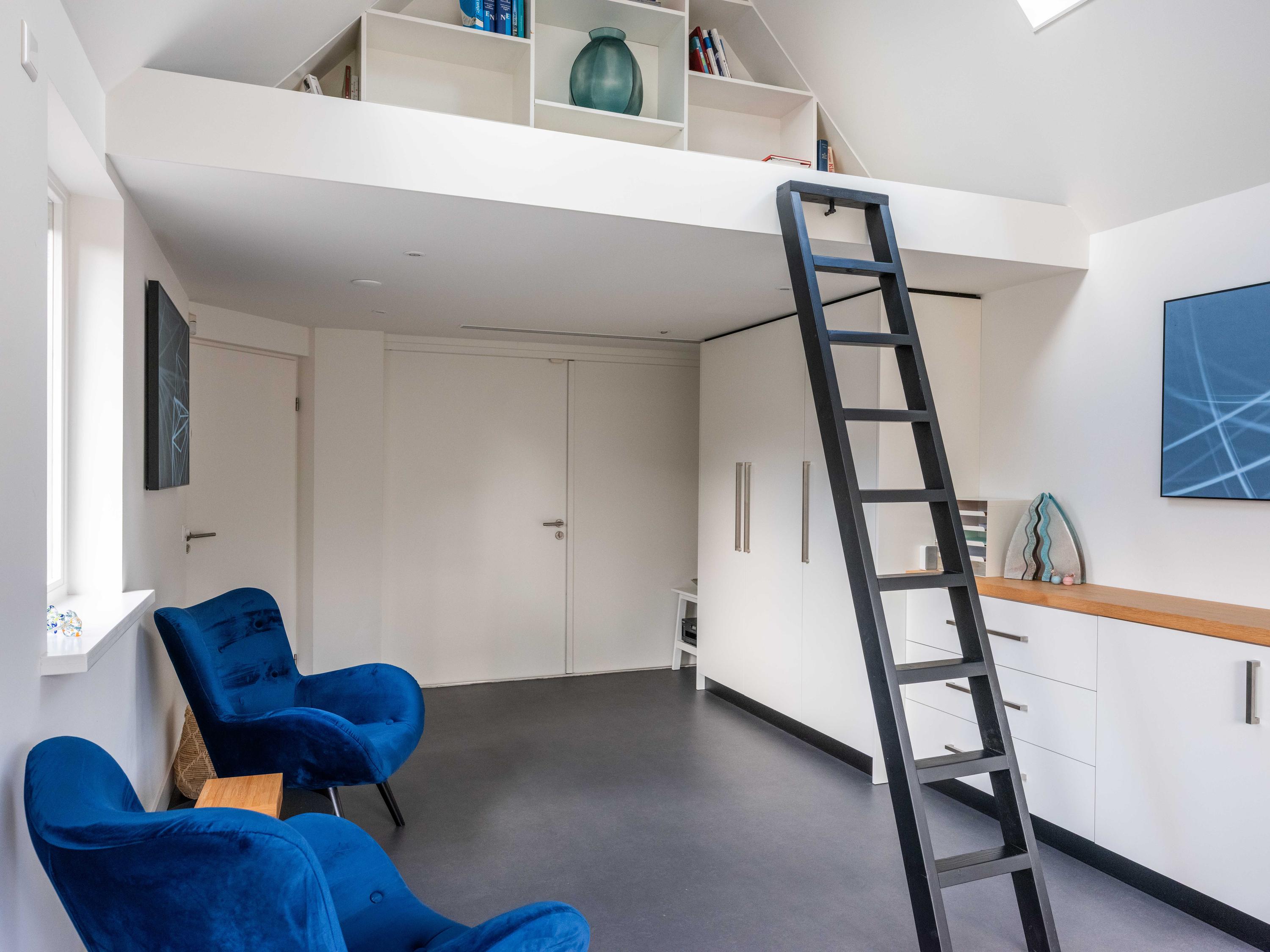 The open kitchen is attractively decorated and equipped with a cosy bar with seating. From the kitchen, you can enjoy a beautiful view of the garden and there is a direct connection to the living room. Thanks to the open layout and abundant light, everything feels spacious, fresh and inviting.