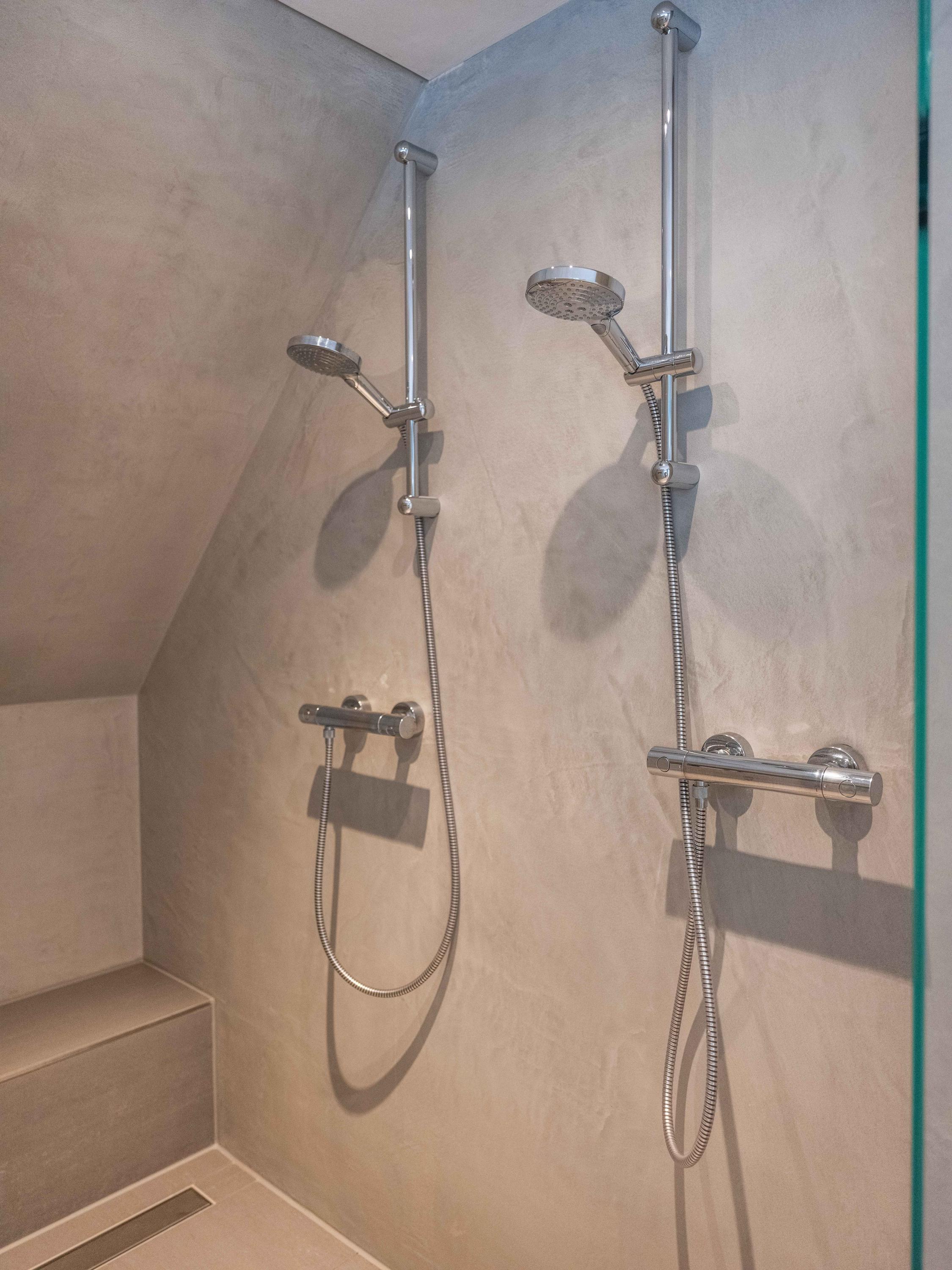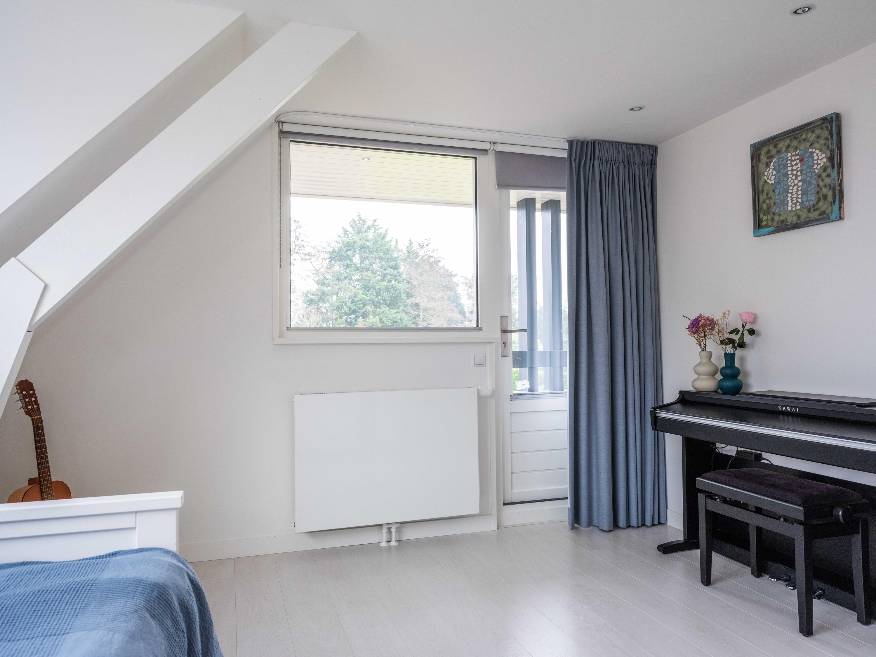 On the first floor, there are three bedrooms and a spacious bathroom with double sink, toilet, bathtub and a generous double walk-in shower. Underfloor heating is also present here, as well as a radiator. The master bedroom is spacious and has plenty of built-in cupboard space. There are two additional bright bedrooms, both with built-in cupboards and access to a private balcony. There is a handy storage cupboard under the stairs to the attic.