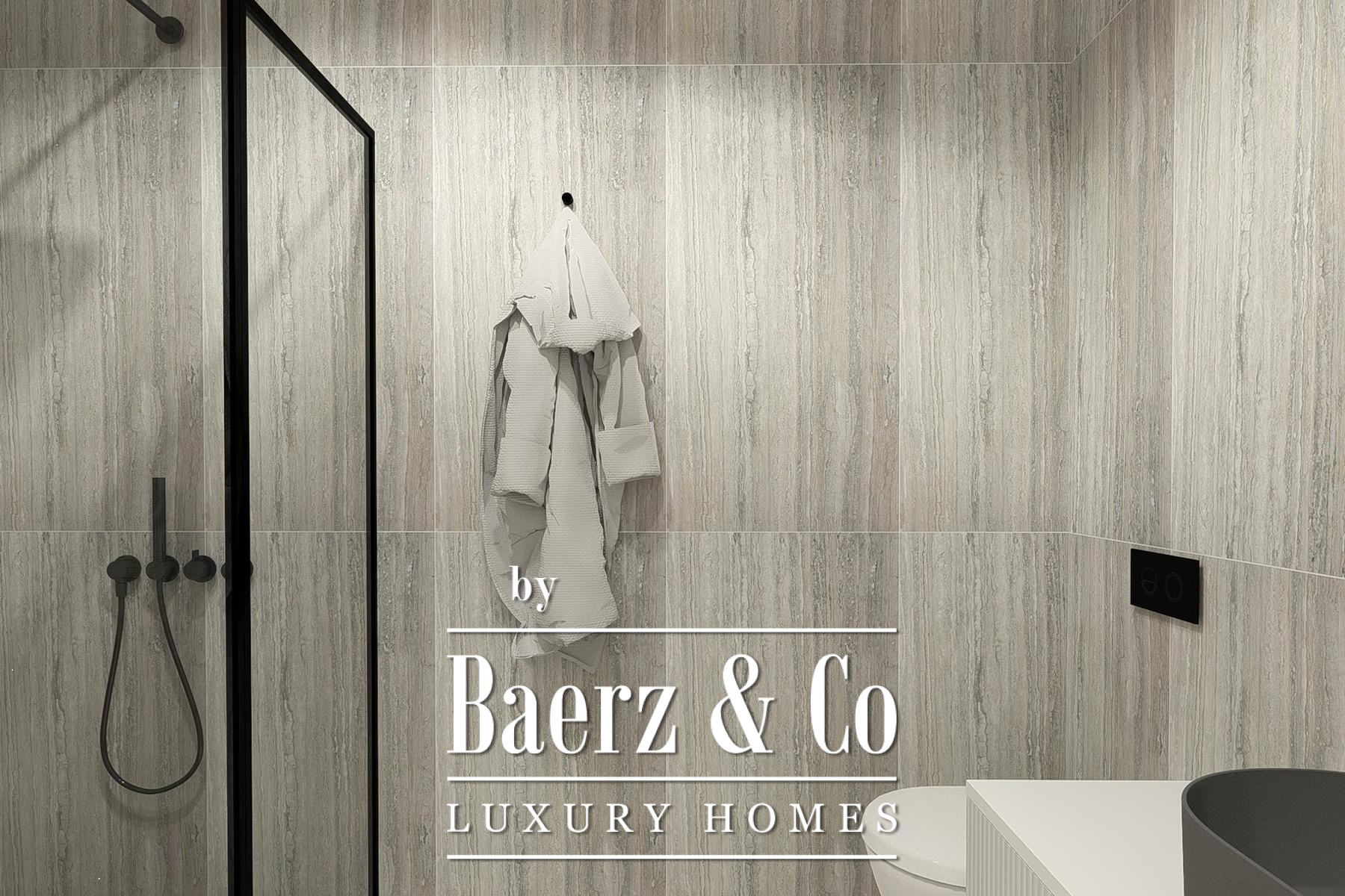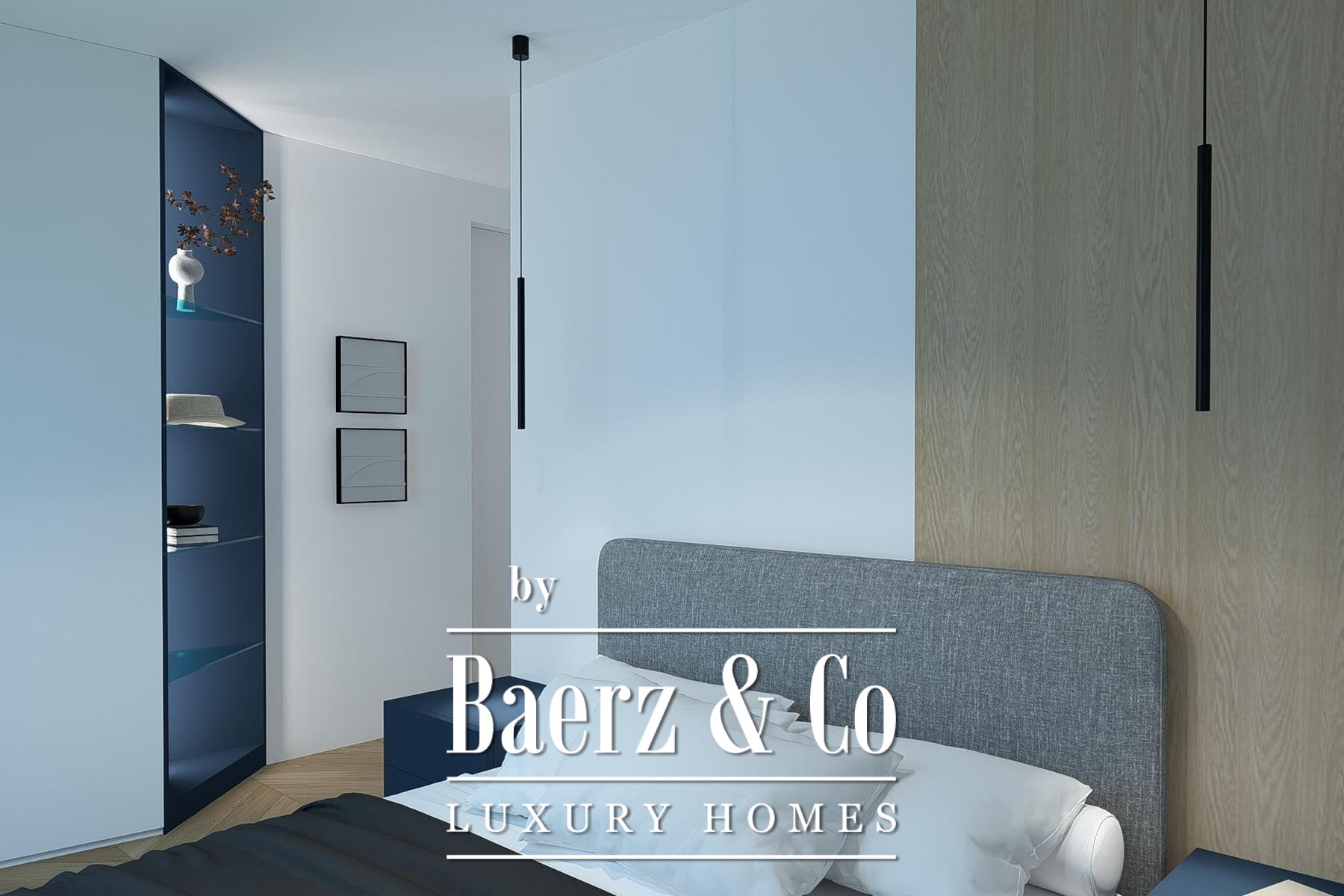 Floor-to-ceiling windows lead to a 15,55 m² terrace featuring a private pool and uninterrupted sea views, while above, a spacious roof terrace provides a sunbathing and barbecue area curated for gatherings or meditative solitude. Every room is equipped with air conditioning and underfloor heating, balancing comfort through the seasons. The building is contemporary with an elevator, private storage, and a garage parking space, designed to the standards of a discreet international clientele.