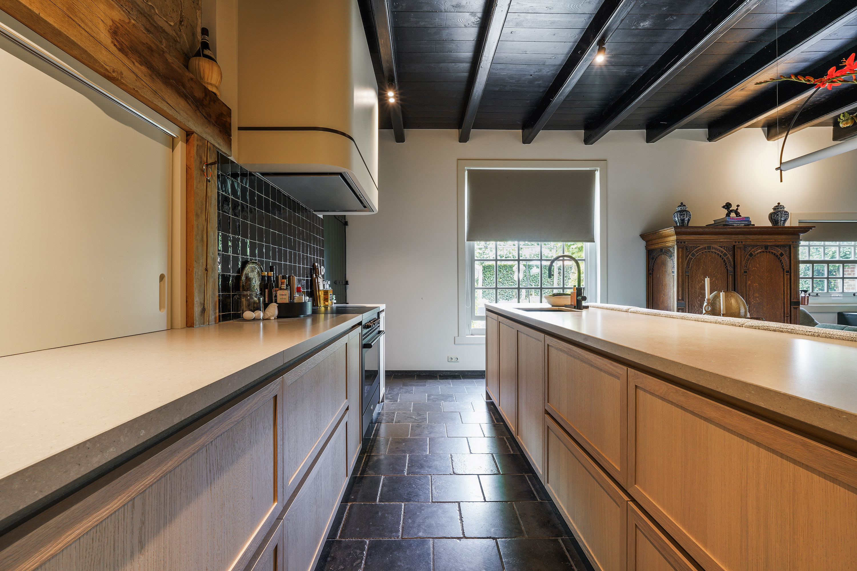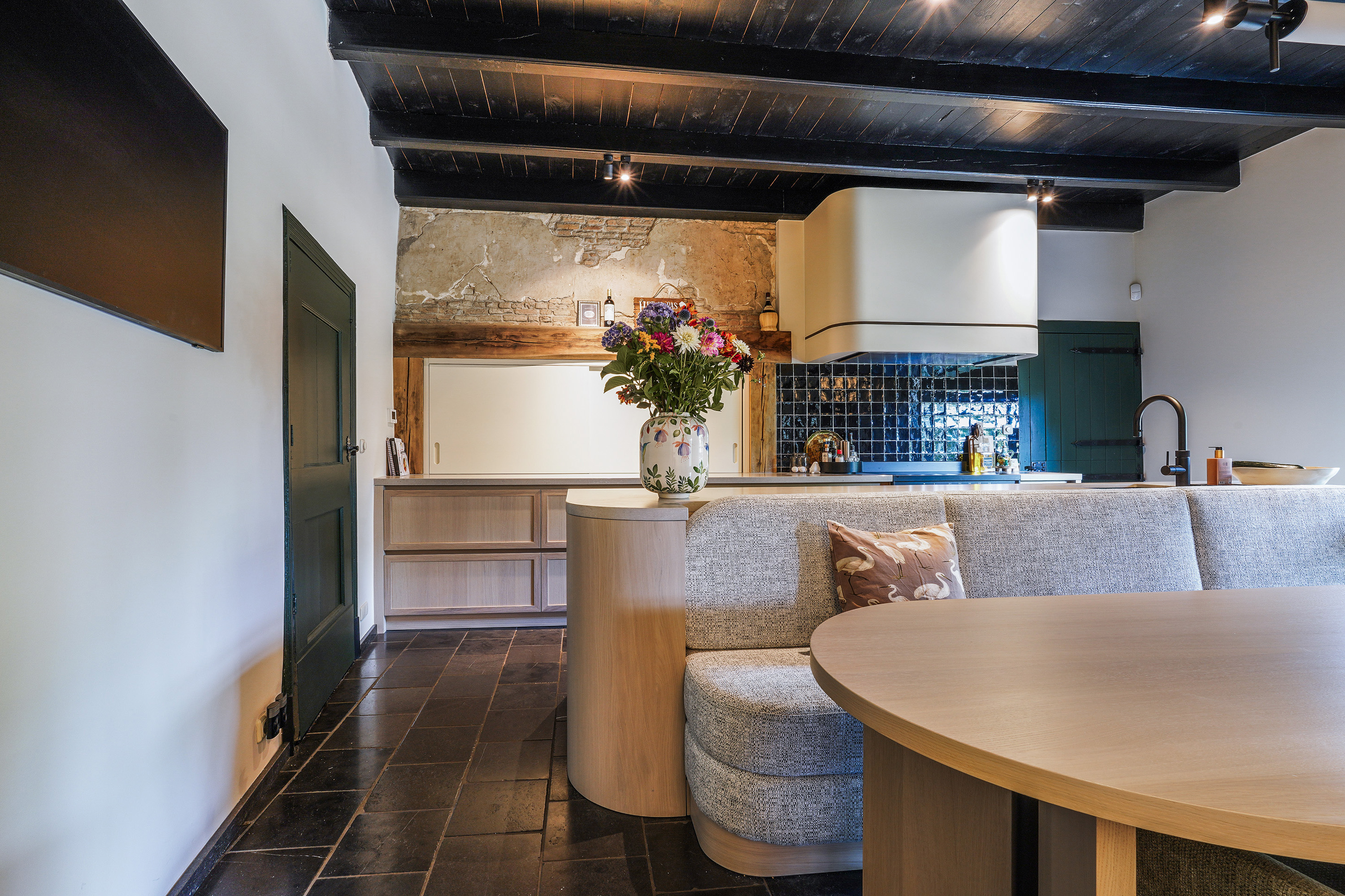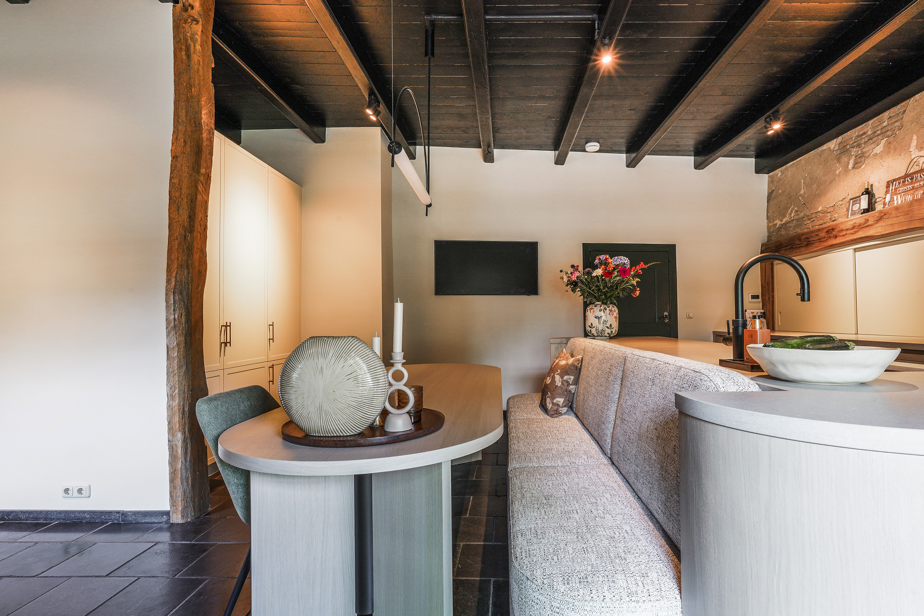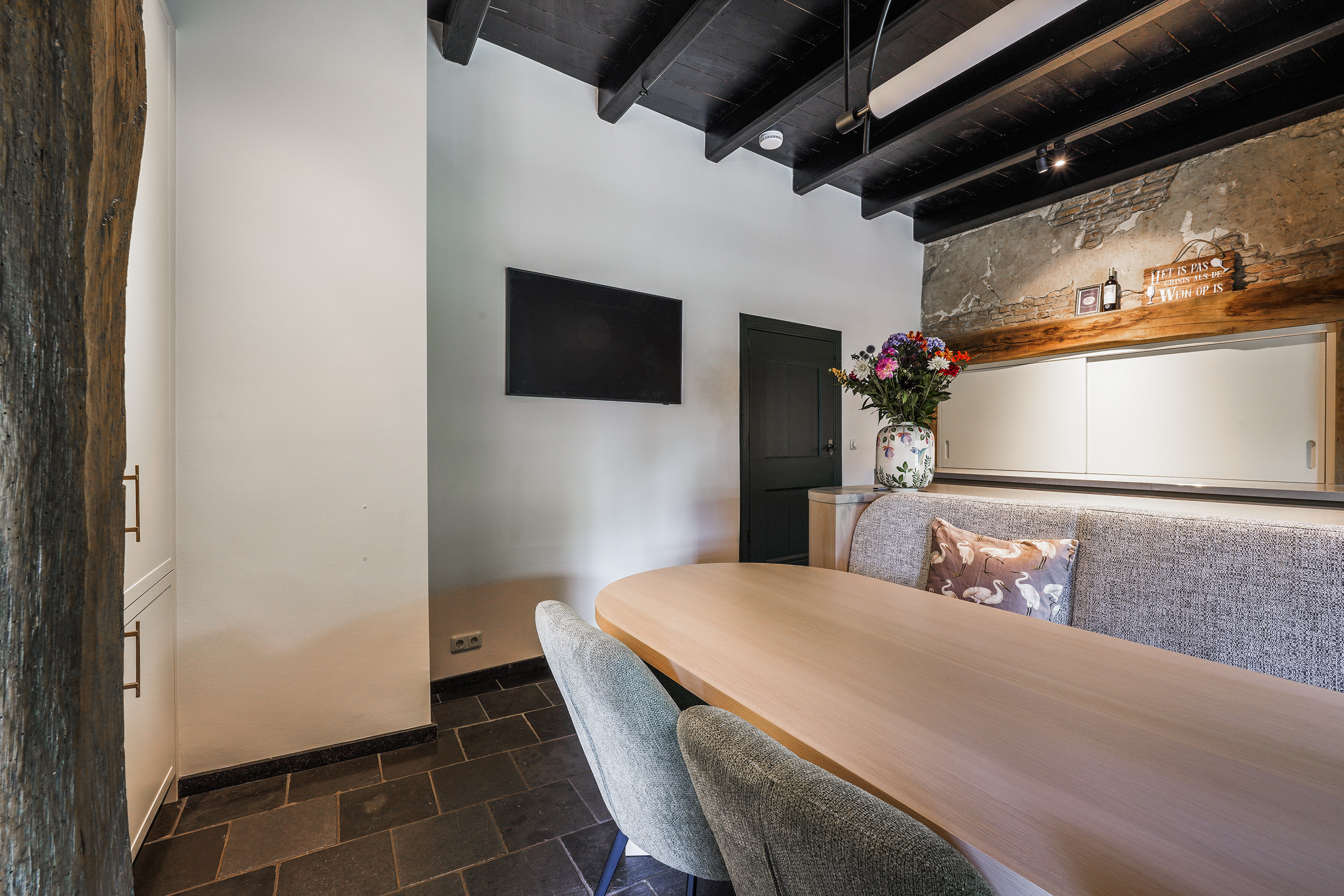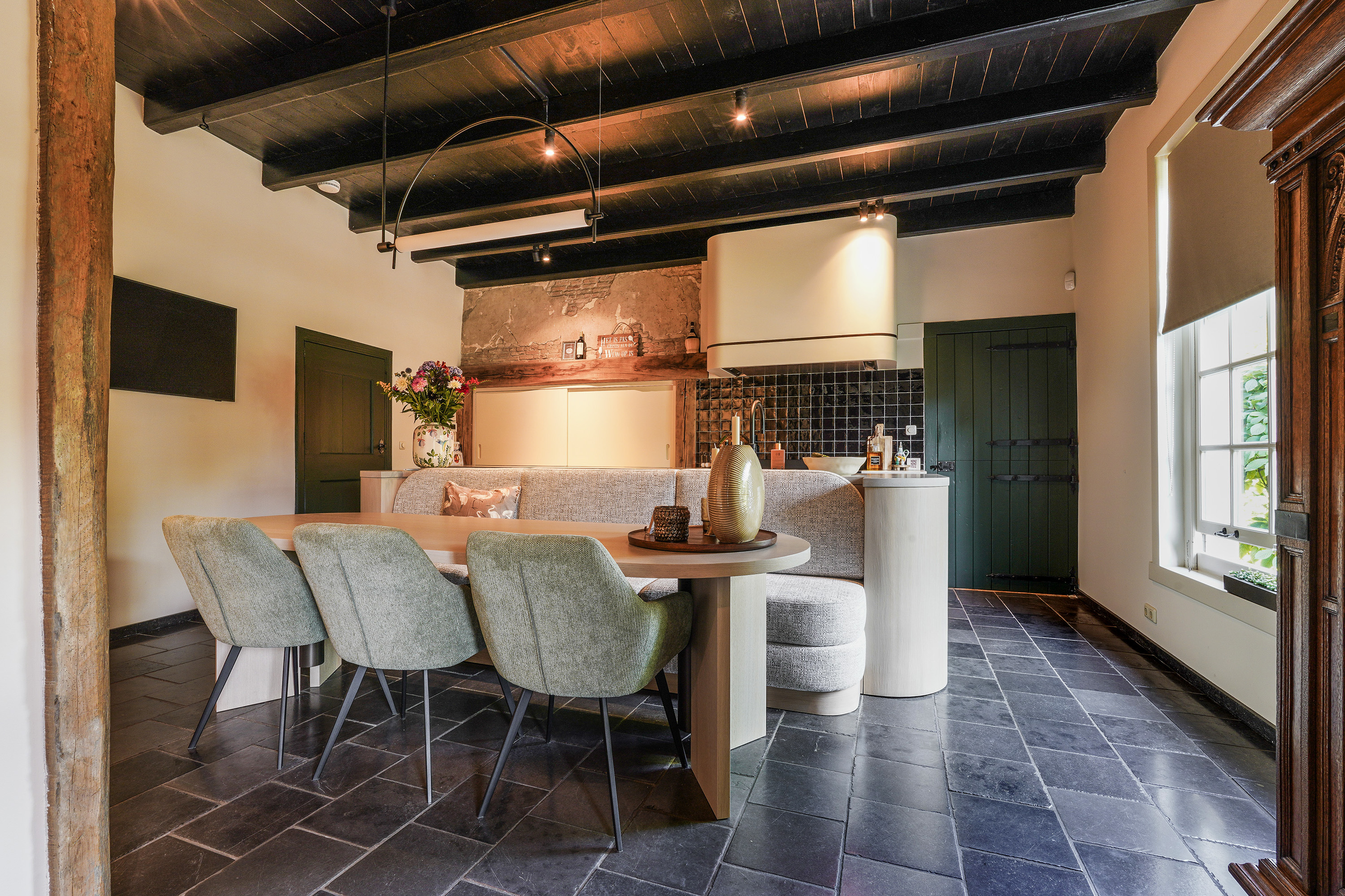 The kitchen forms the heart of the home and offers a beautiful view of the garden. Through the two spacious entrances (at the front and side), you enter directly into this inviting space. In 2024, the kitchen was completely redesigned and installed by Ecker Interieurbouw. The result is a warm, stylish living kitchen equipped with modern appliances, ample work and storage space, custom-made cabinetry, and a thoughtful layout. The long dining bench connects beautifully to the central island, and the bespoke matching dining table easily accommodates a large group. It’s a place where cooking, dining and socialising come together effortlessly — a space where you’ll happily spend hours. A staircase connects the kitchen with the living room on the upper floor.