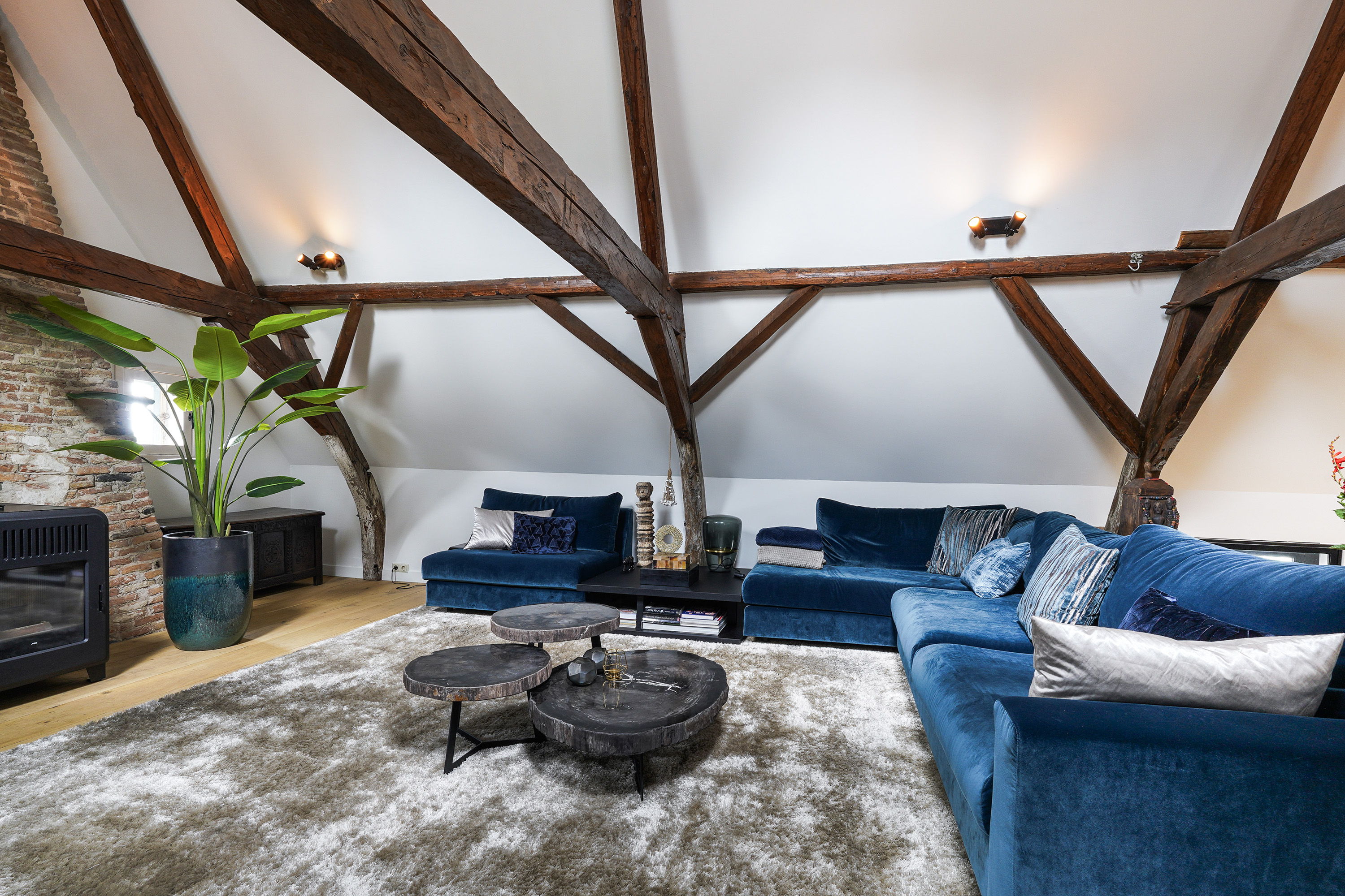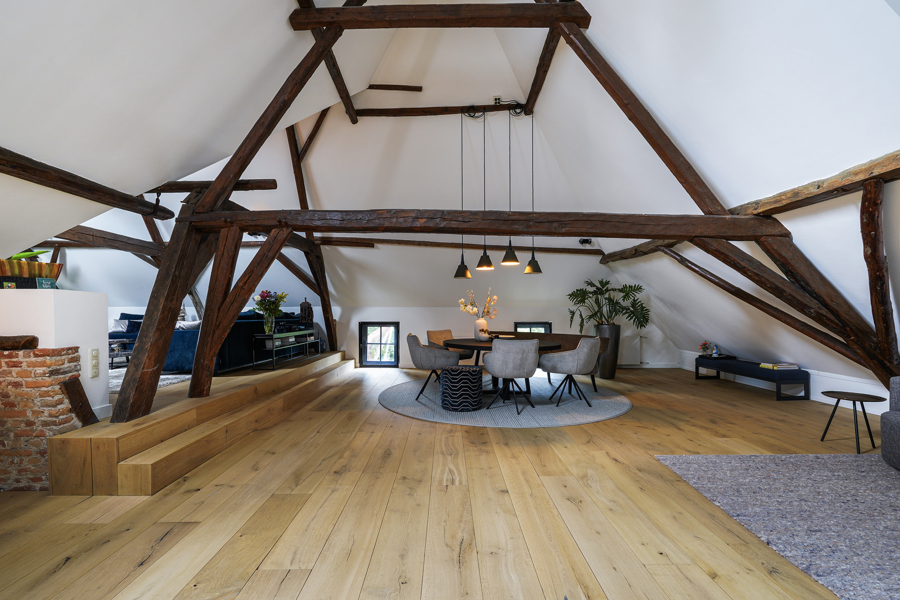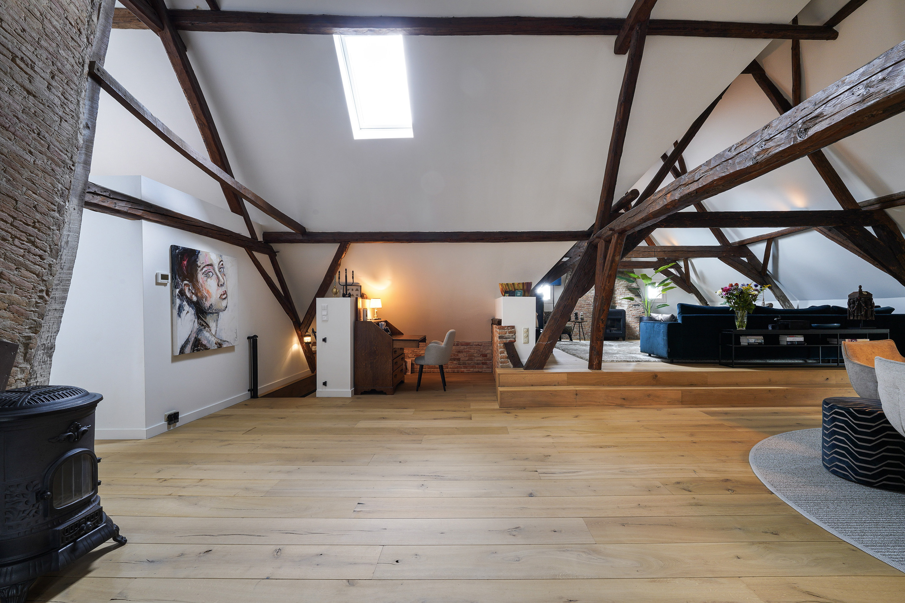 The living room, measuring nearly 90 m², feels even more spacious thanks to the high vaulted ceiling. The roof is insulated and beautifully finished with white plaster between the sturdy wooden beams. Combined with the height differences, the wooden floor and the pellet stove, the result is a living area that feels both grand and inviting.