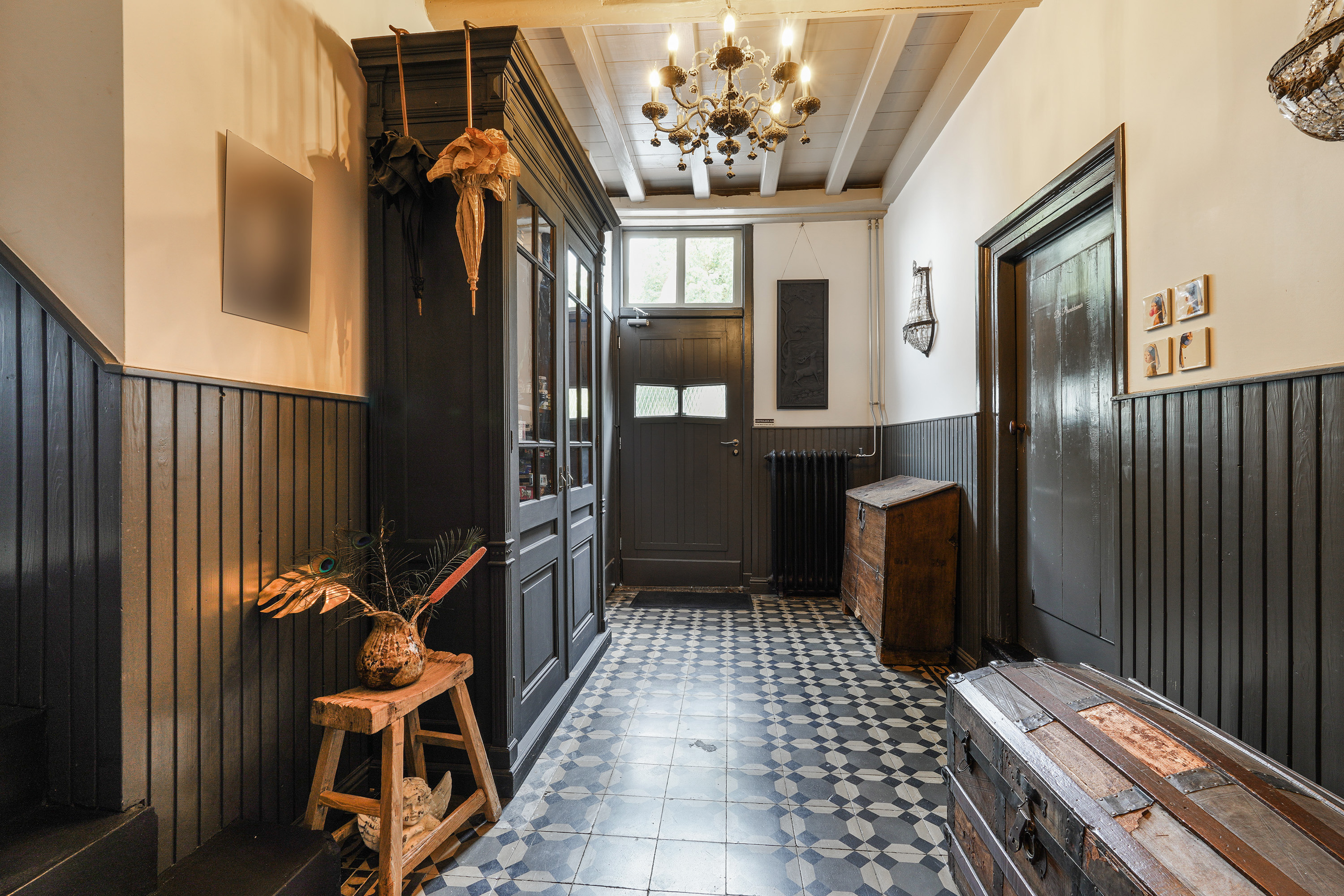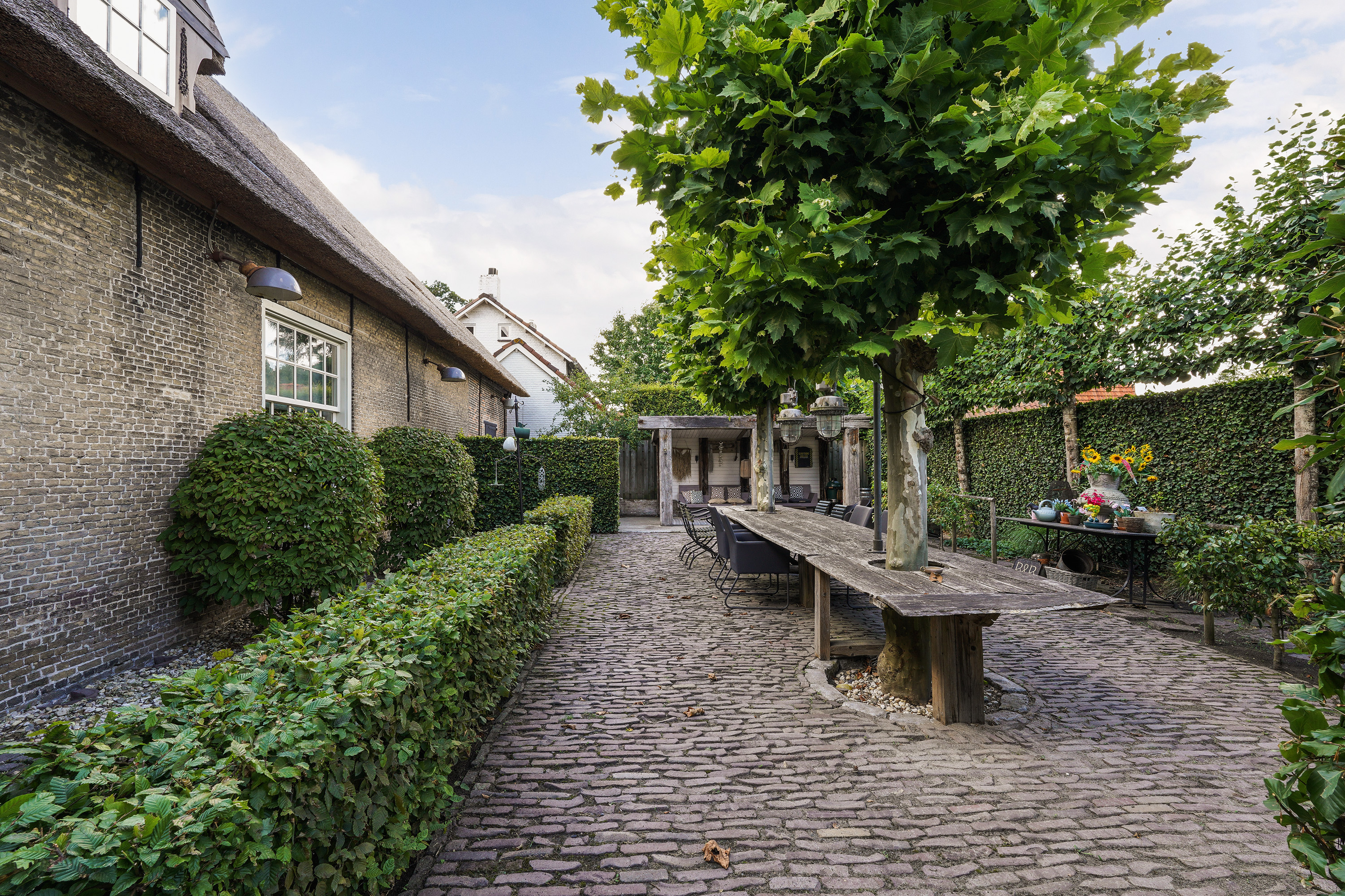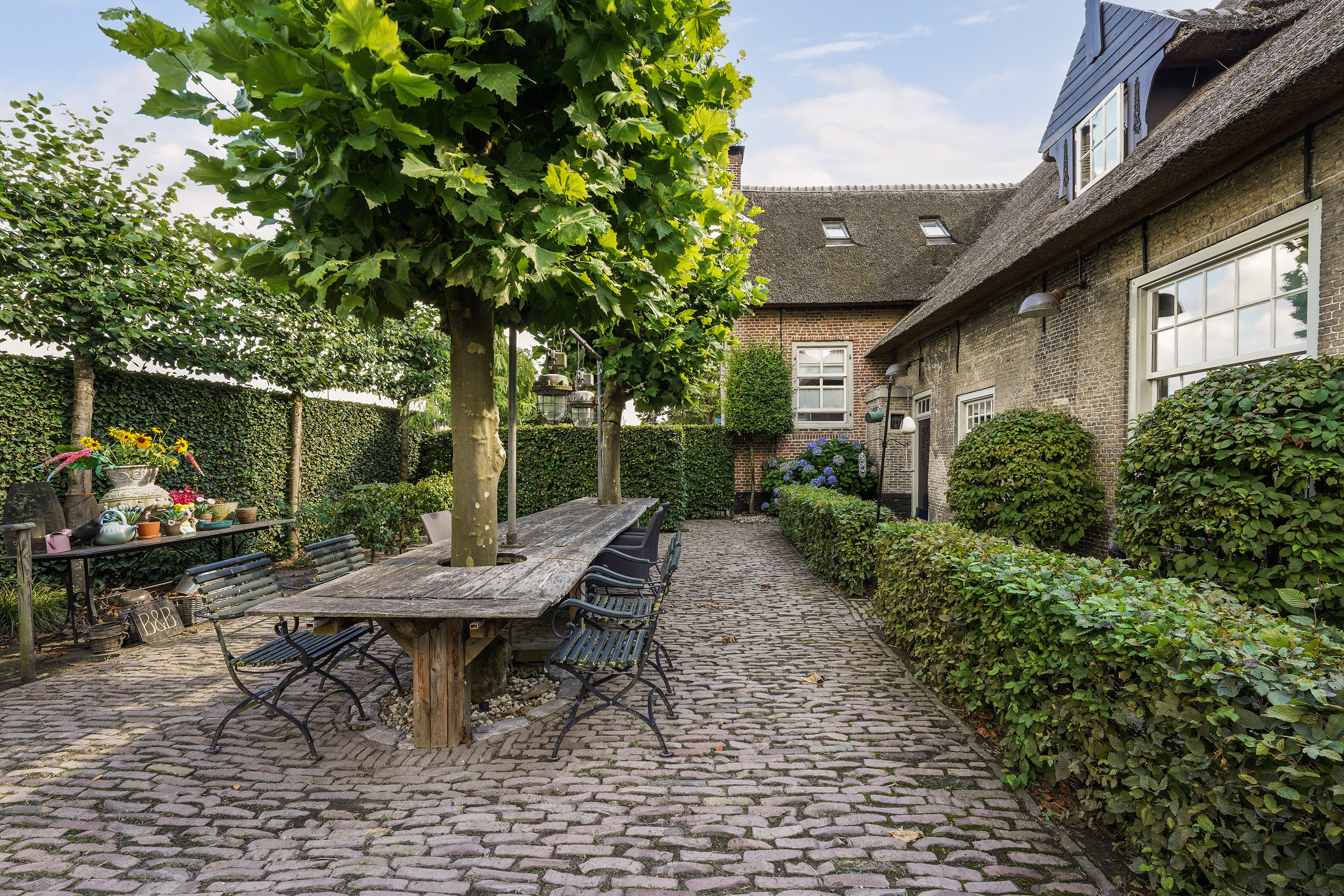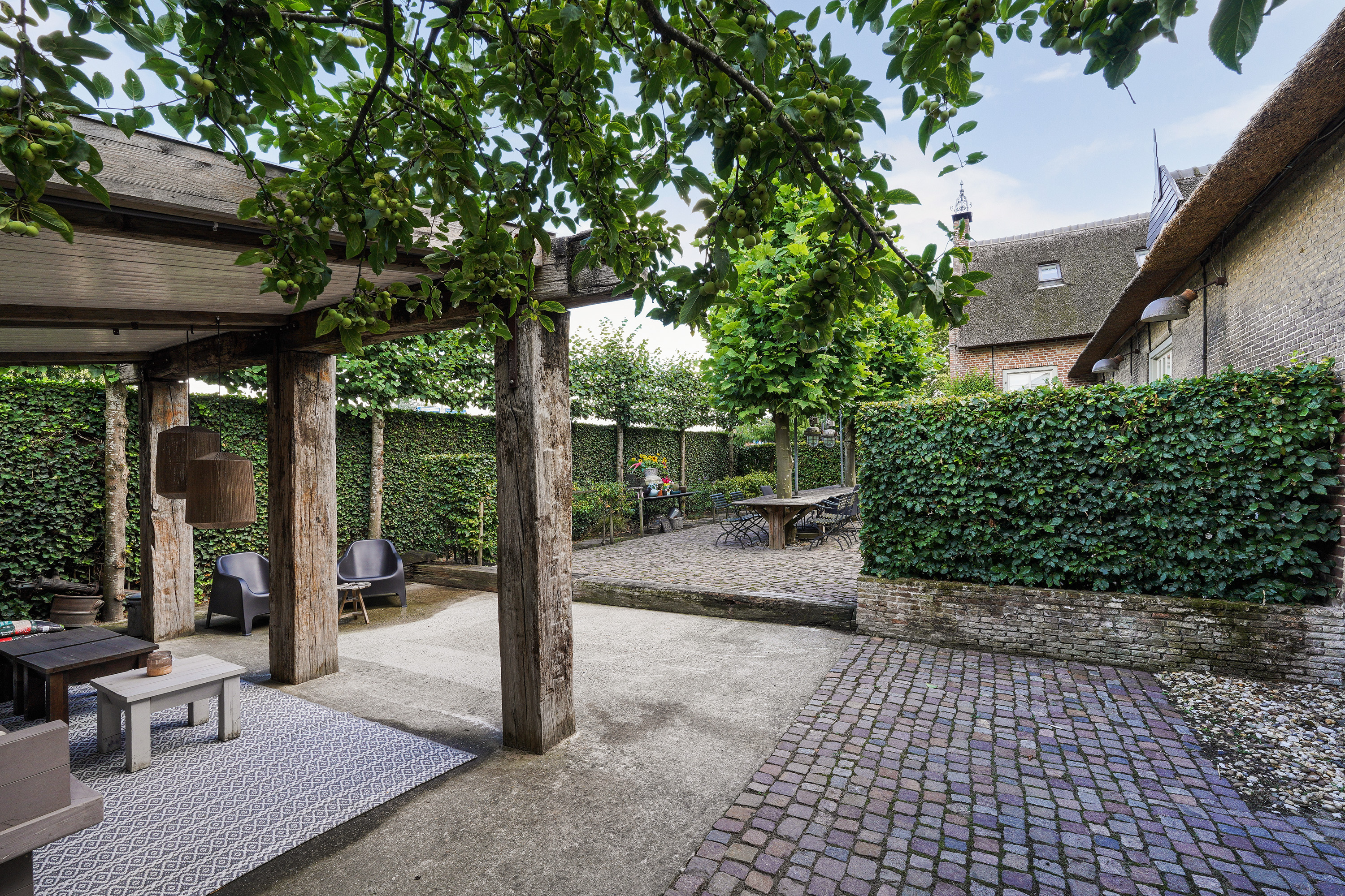 The rear garden is a true oasis of greenery, offering sunshine, privacy and ample space to relax. Whether you love gardening, dining outdoors or simply enjoying the peace and quiet — here, it’s all possible. The garden perfectly complements the historic appearance of the property, featuring cobblestones, dense hedges, mature trees and perennial plants. At the back of the garden stands a sturdy wooden canopy — a sheltered spot with a beautiful view across the entire garden. At the front, there is ample private parking.