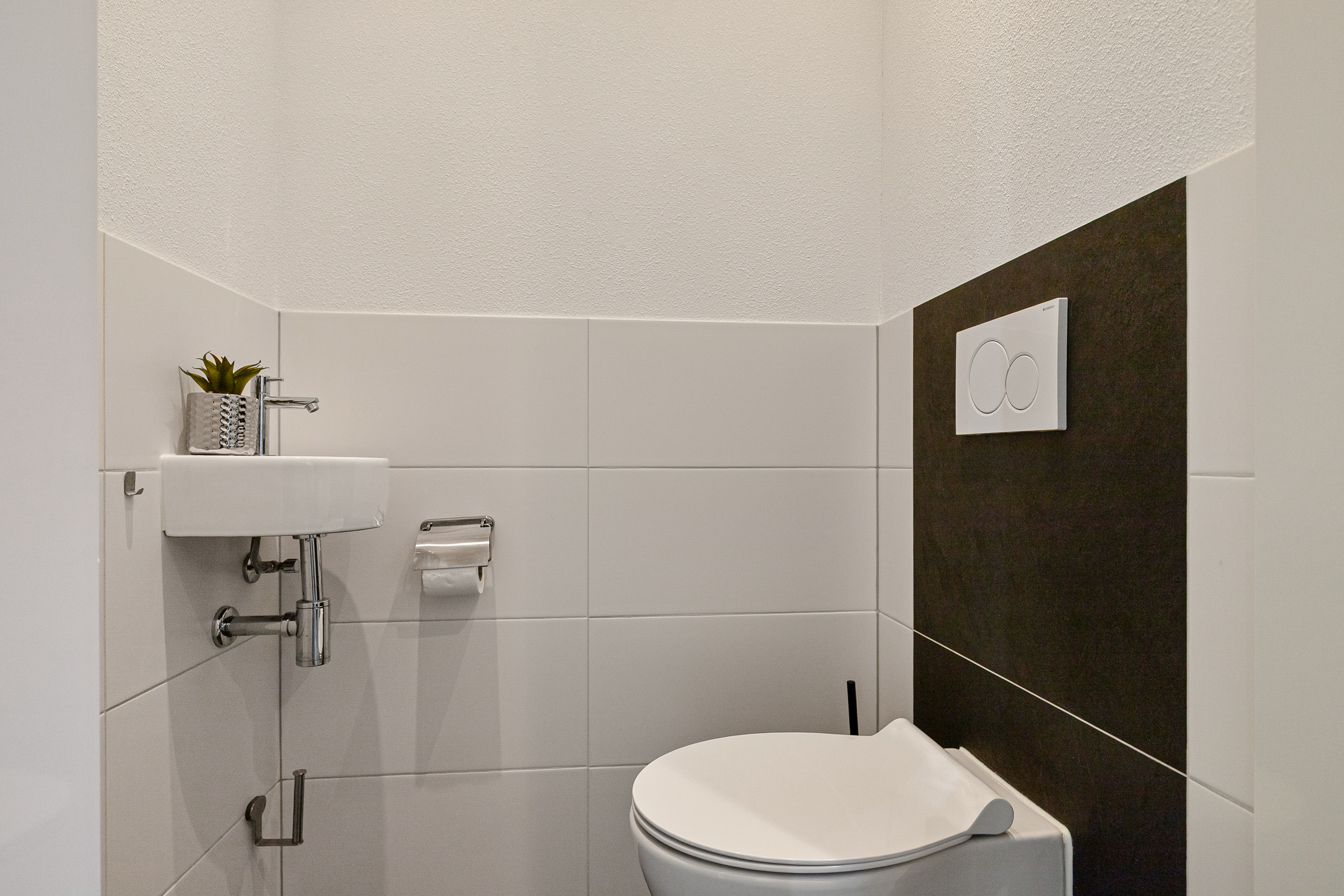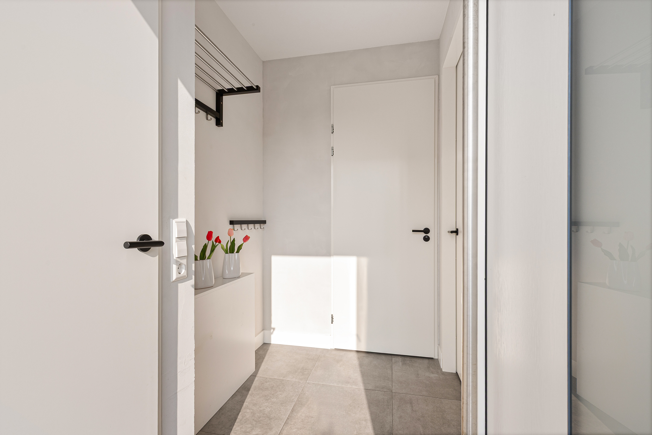 Lichte entree, hal met meterkast en modern royaal toilet.