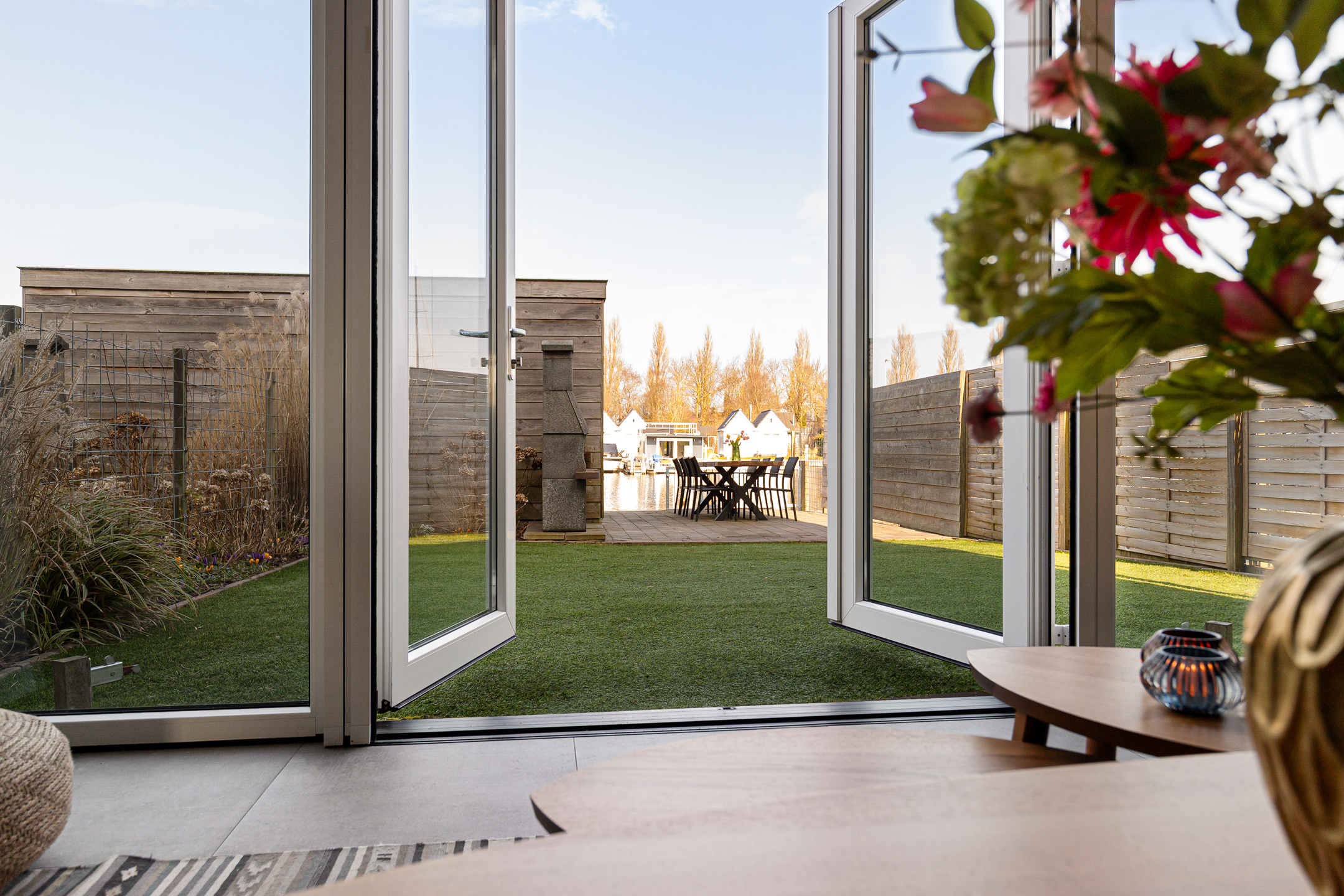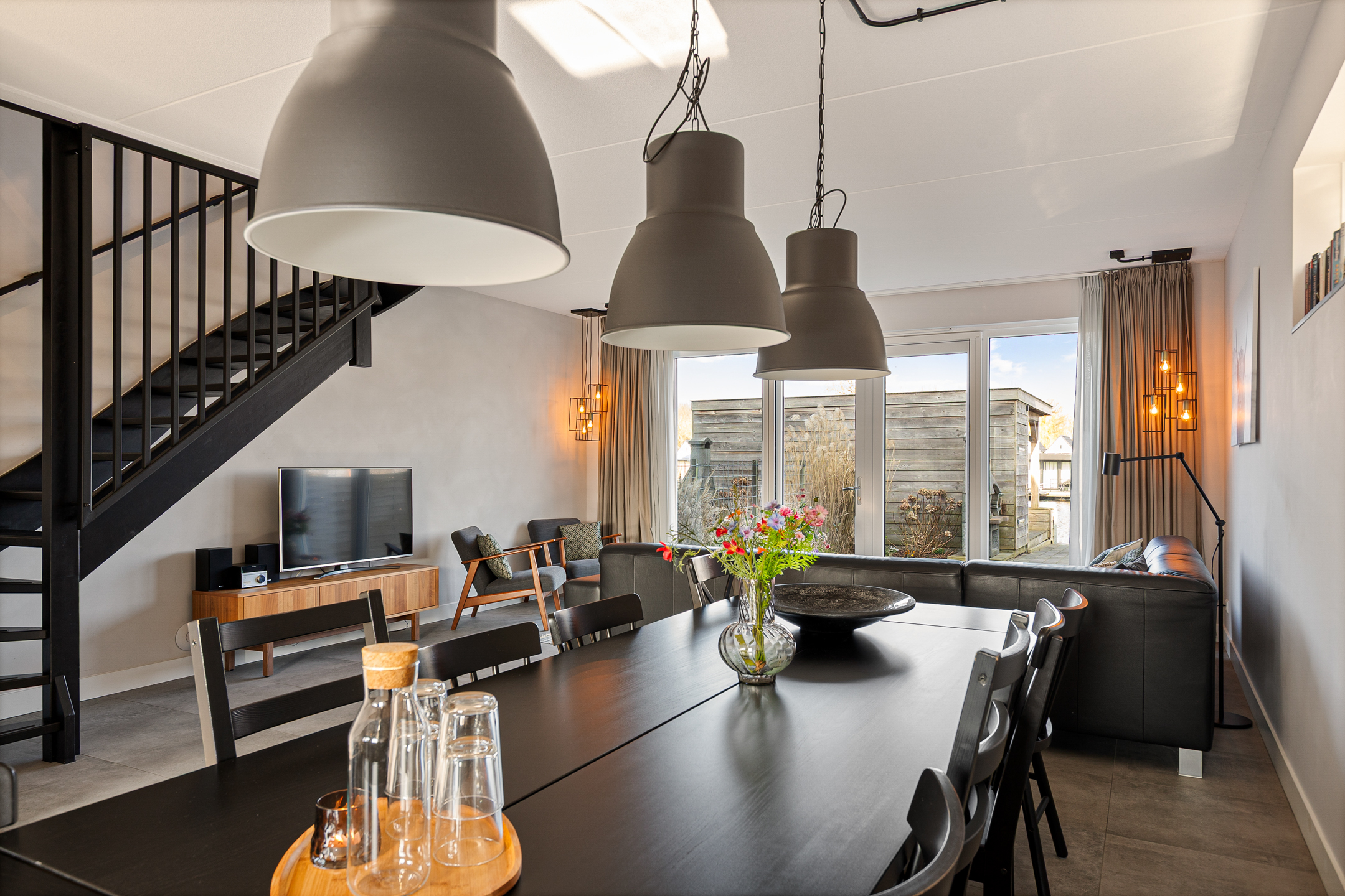 De ruime en lichte woonkamer is gesitueerd aan de achterzijde en biedt door de grote raampartijen een prachtig uitzicht over de tuin en het water. Openslaande deuren zorgen voor een directe verbinding met het terras en de steiger.